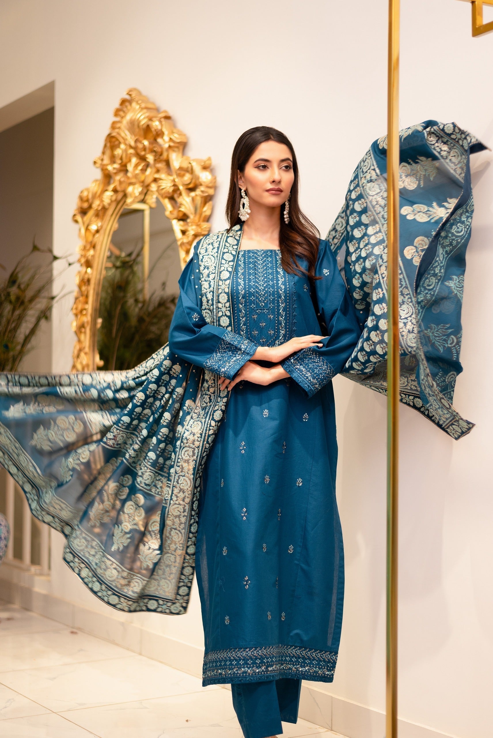 The combination of resham and sequin embellishments on this vibrant color, paired with a ravishingly heavy block-printed silk dupatta makes this article come to life with a bold yet graceful touch. Ideal for evening parties, this outfit guarantees you??l leave a lasting impression.