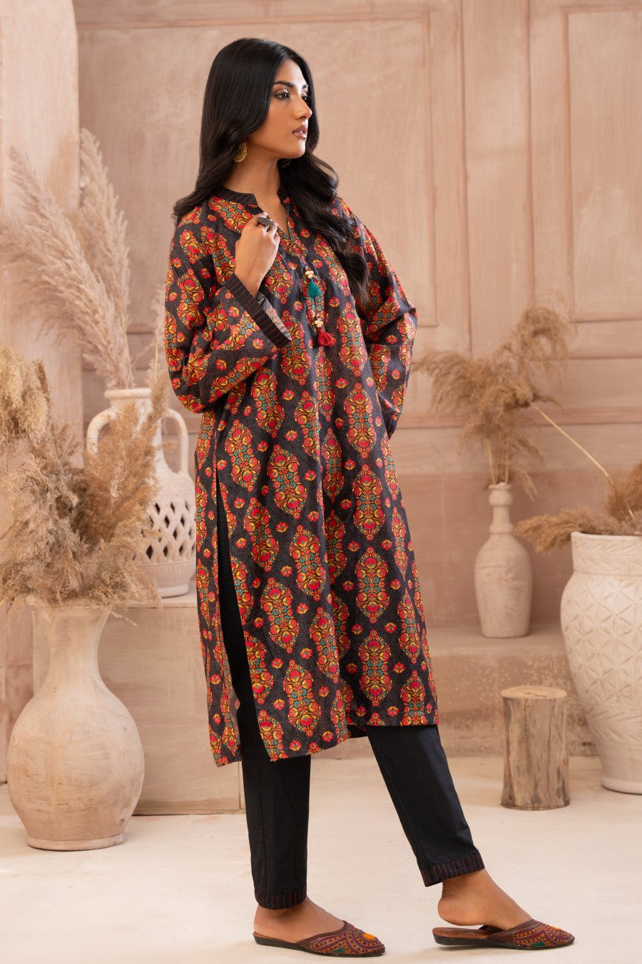 Dark Eden this contemporary yet classy design is portrayed on this graceful ensemble rendered in an appealing vibrant shade. Digital printed lawn shirt featuring a ban collar with buttons, straight hemline and straight sleeves. These are paired with a plain trouser.
