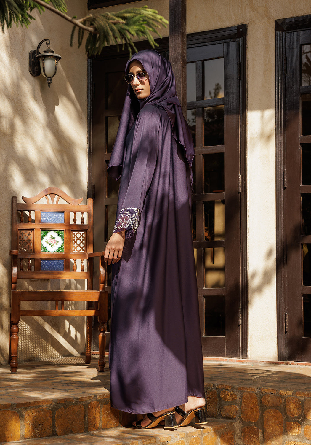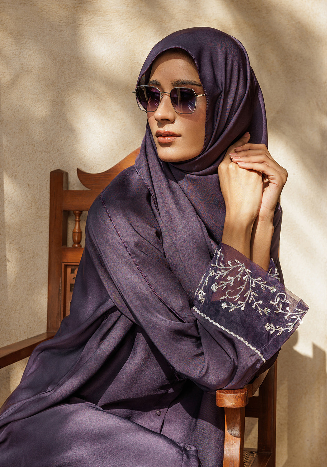 This elegant abaya features luxurious Nida fabric, offering a smooth and comfortable drape. The standout detail is the intricate Dapka work adorning the sleeves, adding a refined touch of craftsmanship. Perfect for those seeking a sophisticated and graceful look, this purple abaya combines timeless style with subtle embellishment.