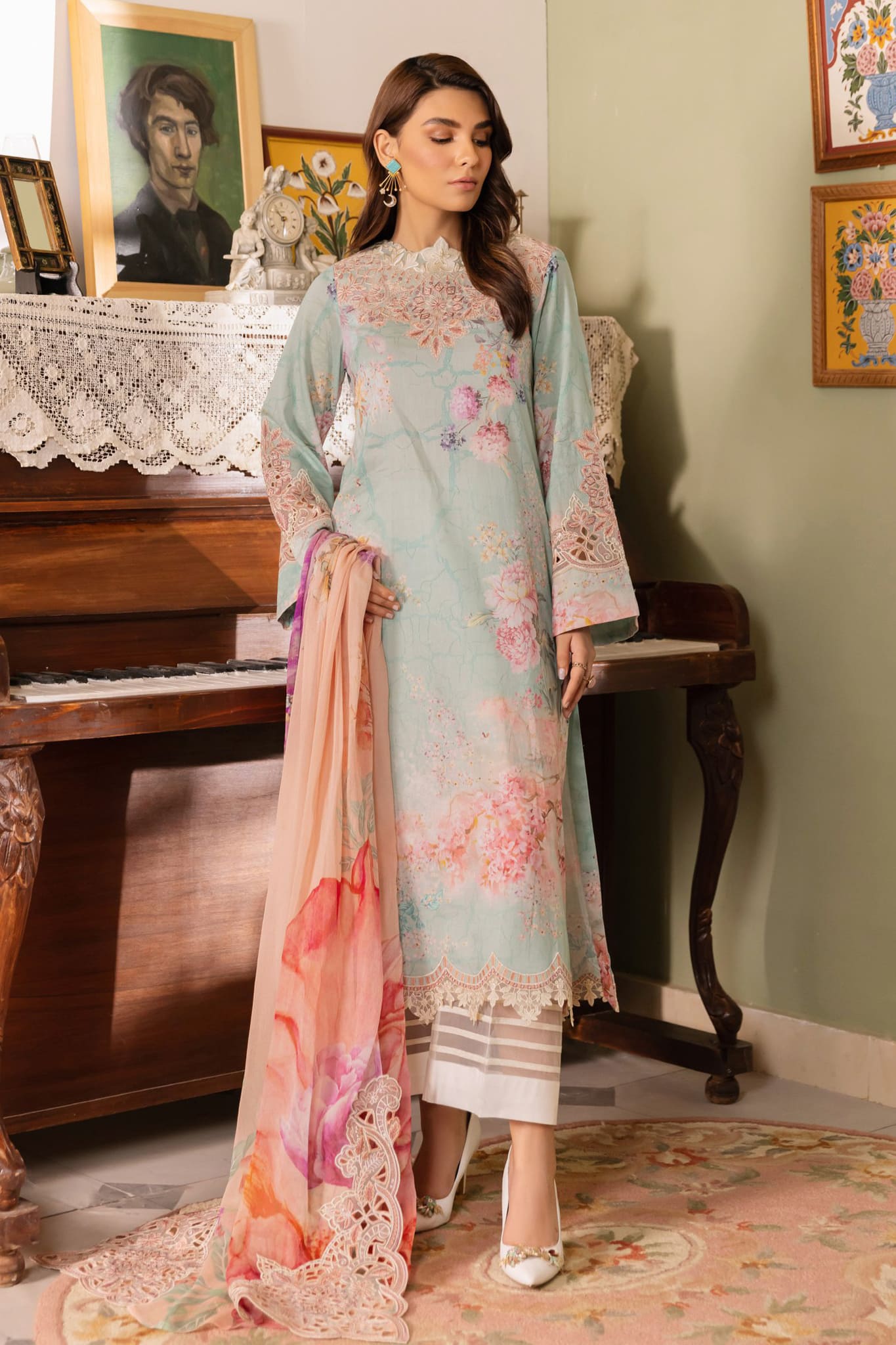 Shirt Front, Back & Sleeves: Printed Lawn (3.25 M) Neckline 1: Embroidered Organza (1 Piece) Neckline 2: Embroidered Organza (1...