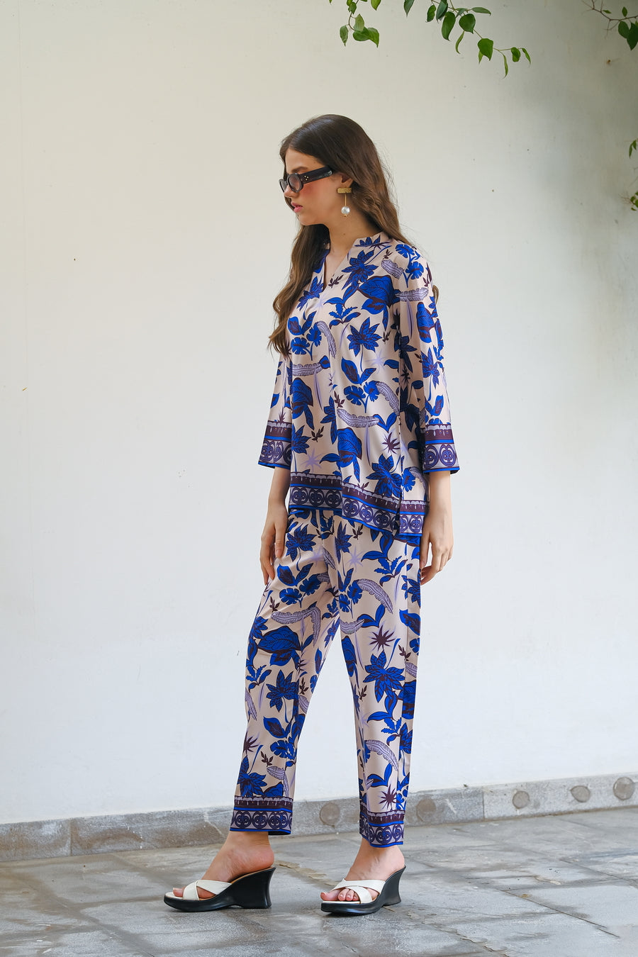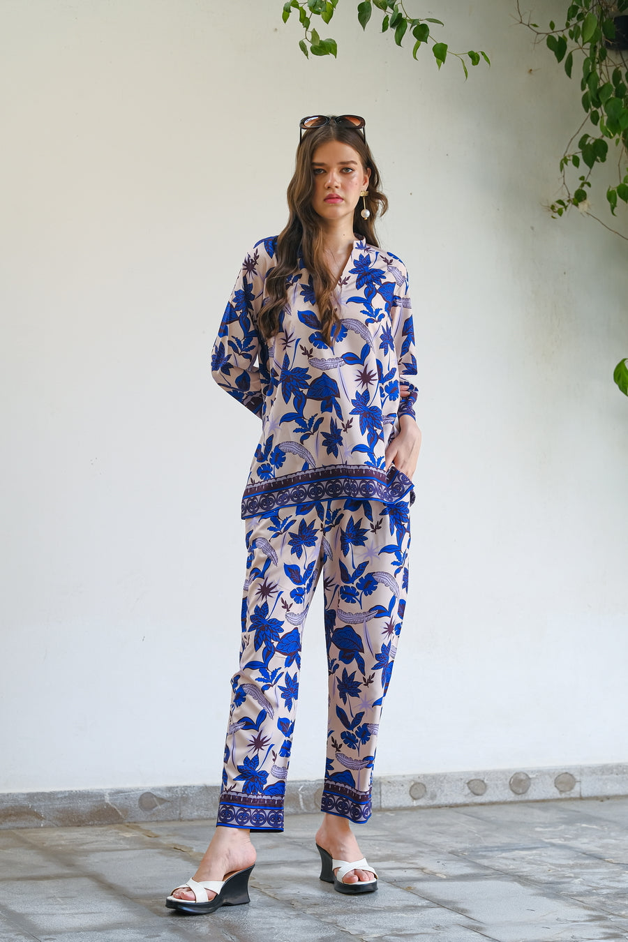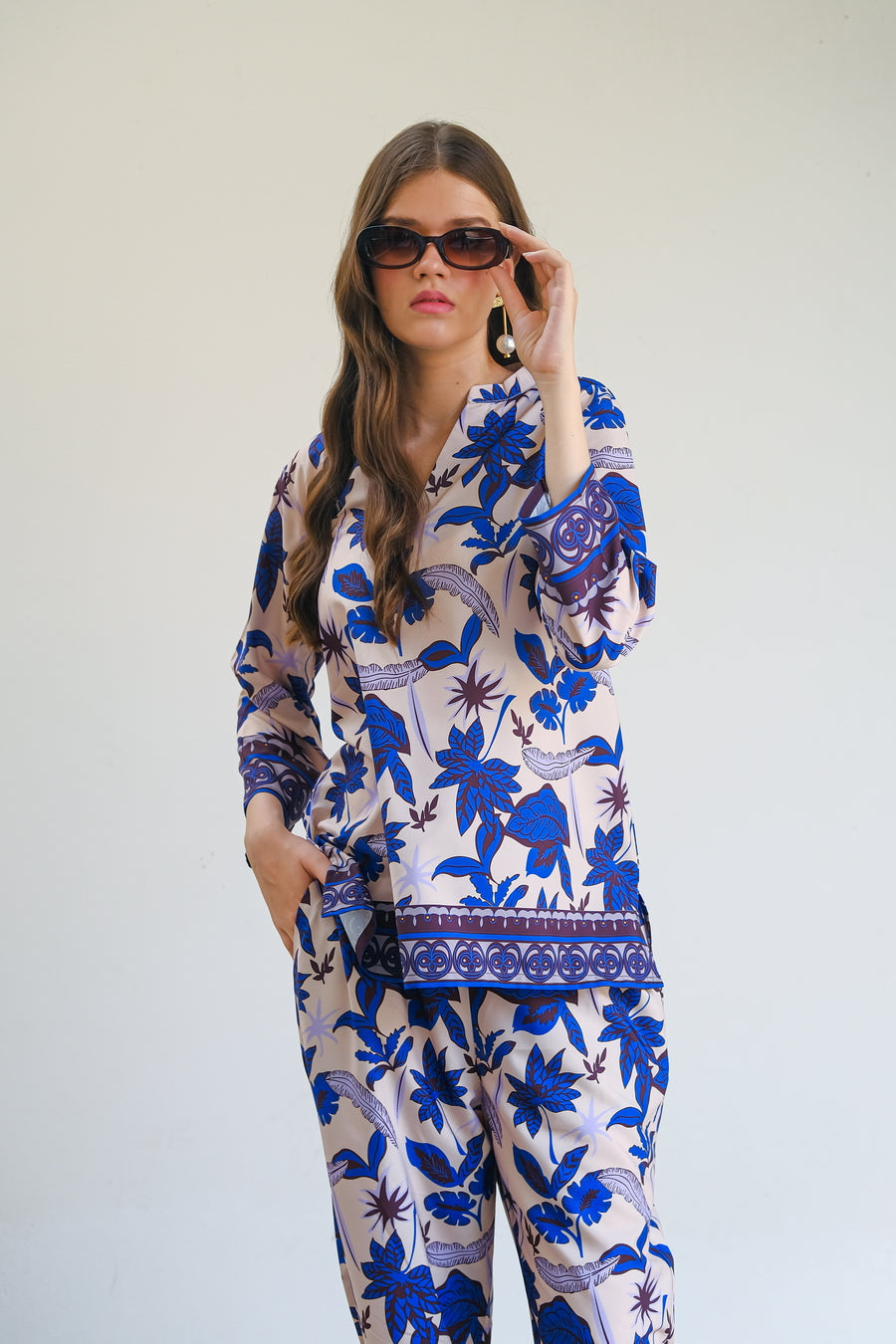 Introducing our "Daydream" two-piece set in luxurious crepe. This ensemble features a long-sleeve shirt and matching trousers, both adorned with a delicate floral print in white and blue. The lightweight, breathable fabric ensures all-day comfort while the elegant design brings a touch of sophistication to your summer wardrobe. Perfect for beachside strolls or garden gatherings, this set blends style and ease, making it a versatile choice for any sunny occasion.