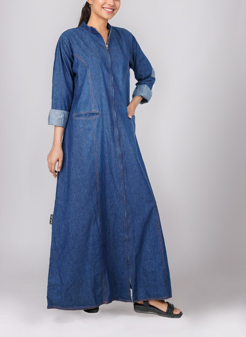 Introducing the Front-Open Zipper Denim Abaya, a stylish and versatile addition to any wardrobe. This long-length denim abaya features a sophisticated mandarin collar and full-length sleeves, ensuring both elegance and comfort. Designed with practicality in mind, it includes welting pockets for convenience. This abaya combines durability with a contemporary aesthetic, perfect for various occasions.