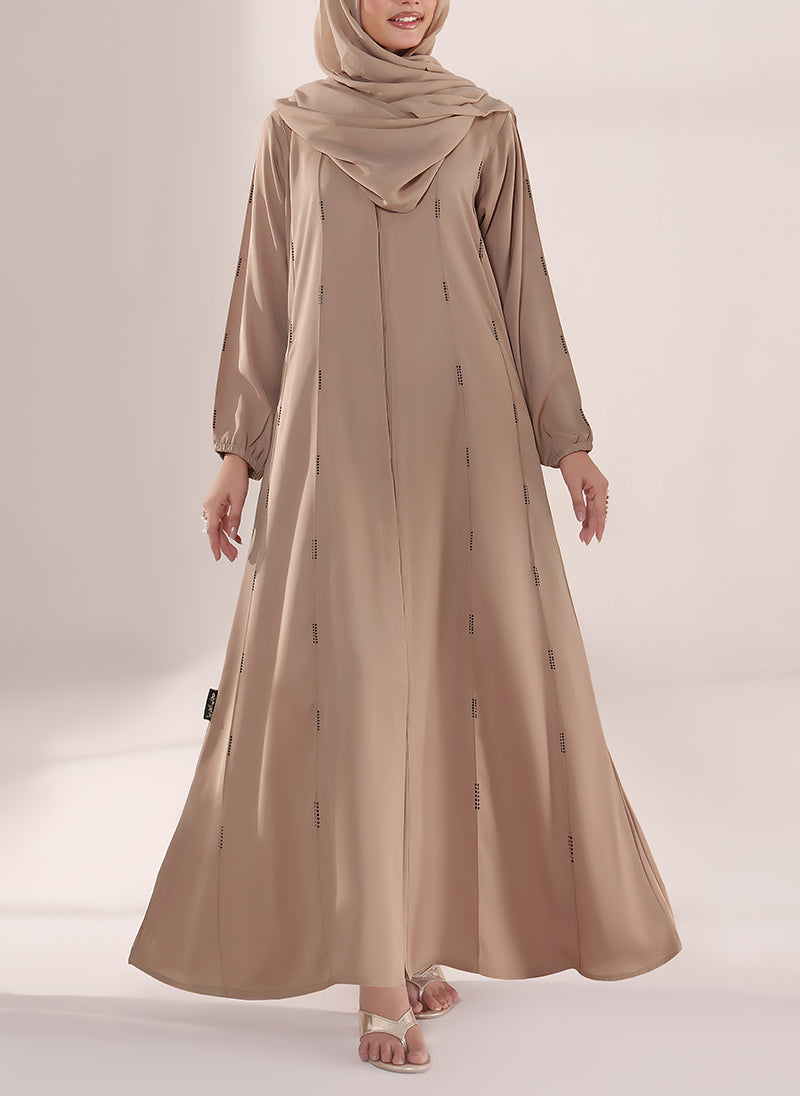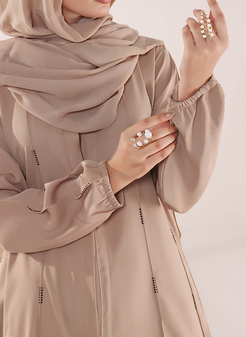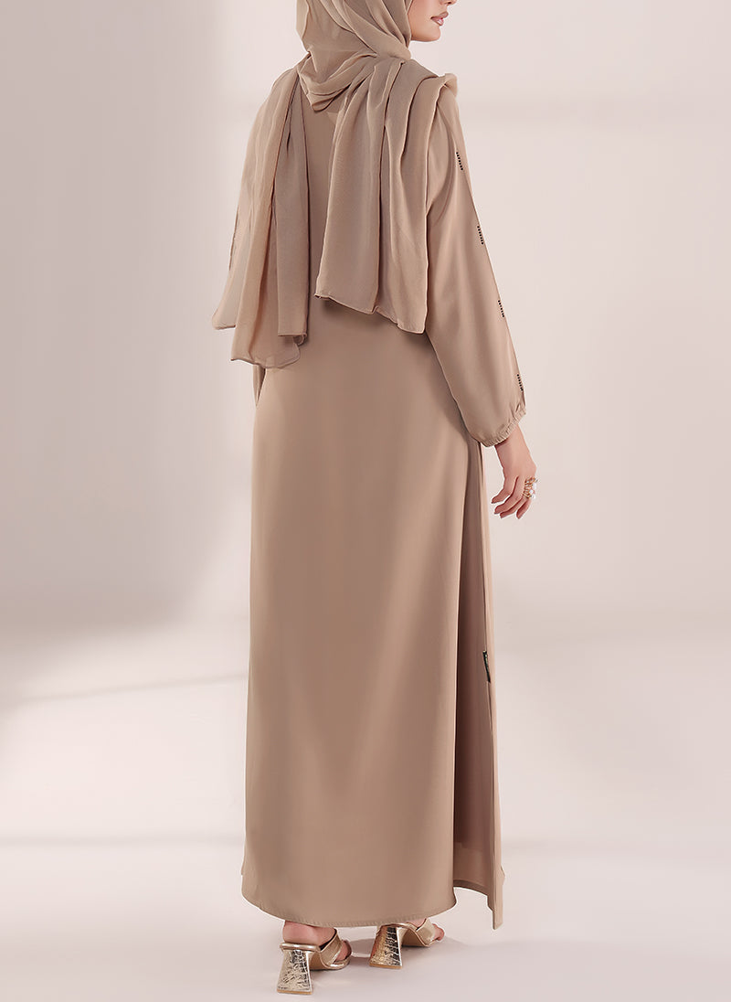Experience refined elegance with Hijab ul Hareem?s Desert Glow Stone Work Abaya, crafted from premium Nida fabric. The soft beige tone and delicate stone embellishments create a graceful and sophisticated modest look.