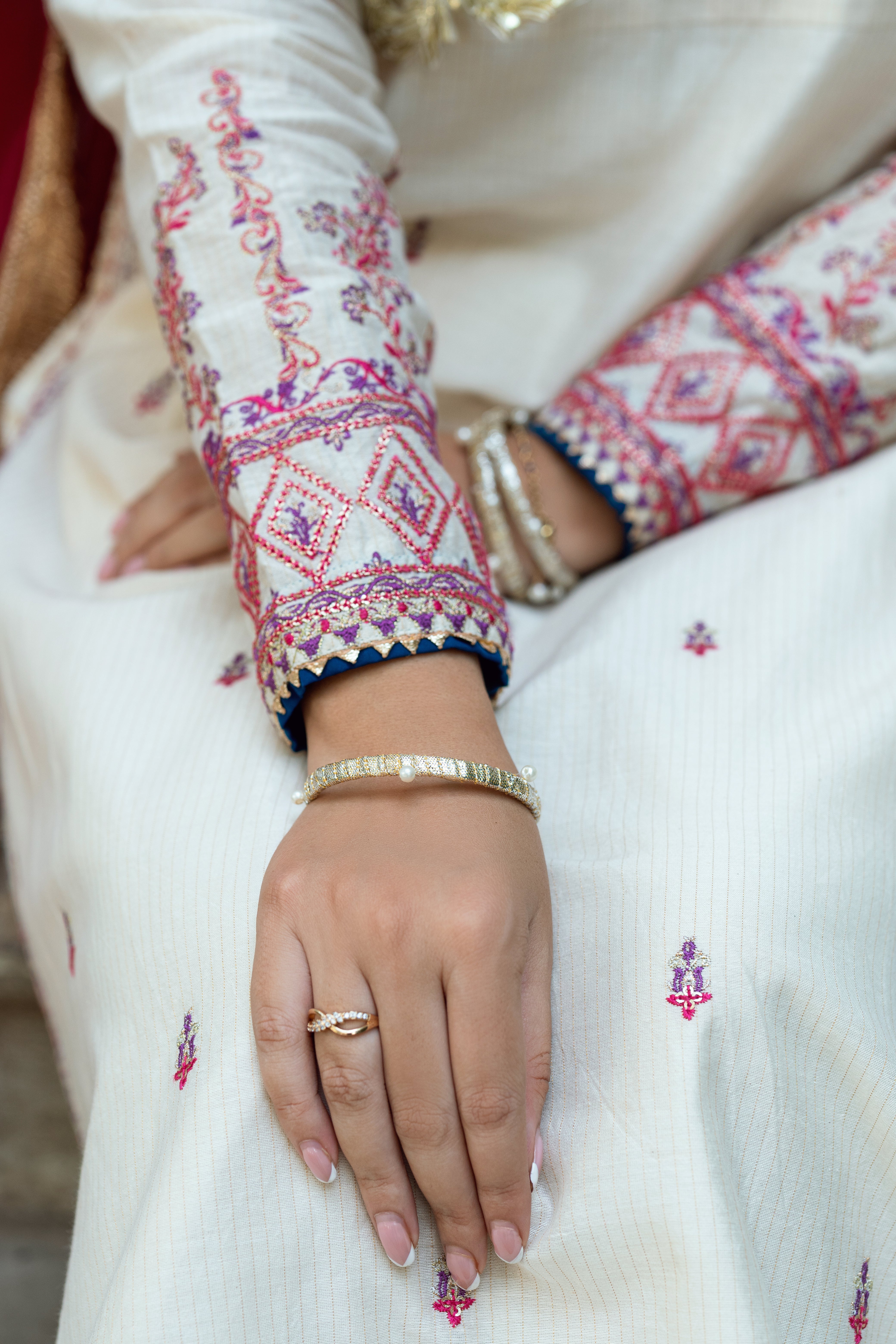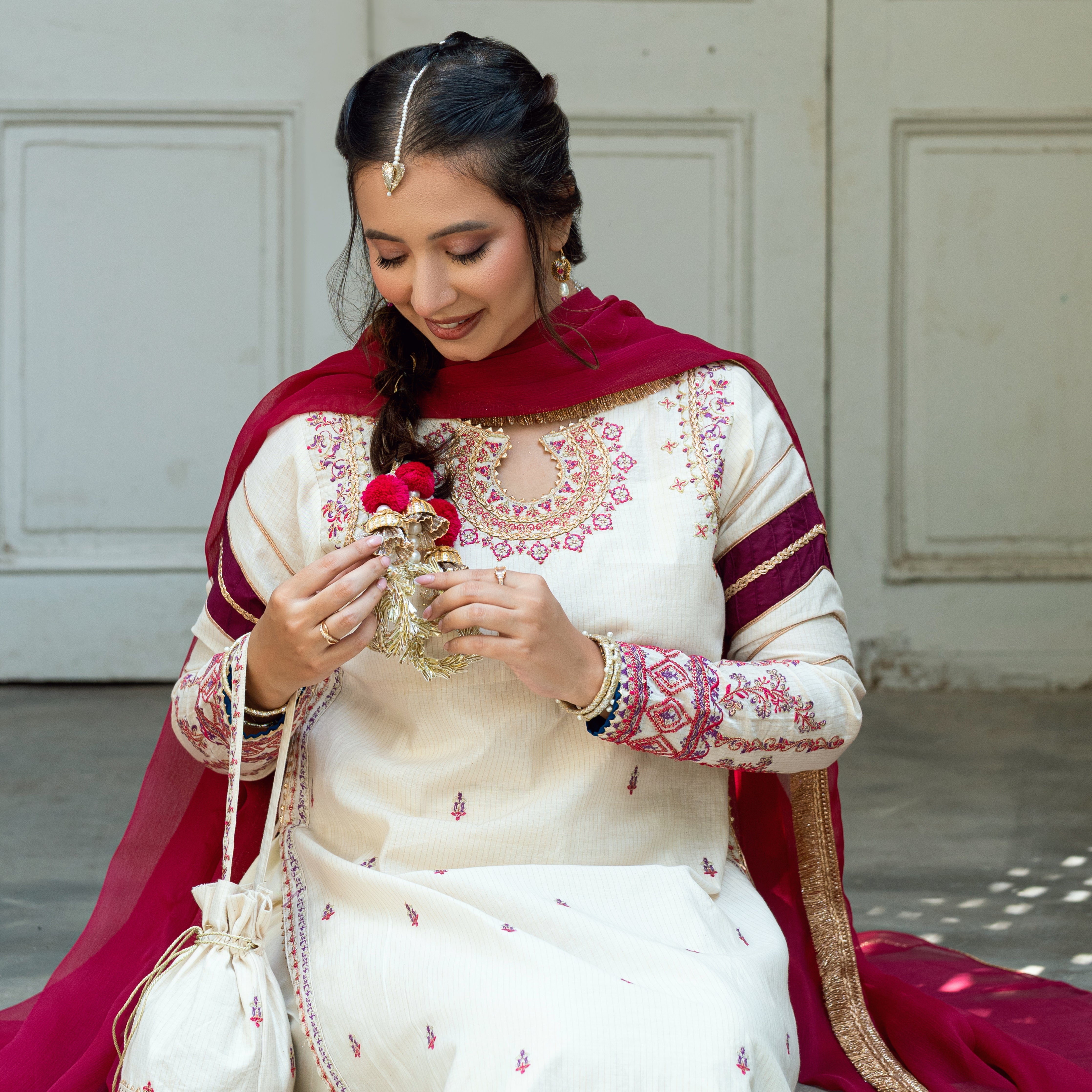 Dupatta: Contrasting hot pink chiffon dupatta with kiran and gota details.