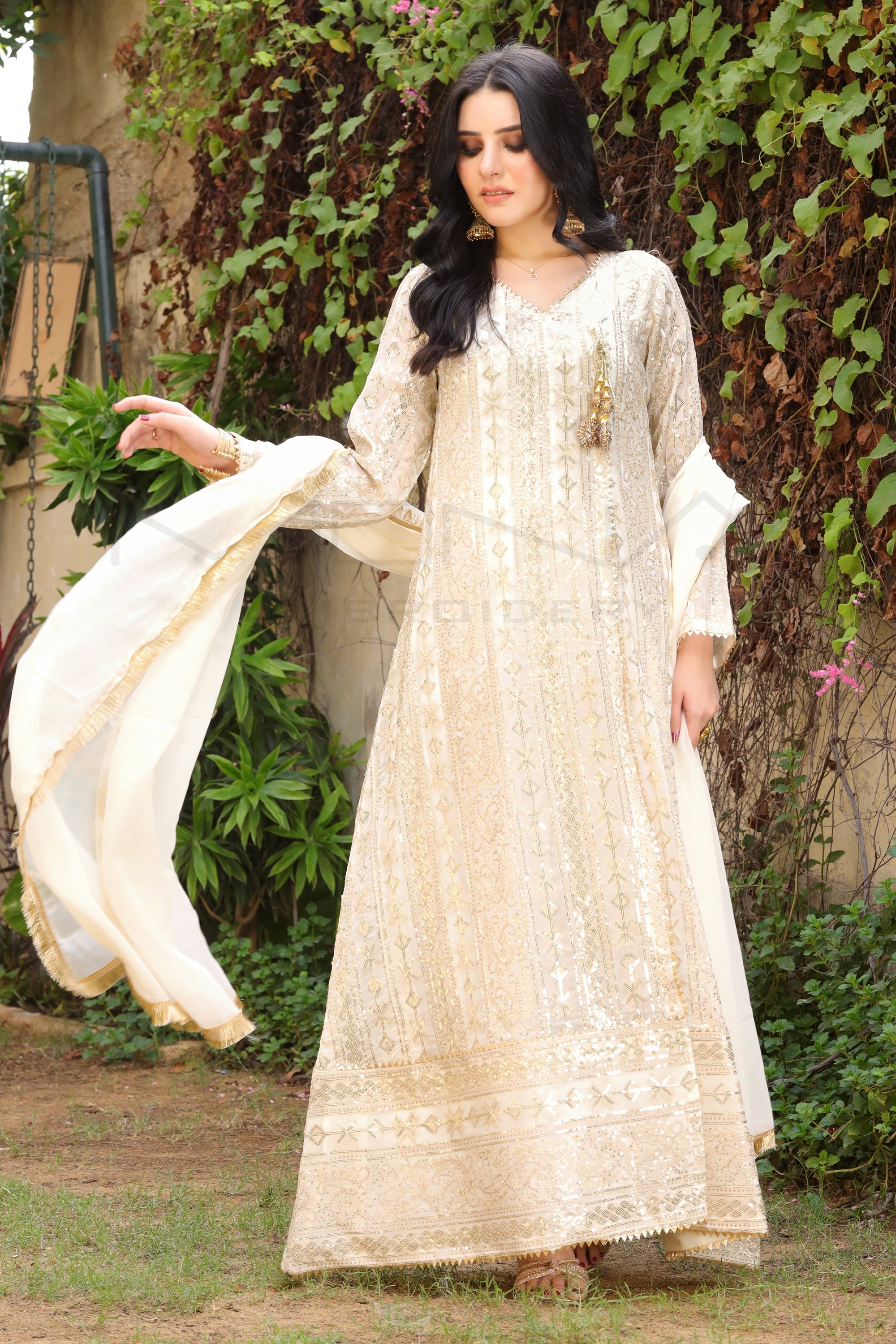 The exquisite embroidered work in vertical patterns of the angrakha, which exudes grace and elegance, is a marvel of craftsmanship and design. The designer's exquisite use of the zari, sitara, and sequin embroidery technique enhances this lovely dress. The wide border of the angrakha at the end reflects the fine craftsmanship. A gorgeous chiffon dupatta with a kiran lace border completes the ensemble. Make use of Mona Embroidery to showcase your individual style and embrace it.