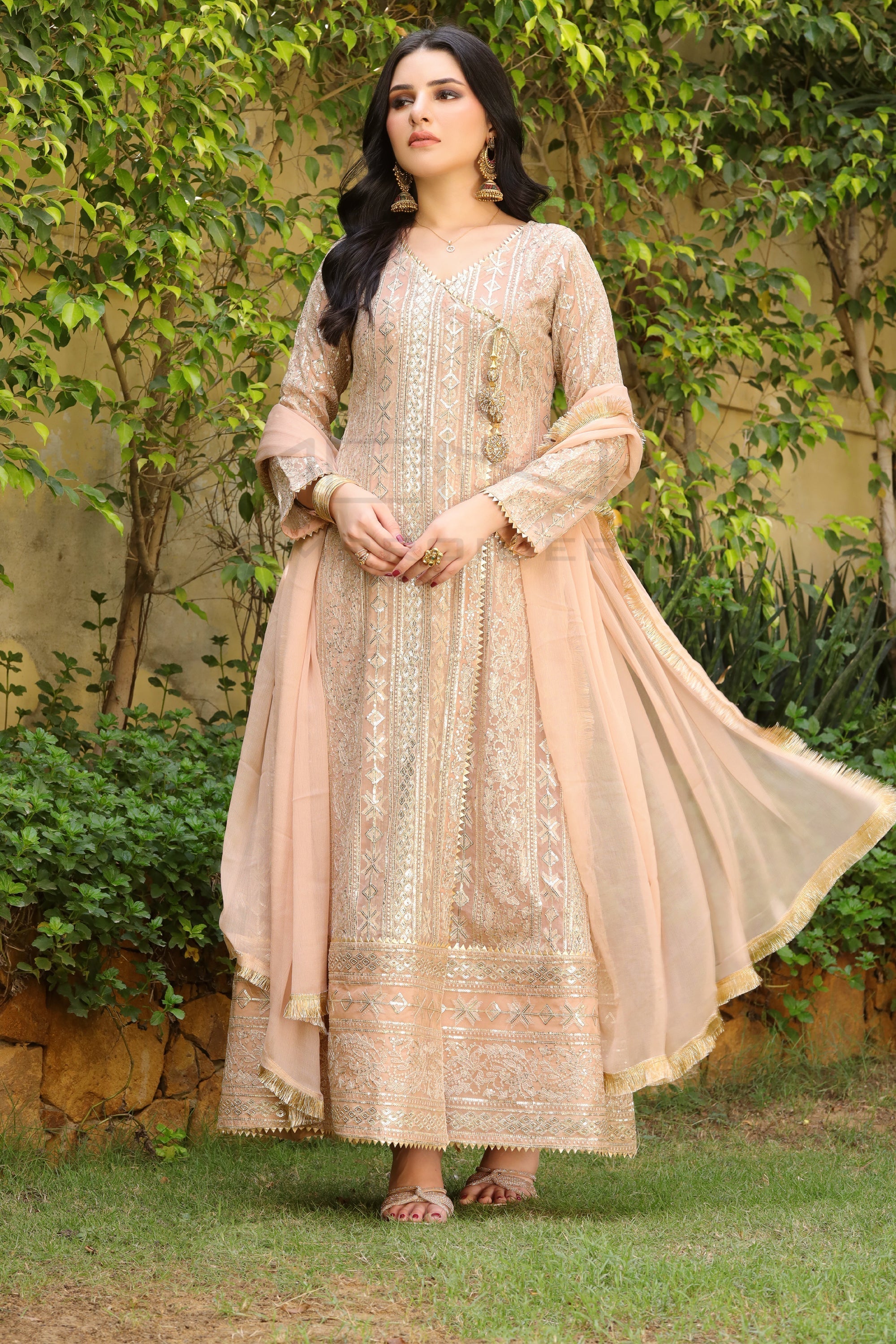 The exquisite embroidered work in vertical patterns of the angrakha, which exudes grace and elegance, is a marvel of craftsmanship and design. The designer's exquisite use of the zari, sitara, and sequin embroidery technique enhances this lovely dress. The wide border of the angrakha at the end reflects the fine craftsmanship. A gorgeous chiffon dupatta with a kiran lace border completes the ensemble. Make use of Mona Embroidery to showcase your individual style and embrace it.