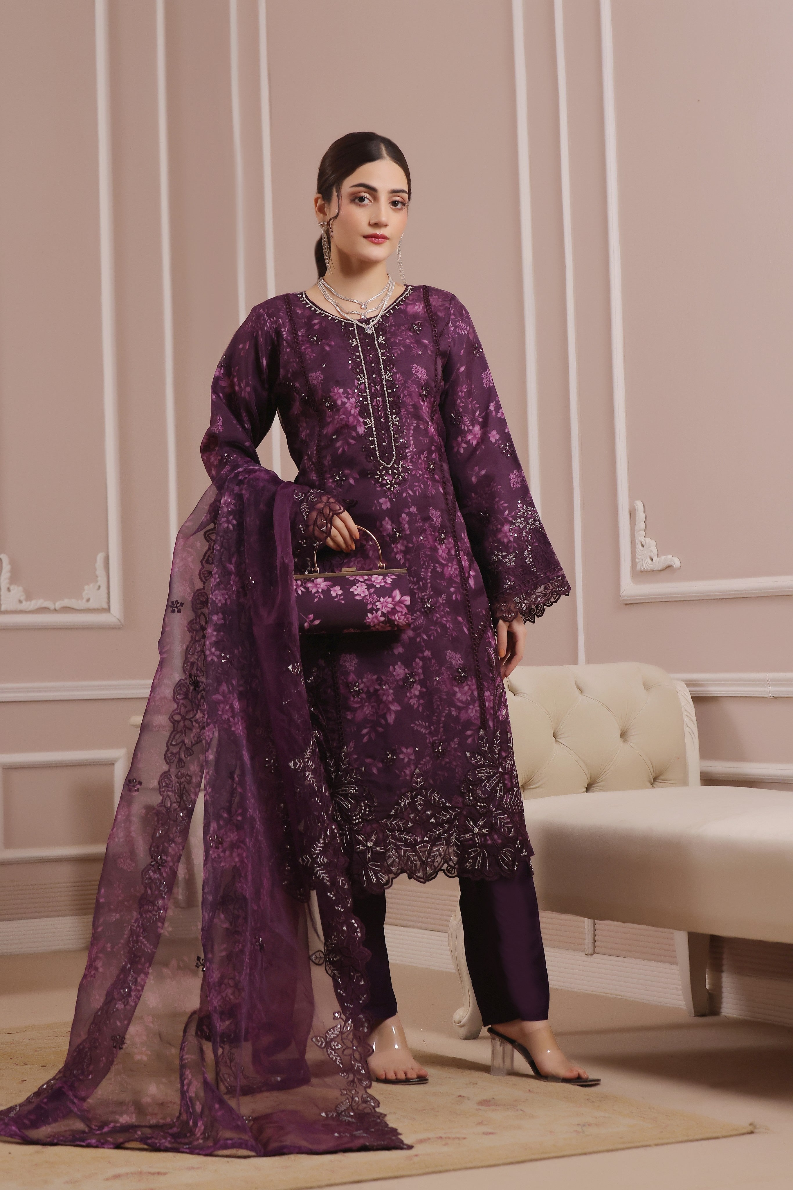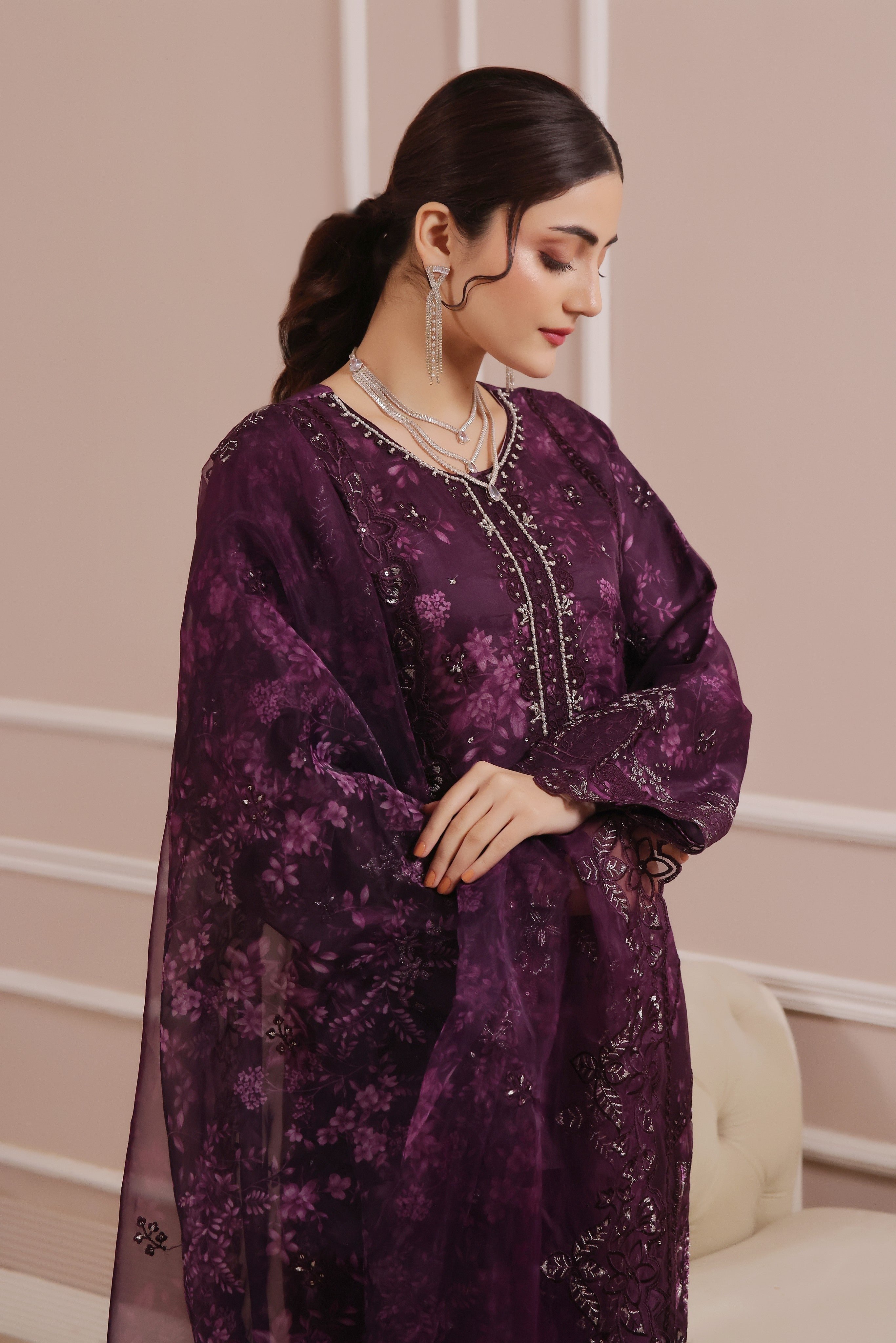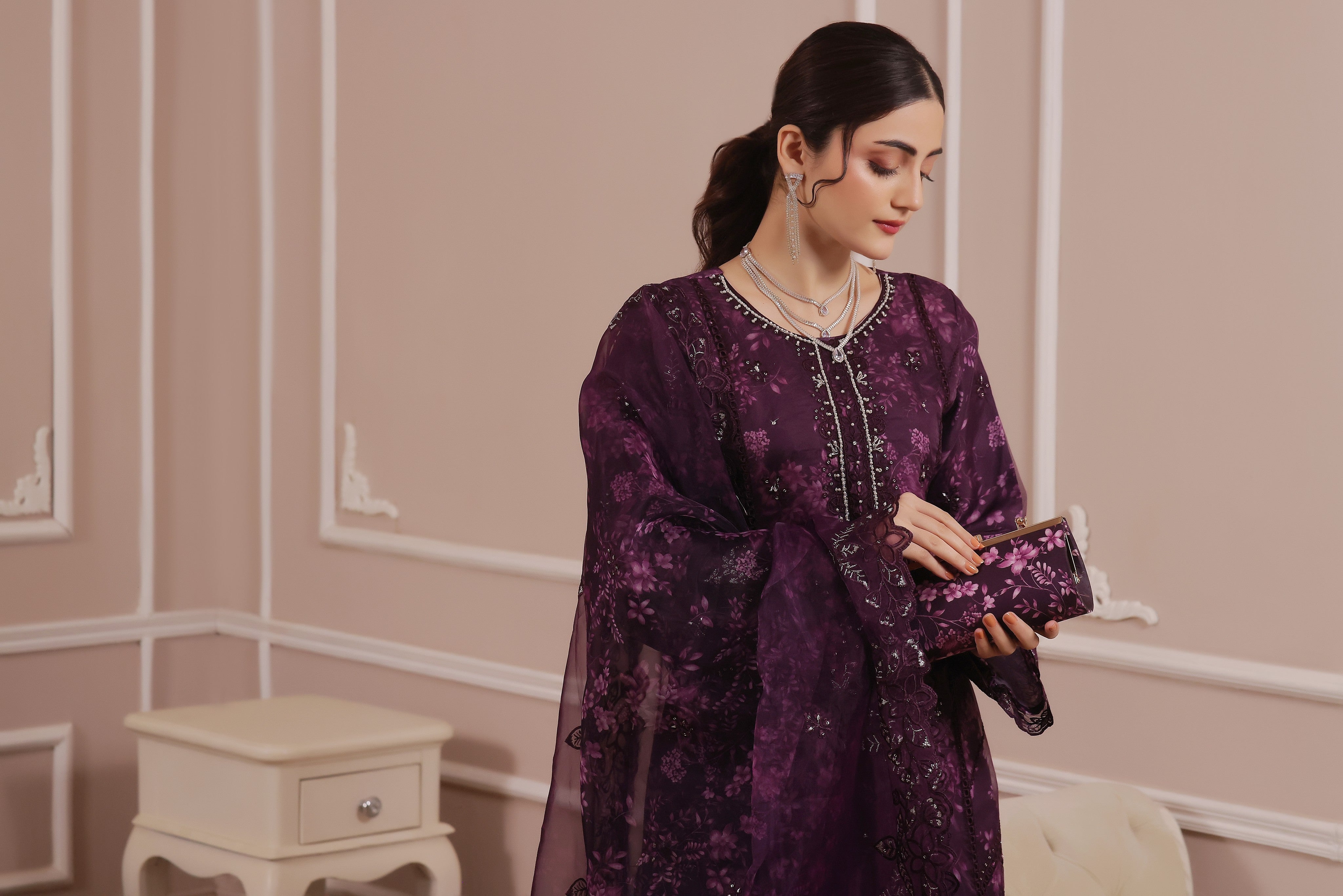 Elevate your festive wardrobe with SHARJEENA-D (Maroonish Magenta/Purple), the darker-hued extension of our iconic SHARJEENA Collection. Designed for women who embrace bold sophistication, this collection combines richly embroidered organza with statement embellishments, creating ensembles that captivate in every detail.