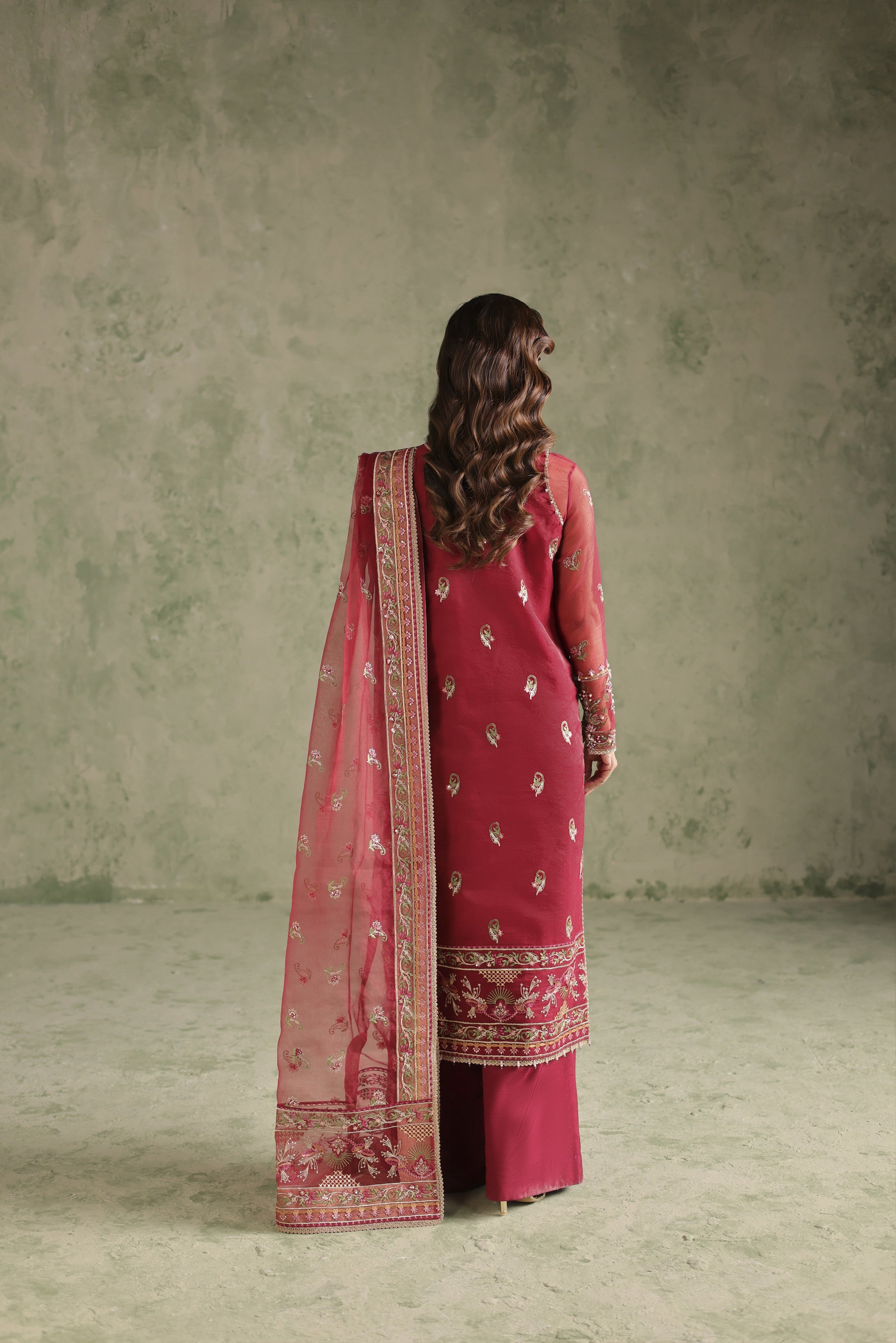 The sleeves and back continue the artistry with intricate embroidery, while the dupatta in embroidered organza flows gracefully, completing the look with sheer sophistication. Paired with a dyed raw silk trouser and lining, this outfit strikes the perfect balance between traditional craftsmanship and modern luxury.