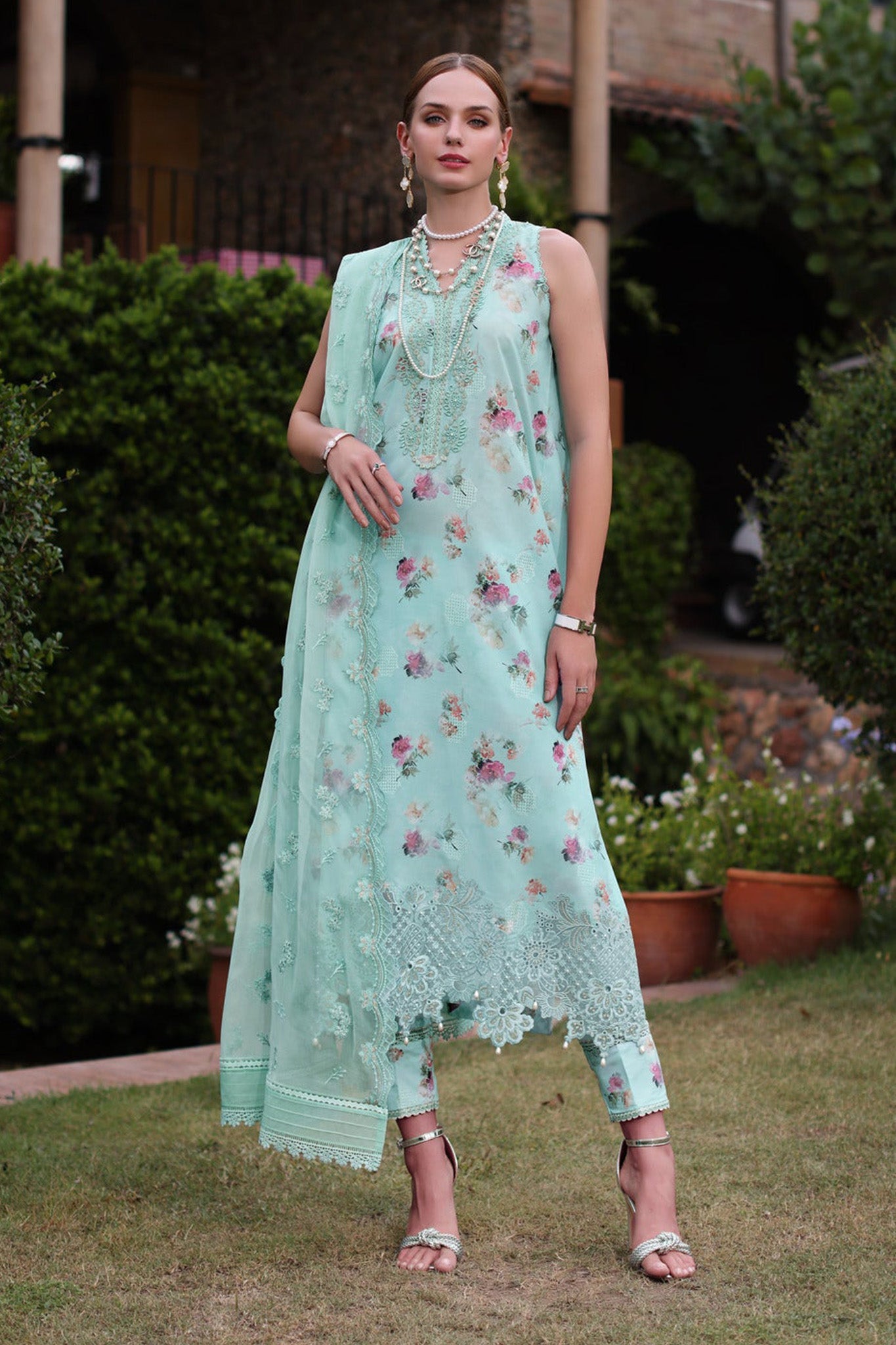 Front: Digital printed embroidered lawn Back Digital printed lawn Sleeves: Digital printed embroidered lawn Trouser: Digital printed cambric Dupatta: Embroidered...