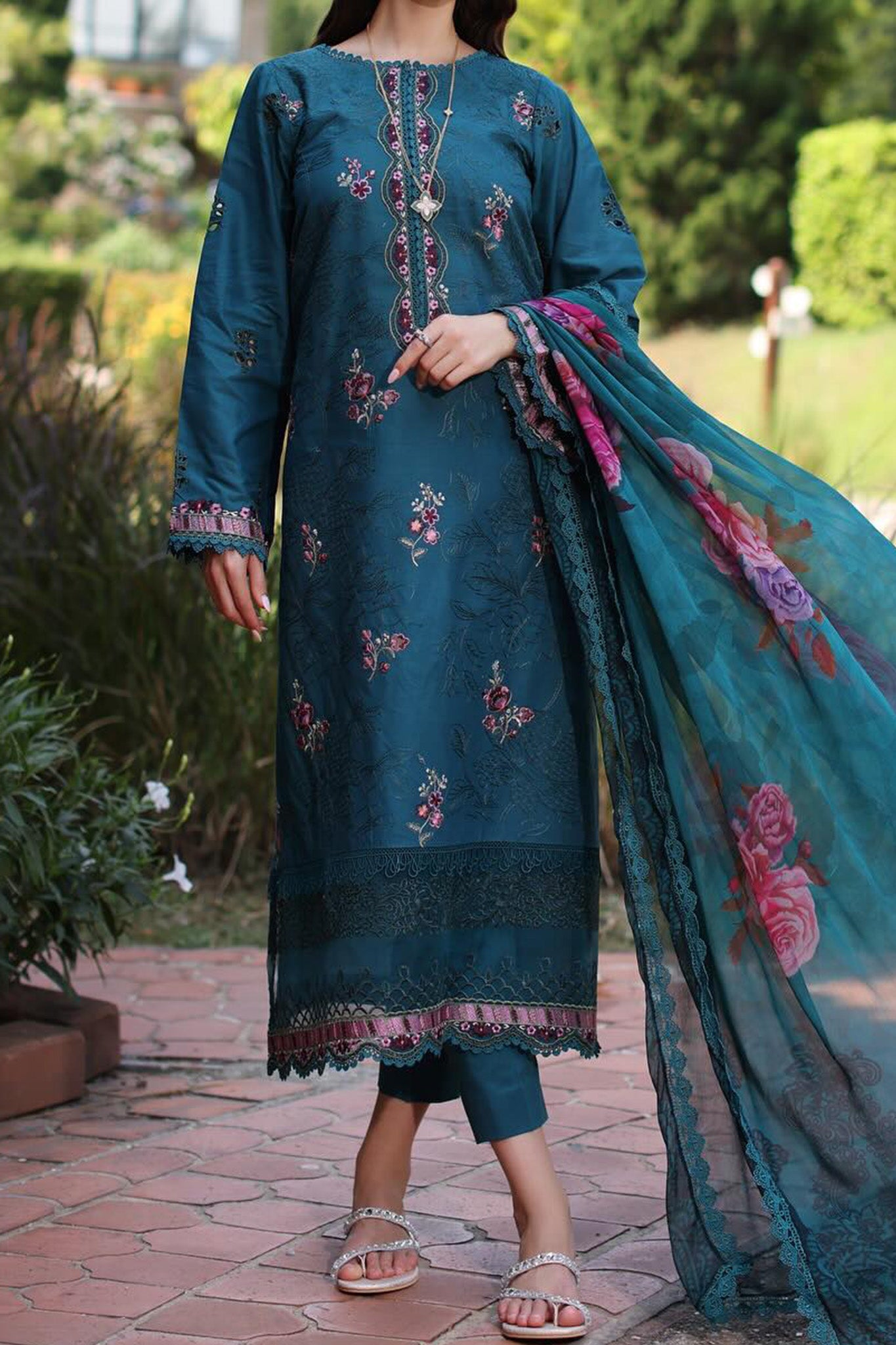 Front: Embroidered lawn Back:Dyed lawn Sleeves: Embroidered lawn Trouser: Dyed Cambric Dupatta: Digital printed chiffon Embroidries: Neckline Embroidered border Embroidered...