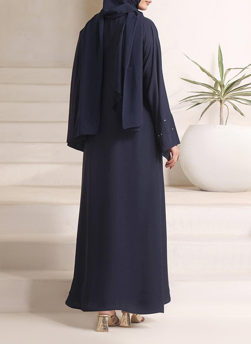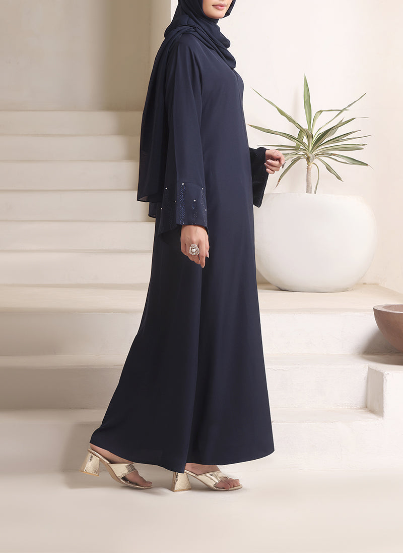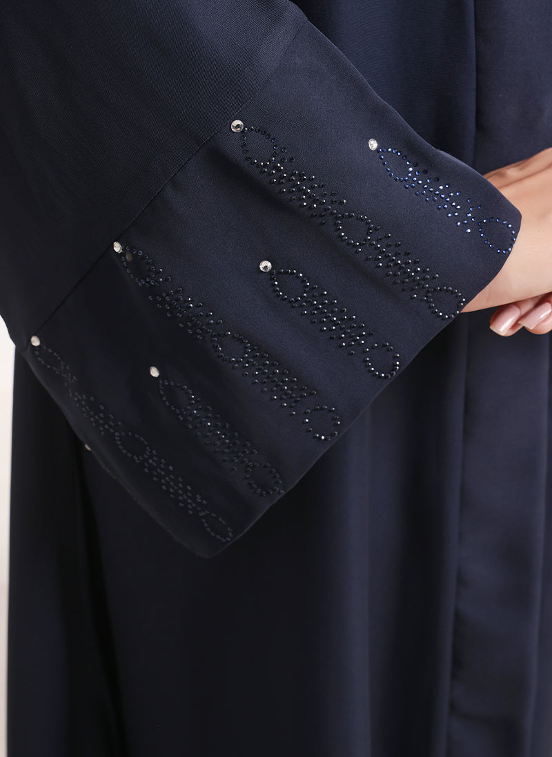 Elevate your modest style with Hijab Ul Hareem?s Nida Fabric Abaya, featuring elegant stone work detailing on the sleeves. Soft, graceful, and perfectly stitched ? a timeless piece for every occasion