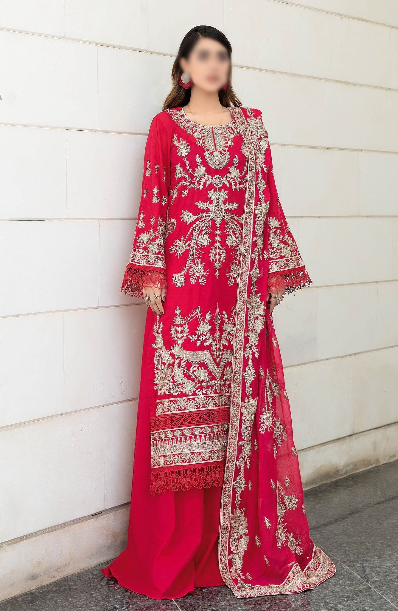 Heavy Embroidered Shirt 1.3 Mtr Embroidered Back 1.3 Mtr Embroidered Sleeves 0.75 Mtr Embroidered Chiffon Dupatta 2.5 Mtr Plain Trouser...