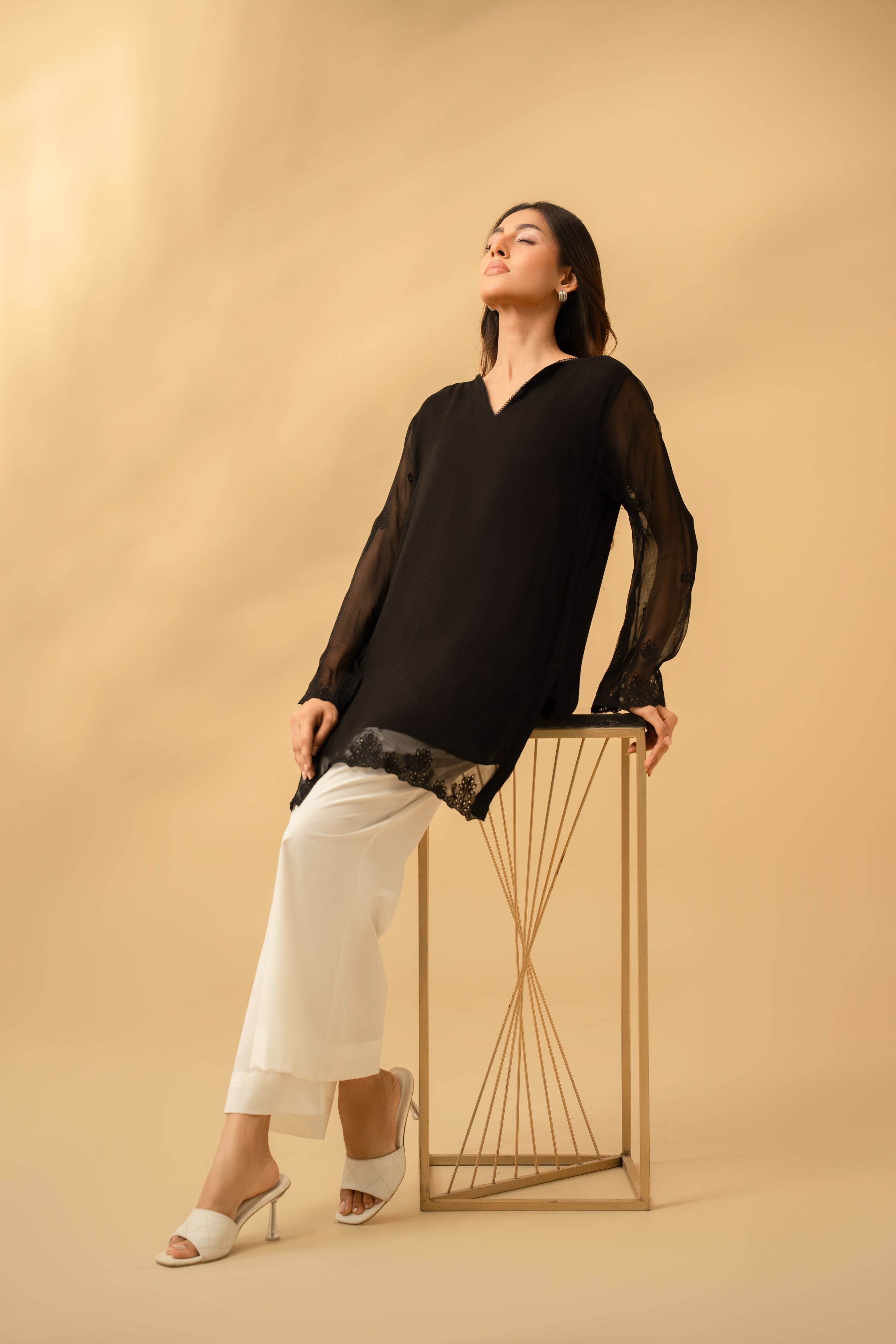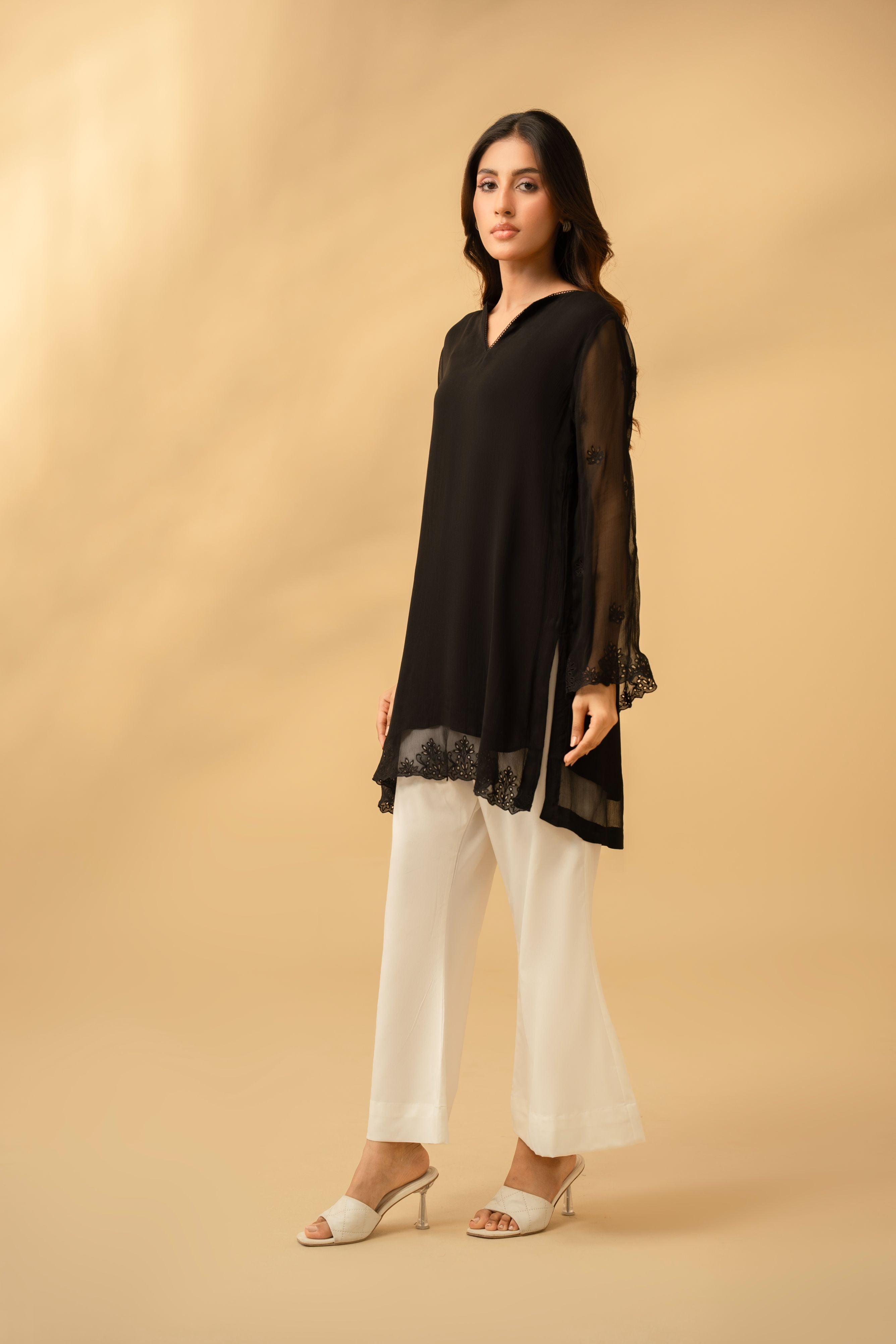 Elevate your evening aesthetic with the "Allure" Tunic. Crafted for the woman who appreciates subtle luxury, this jet-black shirt is a masterclass in understated elegance. a delicate lace-trimmed V-neckline leads the eye to sheer, ethereal sleeves. The piece is grounded by a stunning organza border at the hem, featuring tonal floral embroidery and intricate cutwork that adds a touch of artisanal craftsmanship to a modern design.