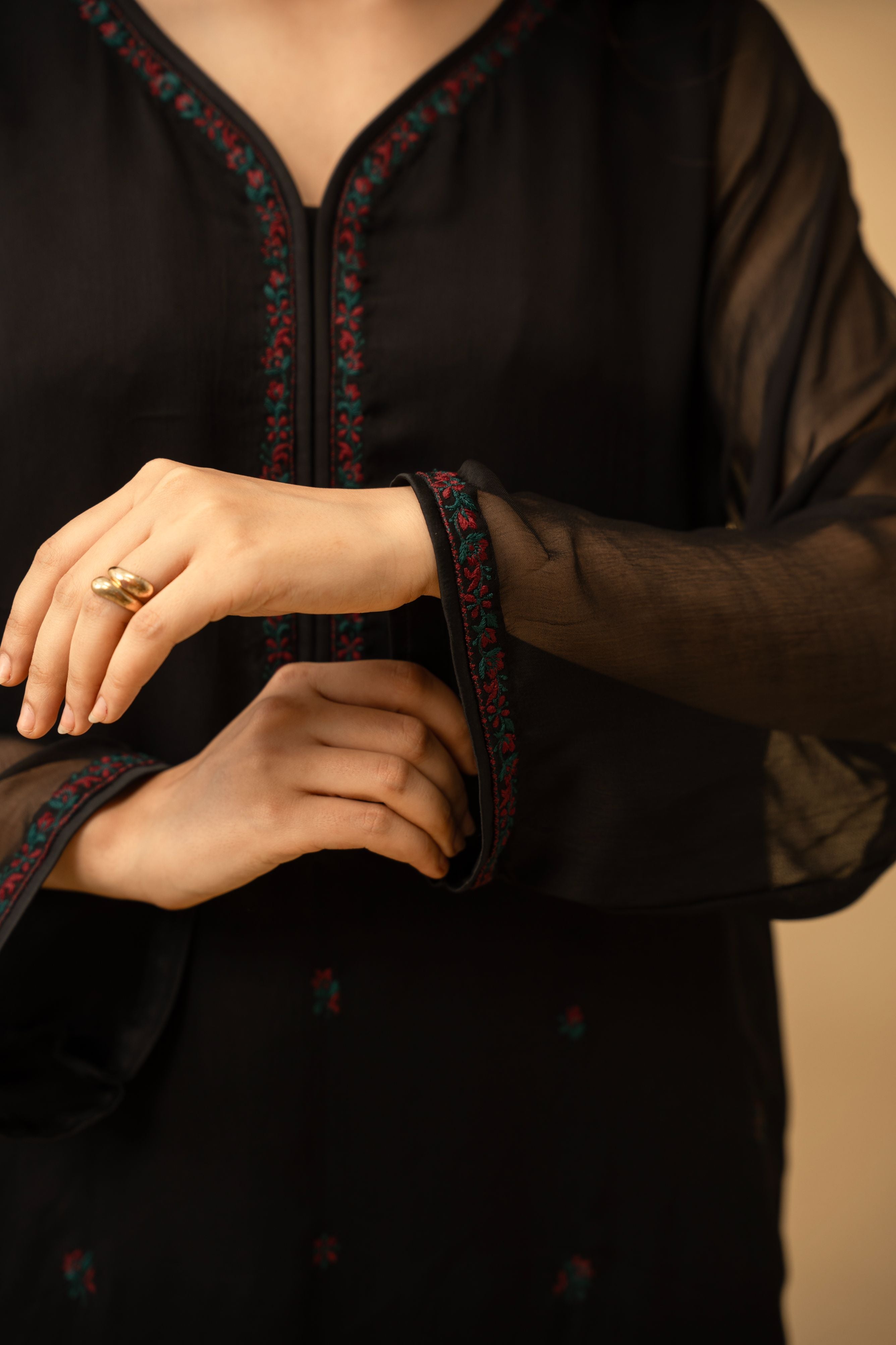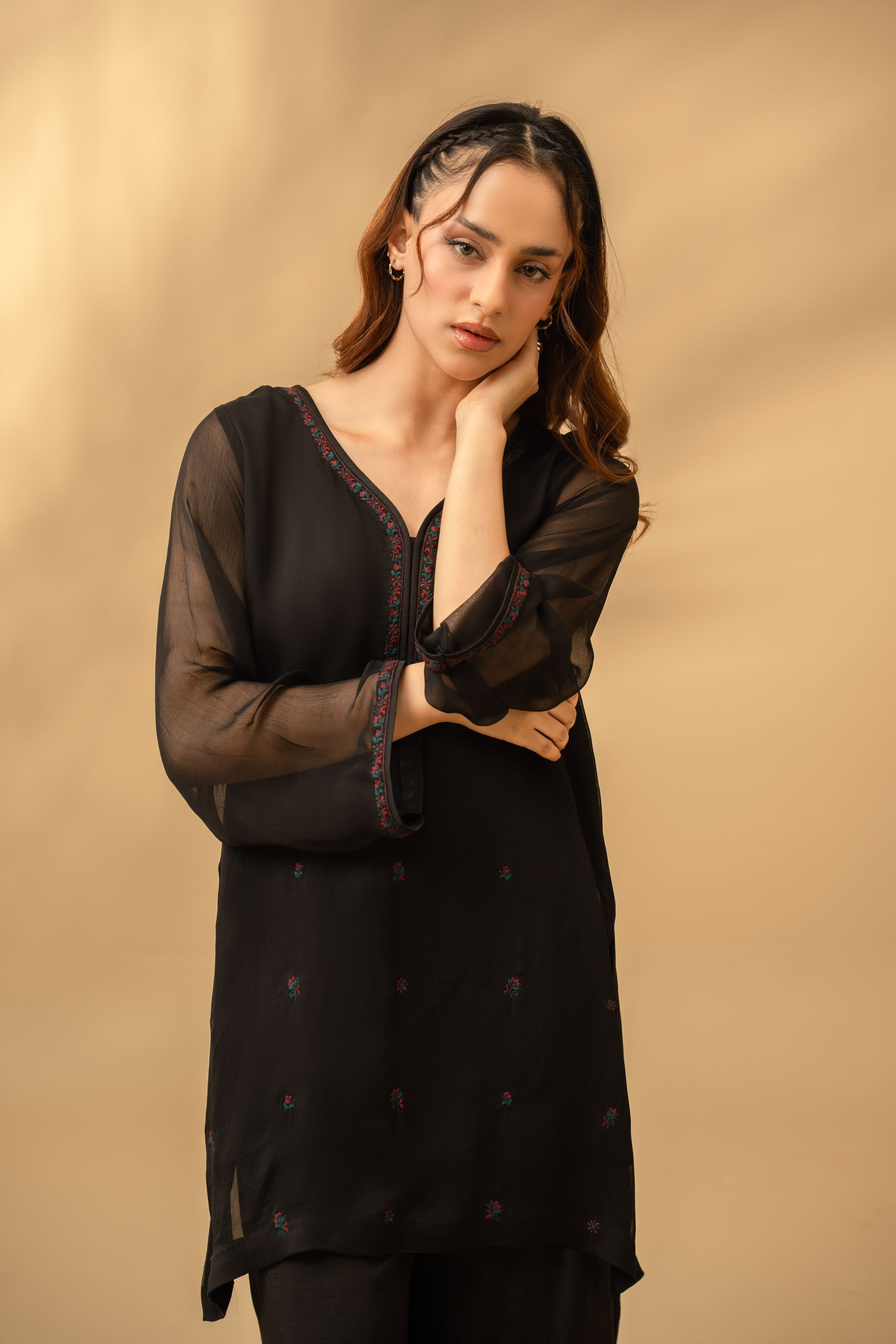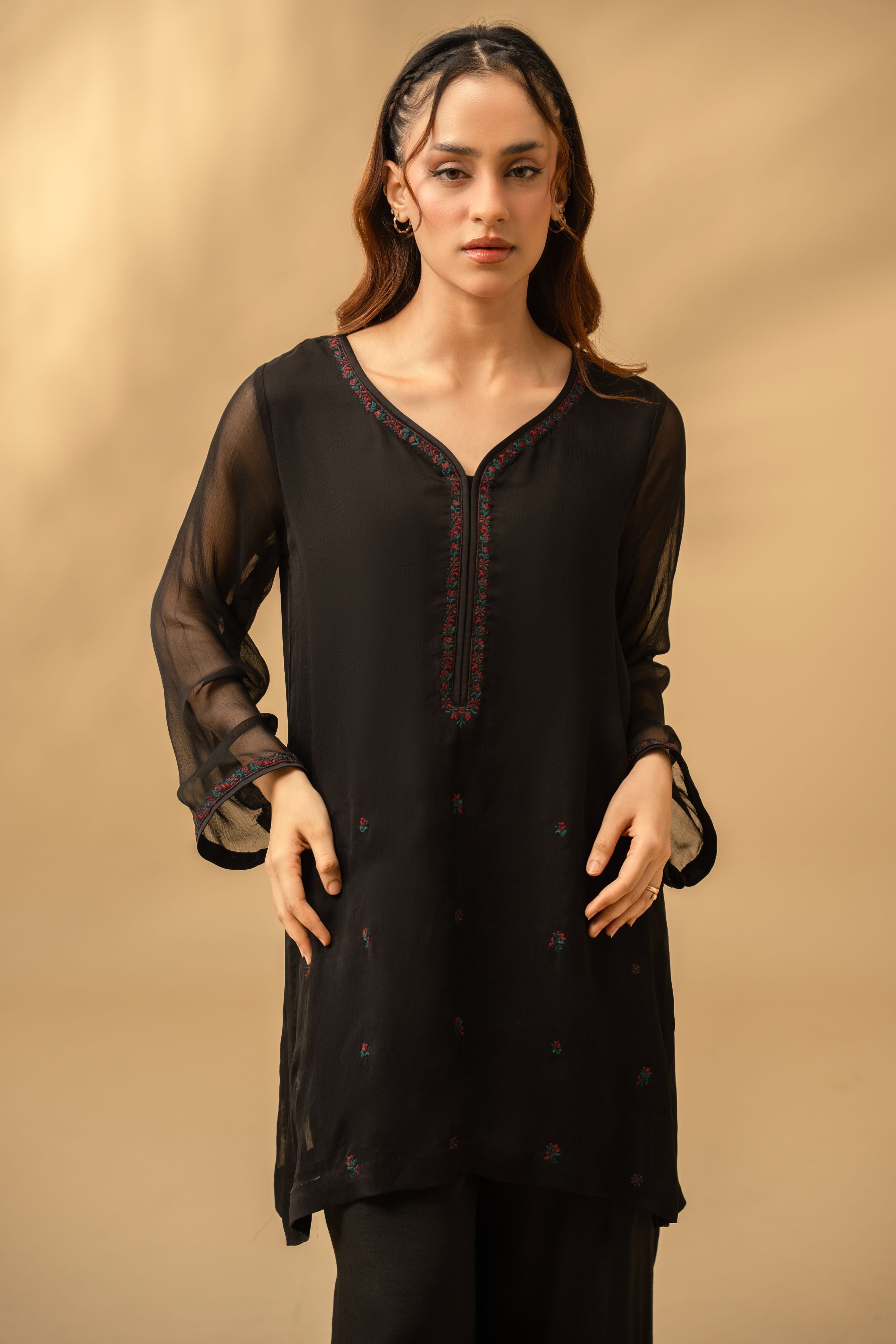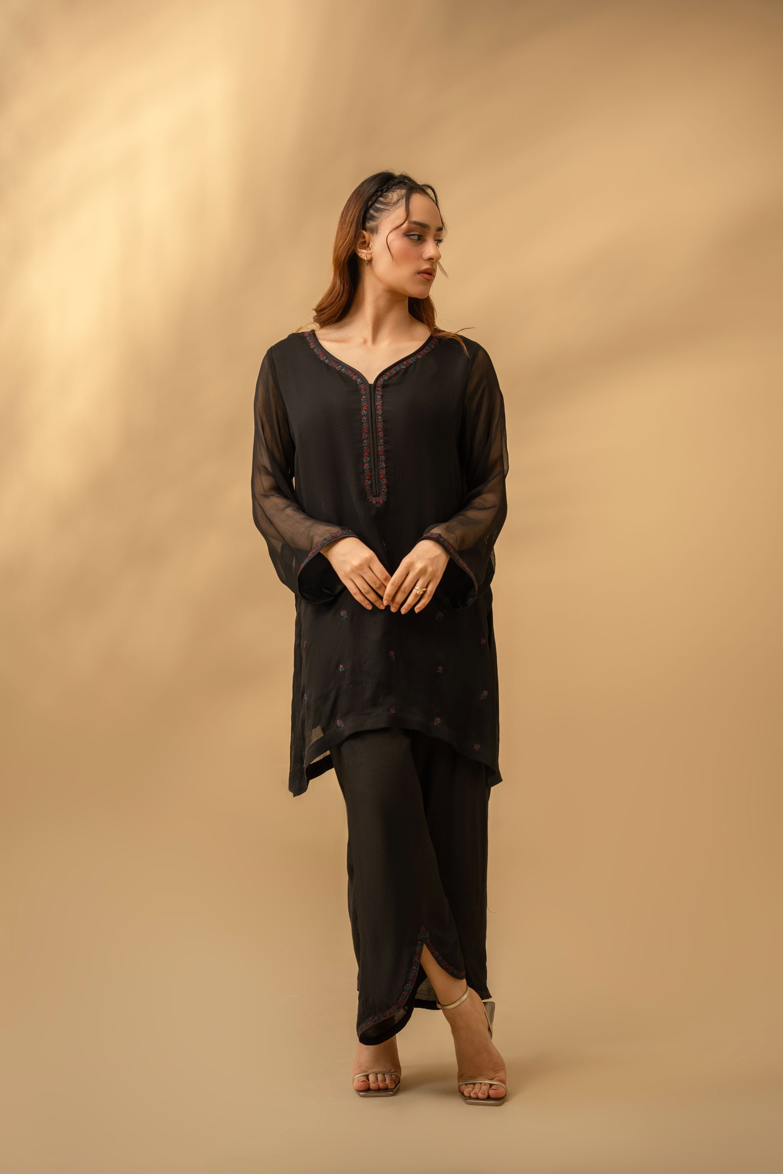 The silhouette features a sophisticated tunic with sheer sleeves that introduce softness and movement, paired with matching black trousers finished with a curved tulip-style hemline. This contemporary cut adds a subtle feminine edge while maintaining a clean, elongated profile.