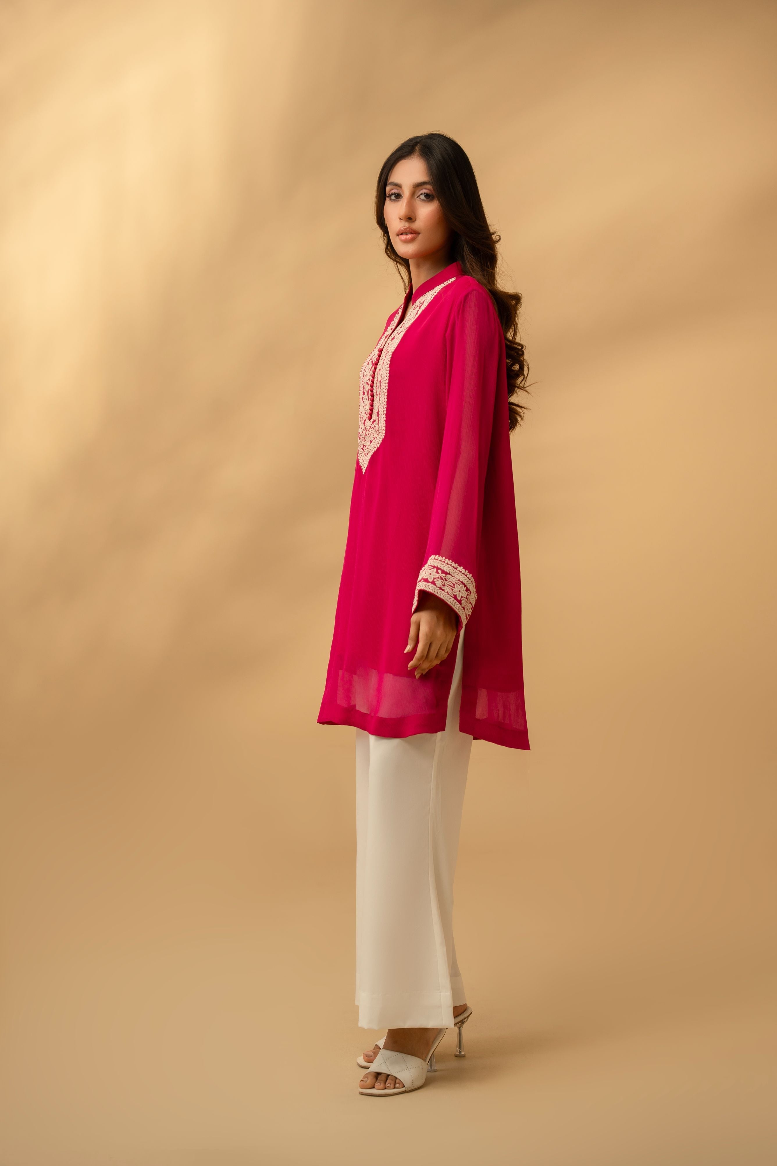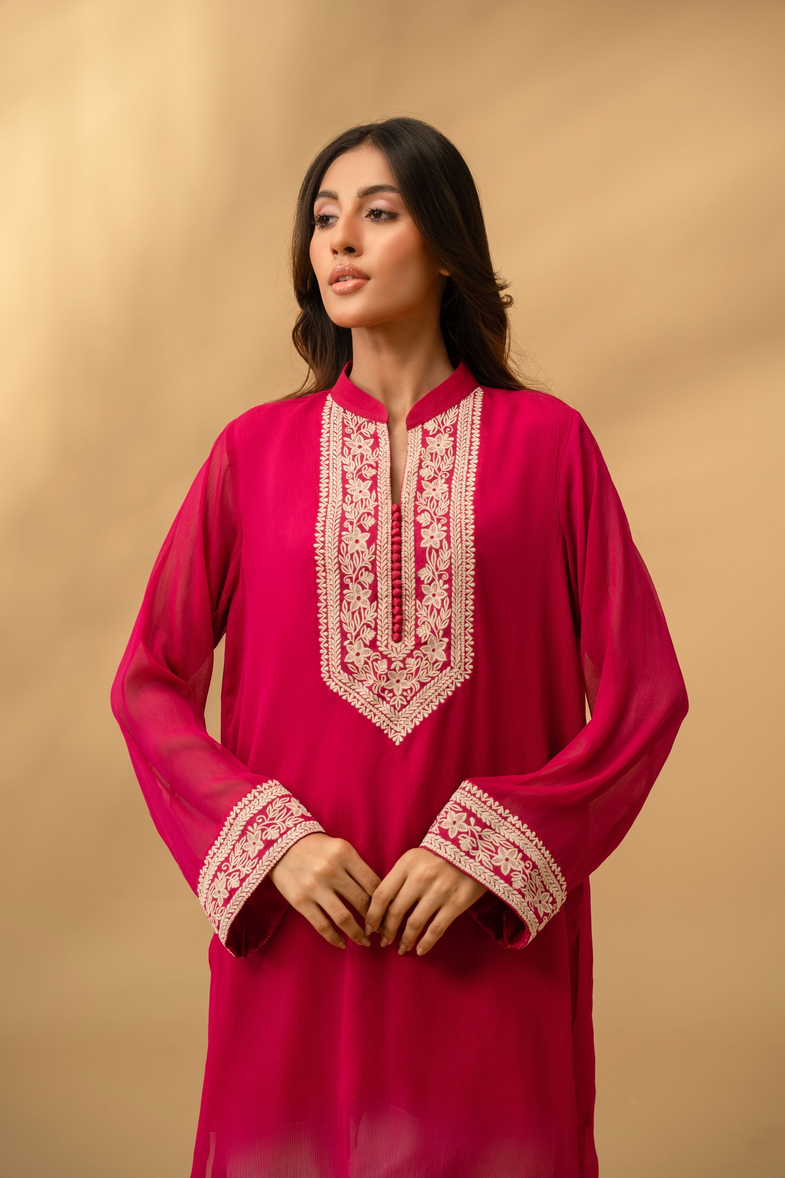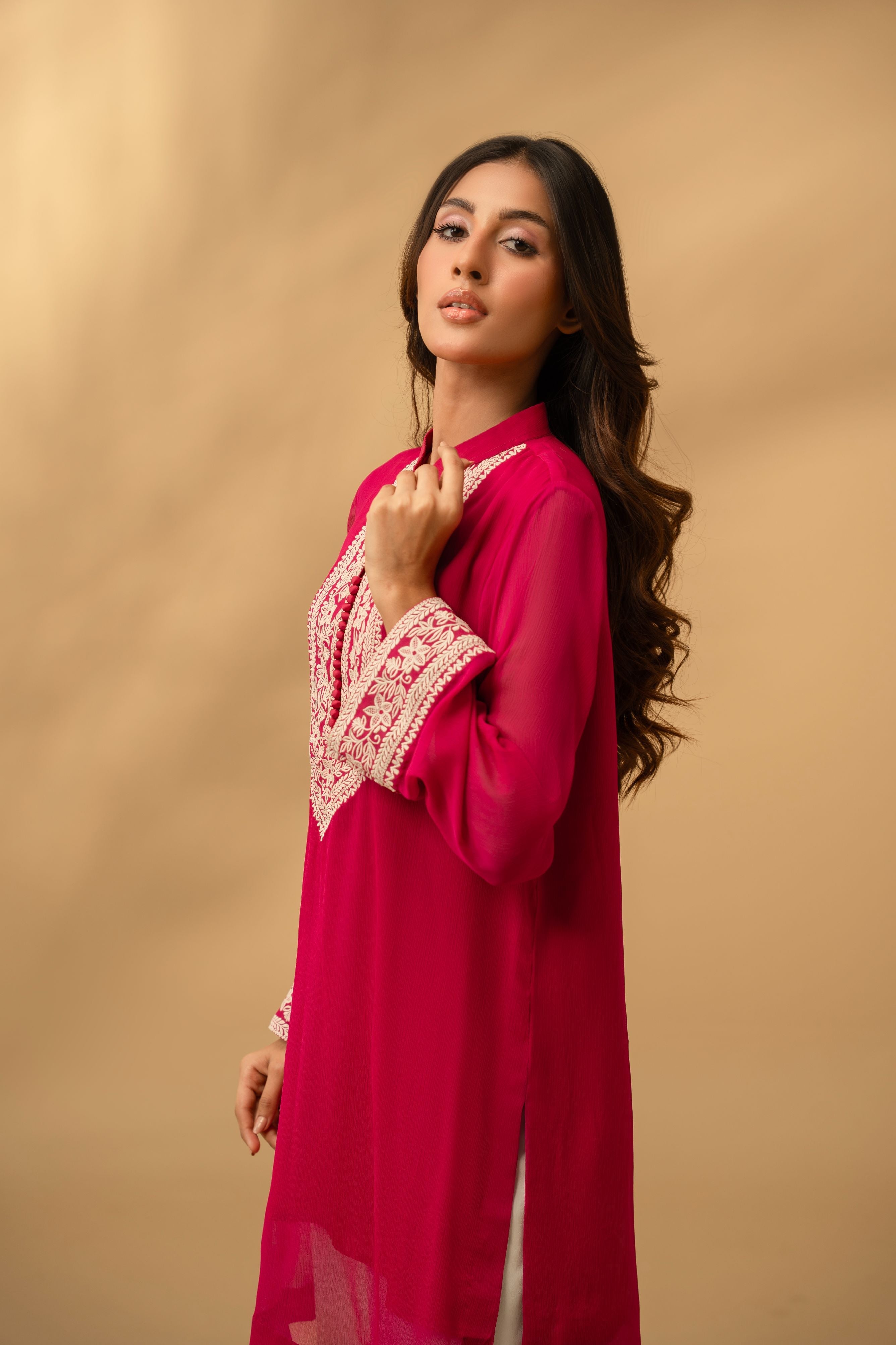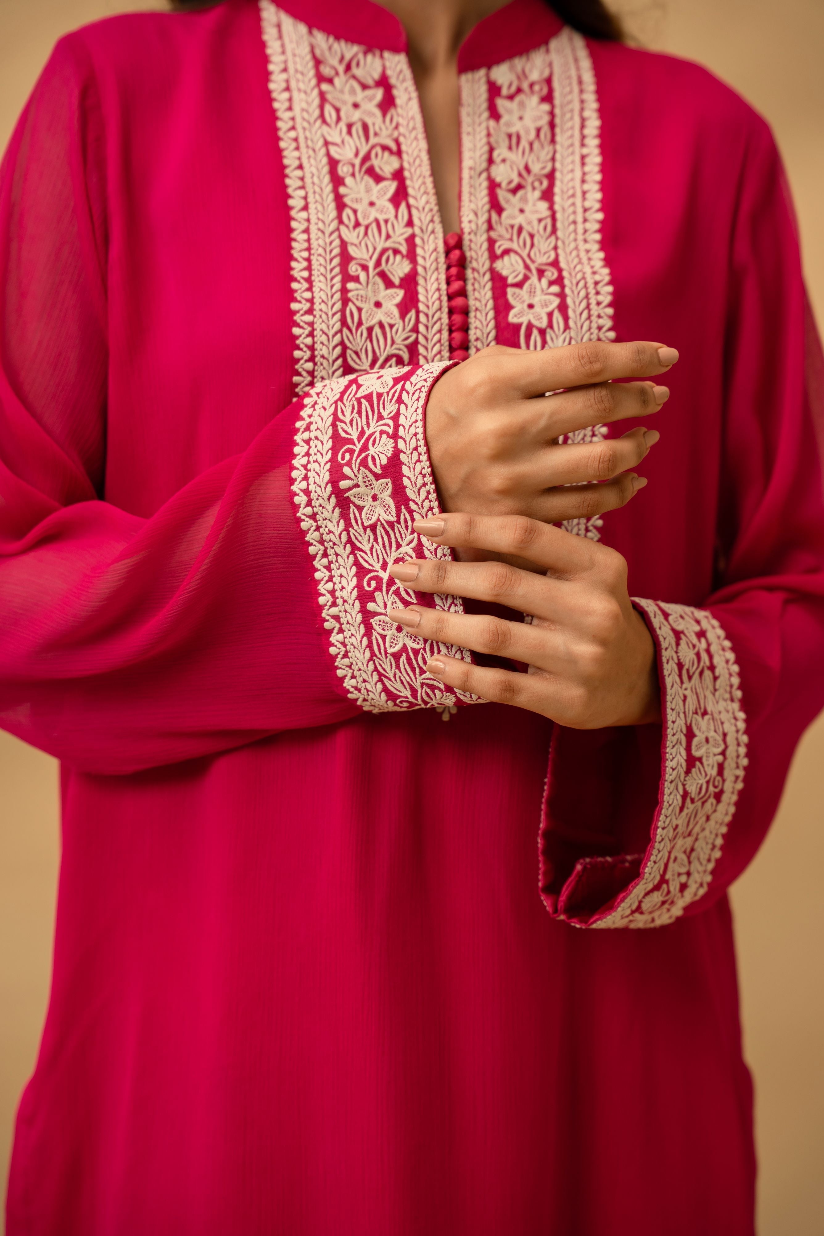 The centerpiece of this design is the meticulously detailed embroidery along the neckline and placket, reminiscent of traditional motifs reimagined for the modern woman.