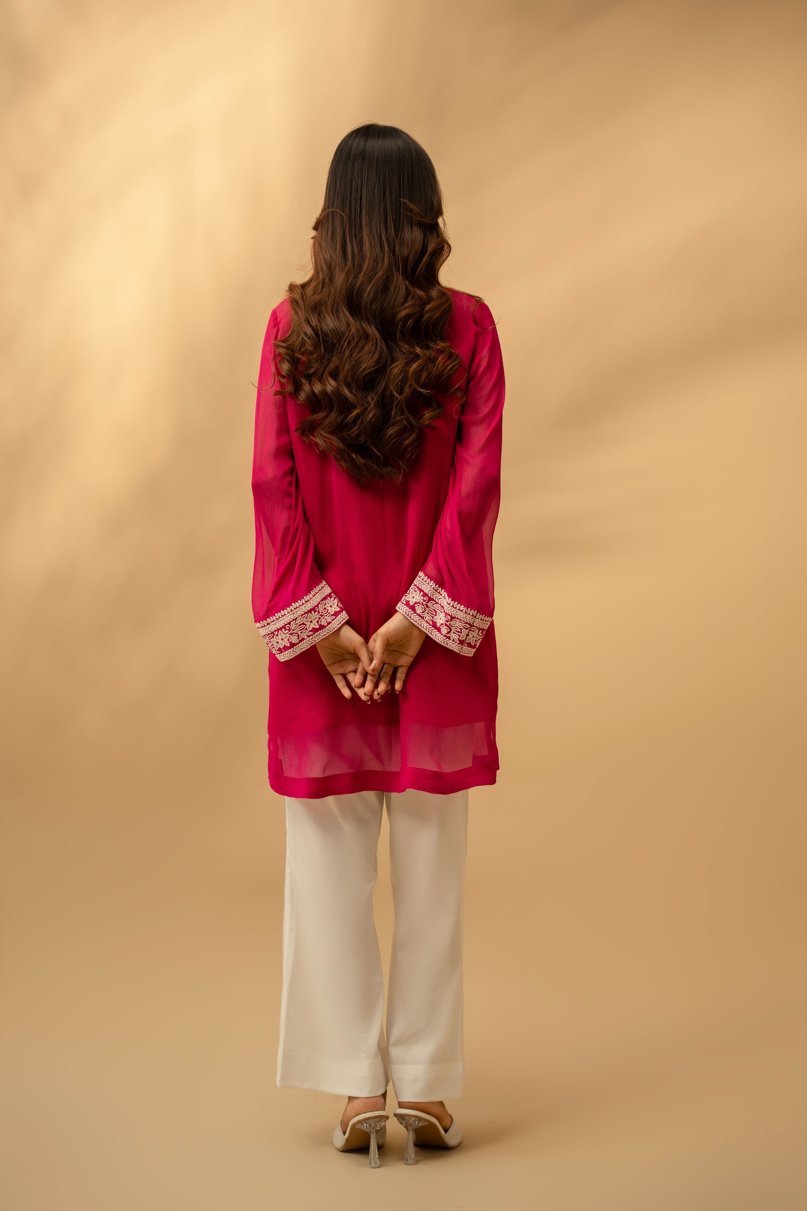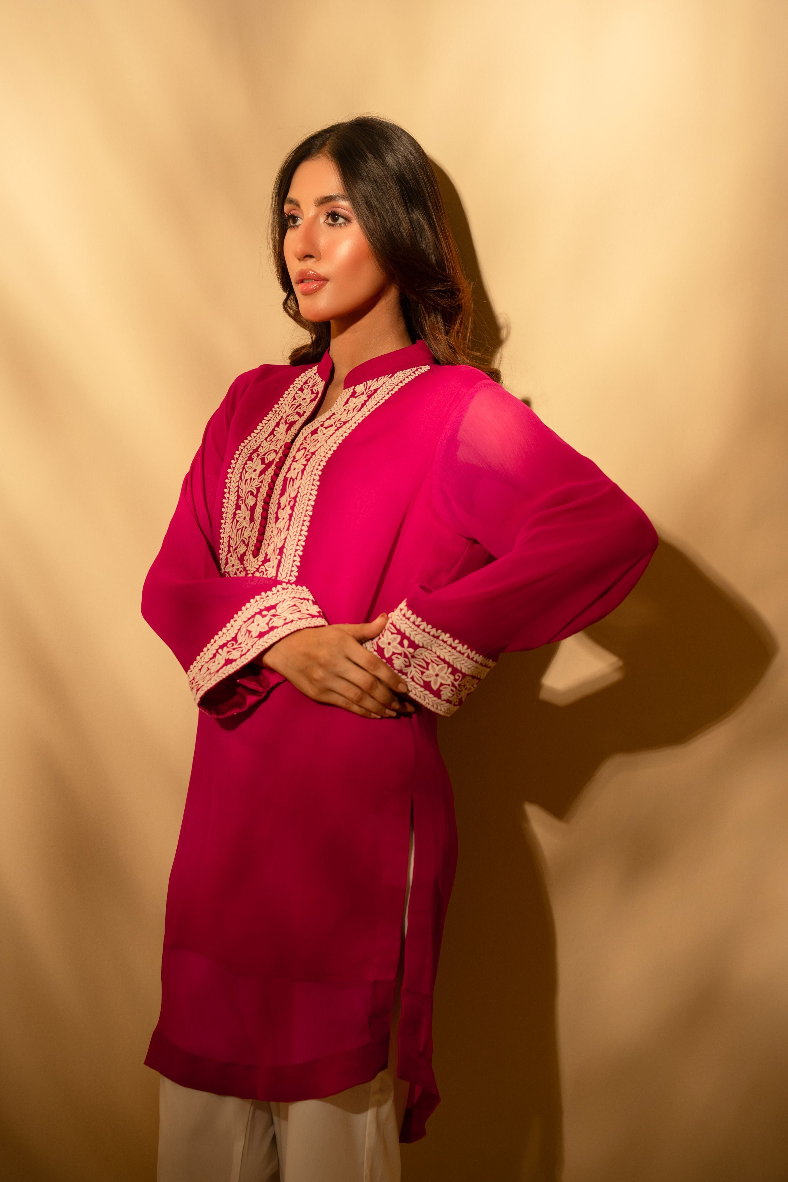 The Sera tunic is a vision in striking magenta, blending a high-impact hue with delicate, ivory-toned artistry. Crafted from a lightweight, breathable fabric that offers a beautiful drape, this shirt features a classic straight-cut silhouette that ensures both comfort and sophistication.