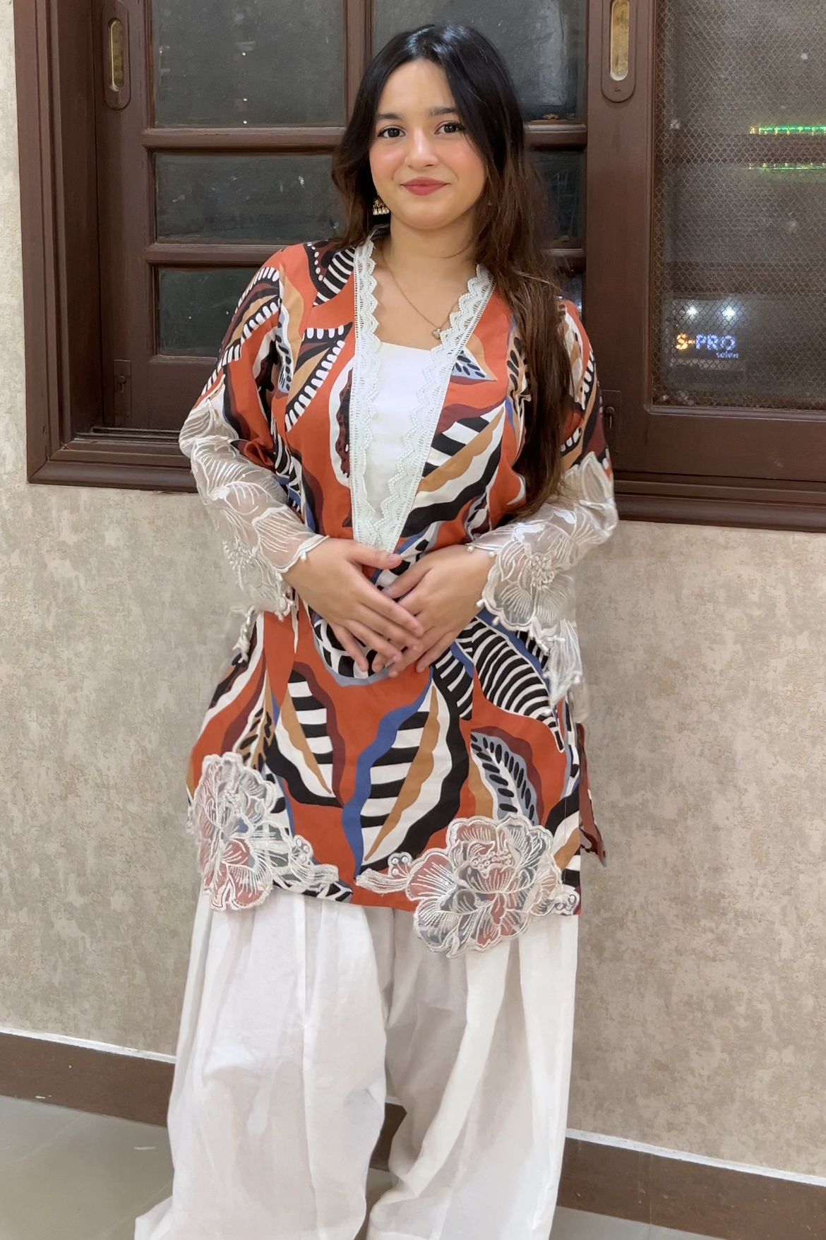 Elevate your wardrobe with this cotton embroidered 2-piece co-ord set. The vibrant printed shirt is beautifully accented with delicate embroidery and lace details on the sleeves and neckline, adding a touch of sophistication. Paired with a classic white farshi shalwar, this outfit blends traditional charm with modern design. Ideal for festive gatherings, casual outings, or semi-formal events, this ensemble ensures both comfort and elegance in every wear.