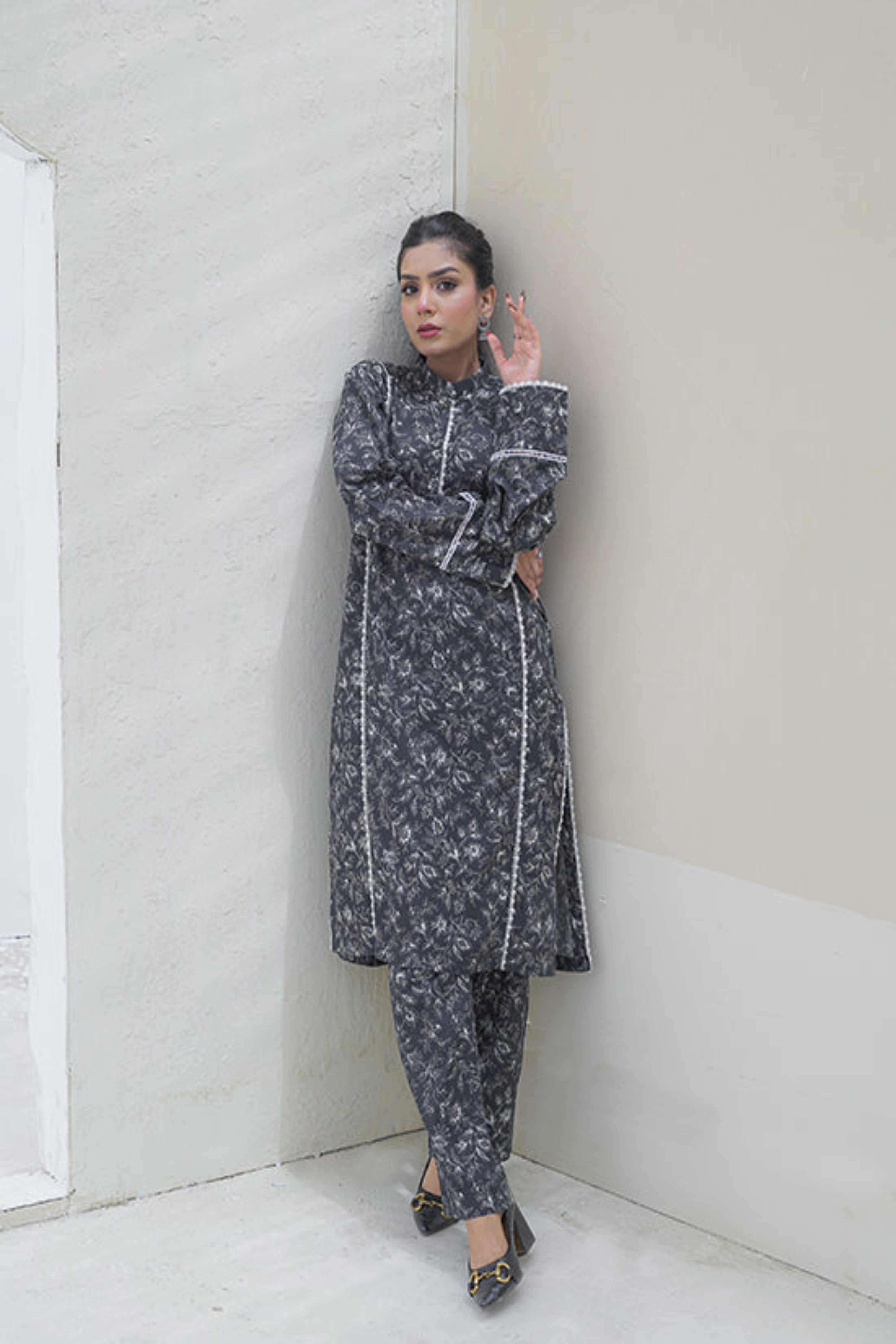 The Dusky Flora Set includes a long shirt with lace running down both sides and on the neckline and sleeves. It comes with straight pants, offering a stylish and comfortable look.