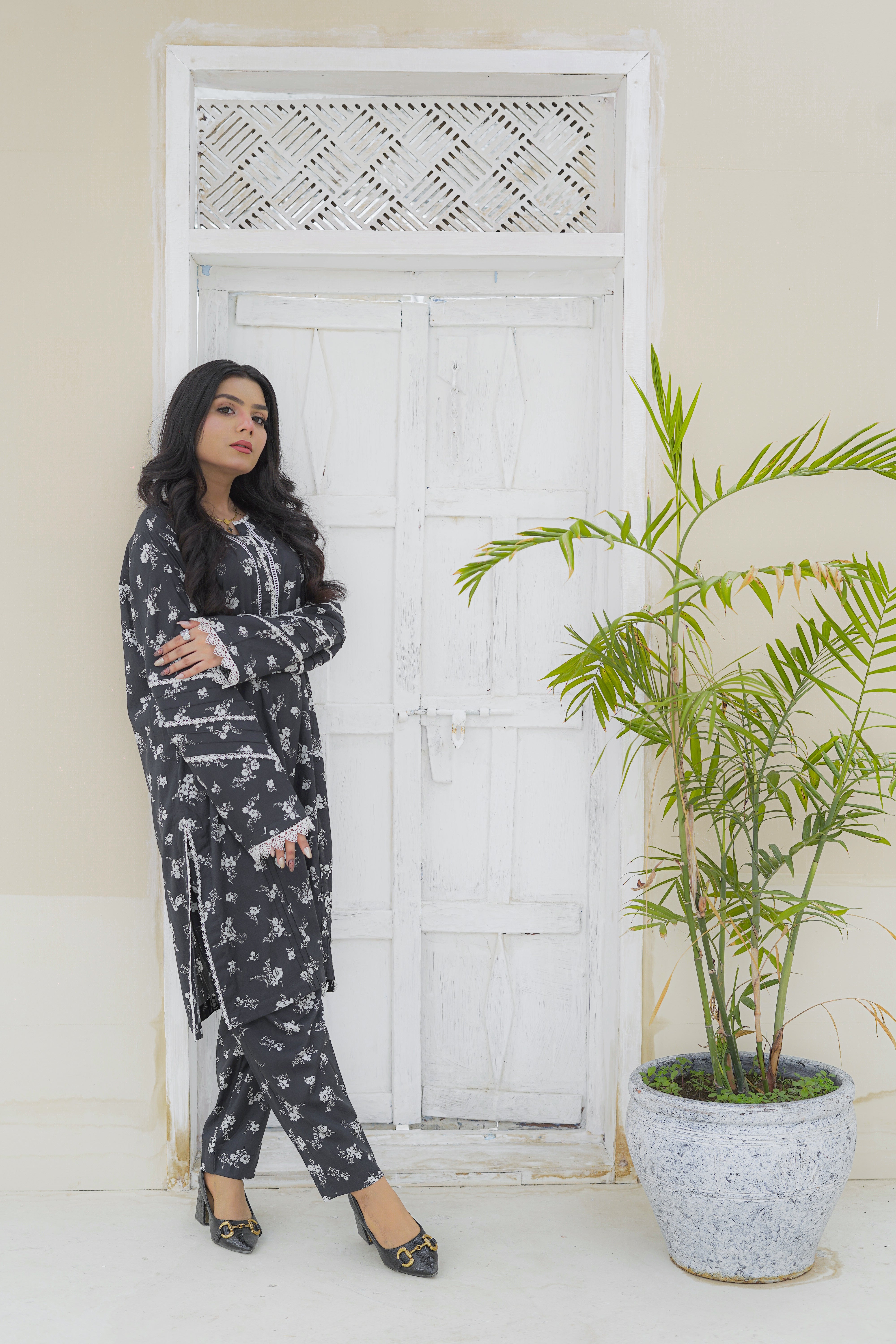 The Blooming Black Set includes a long shirt with elegant minimal lace on the neckline and sleeves, complemented by straight pants. This combination offers a sophisticated look that’s perfect for both casual and formal events.