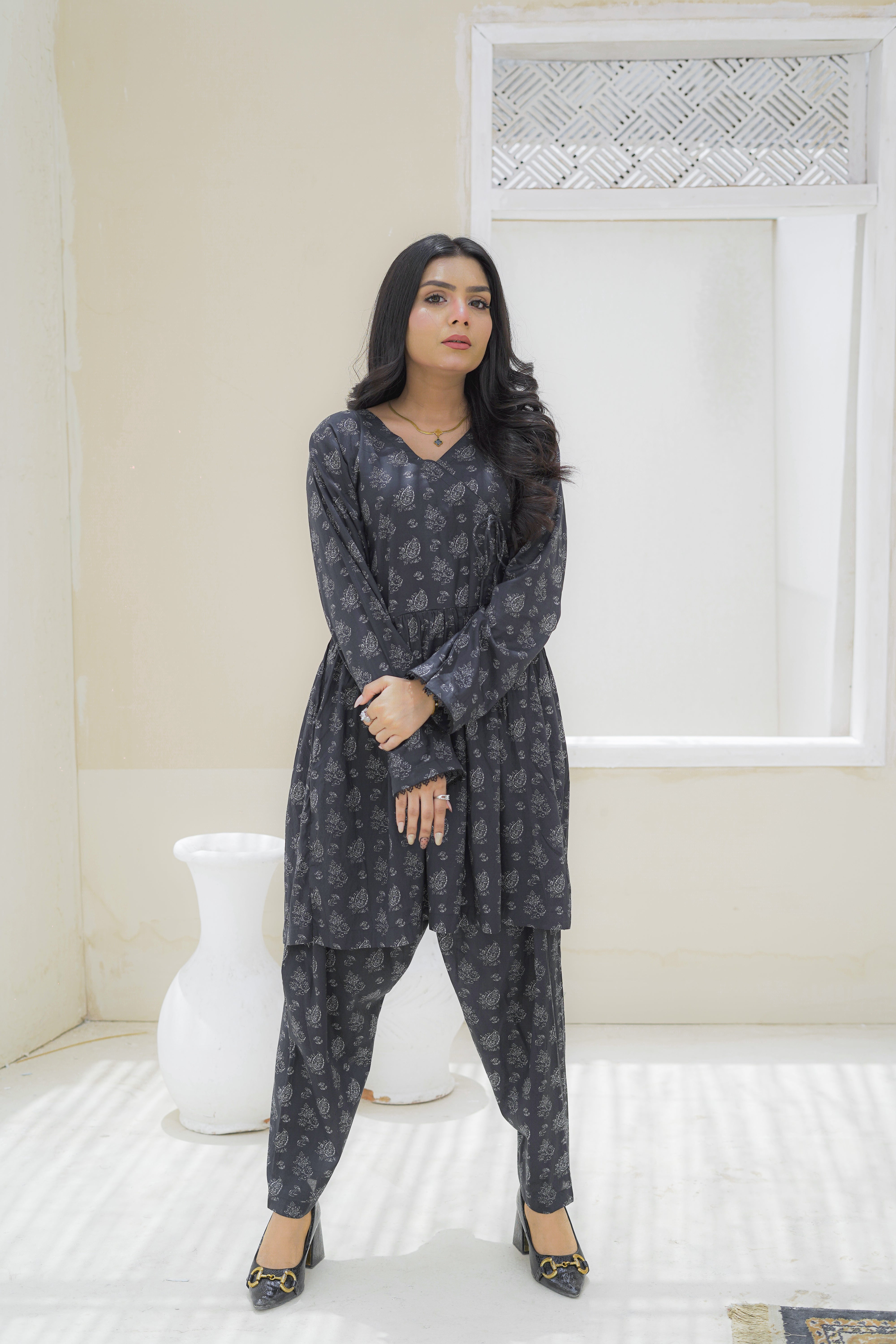 The Ethnic Contrast Set features a round frock in an angarkha style with a vibrant digital block print. Paired with a classic shalwar, this set is comfortable and stylish, perfect for both daily wear and special occasions.