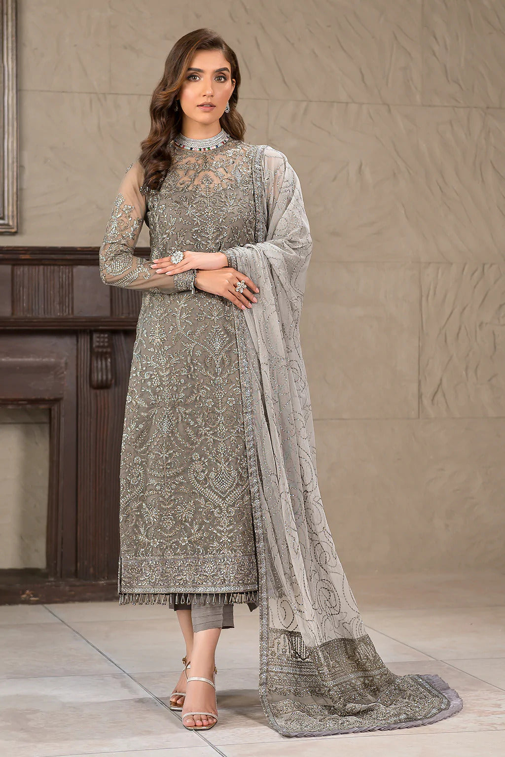 Shirt Front: Sequins Embroidered Net Shirt Back: Sequins Embroidered Net Sleeves: Sequins Embroidered Net Dupatta: Light Grey Sequins Embroidered Net...