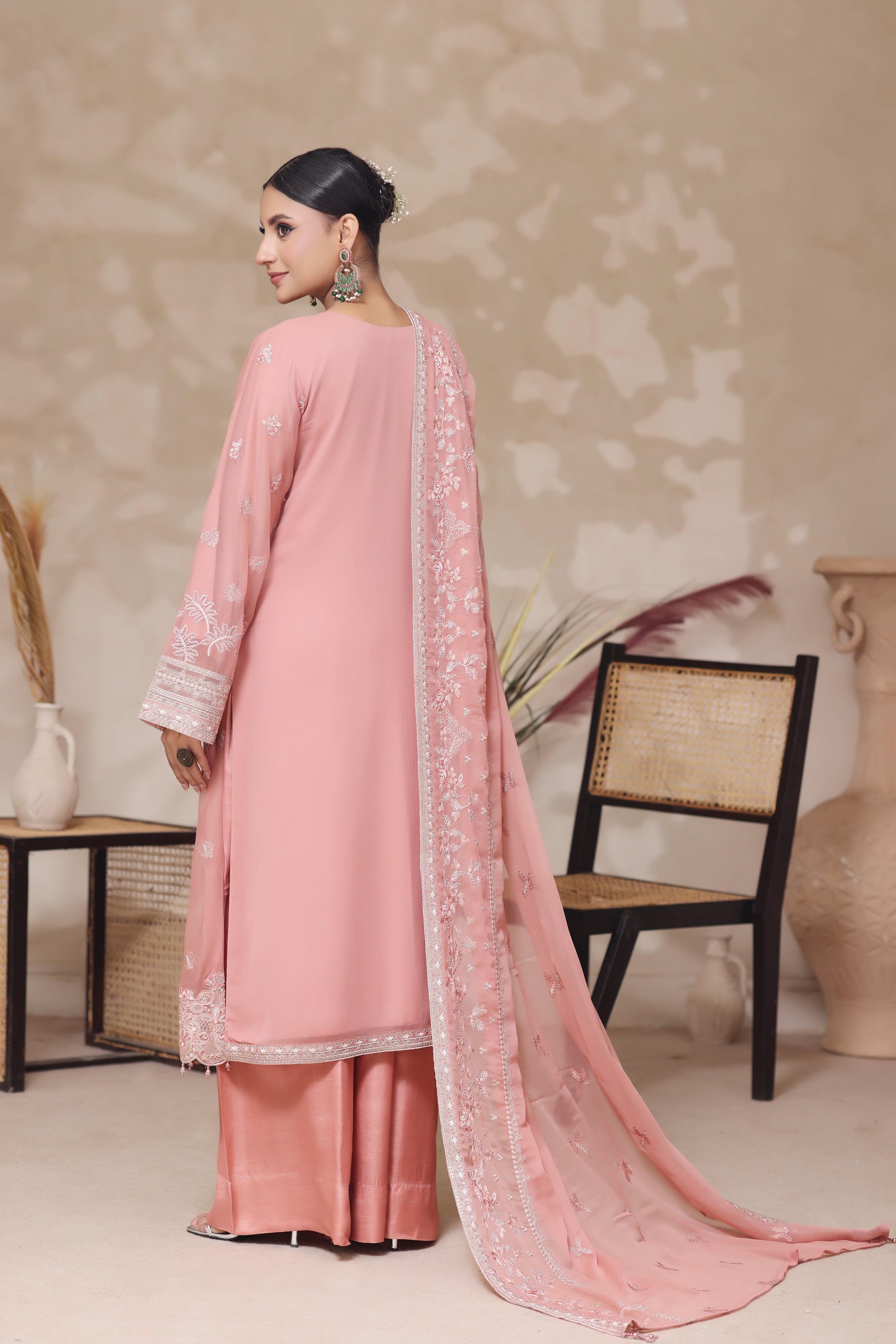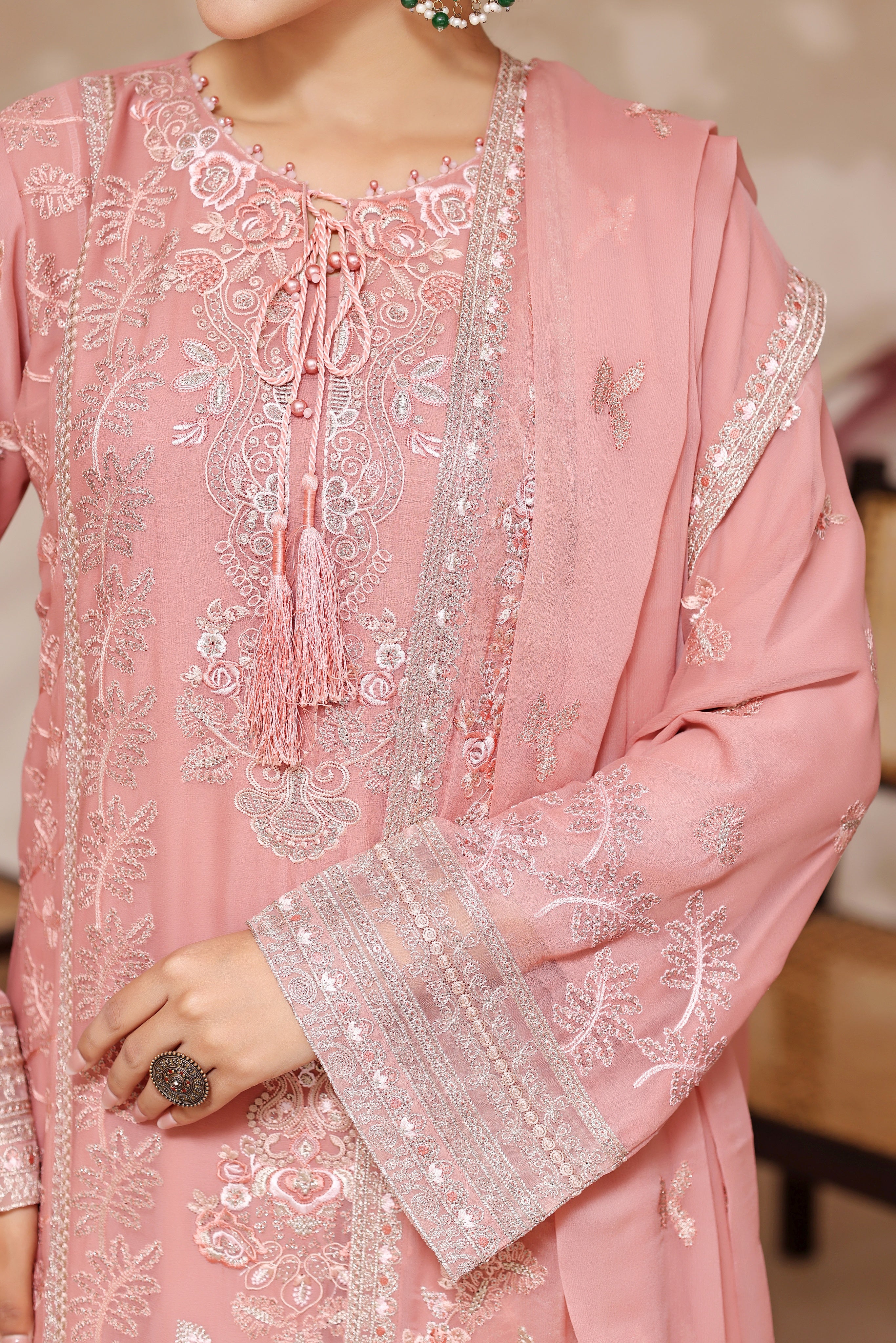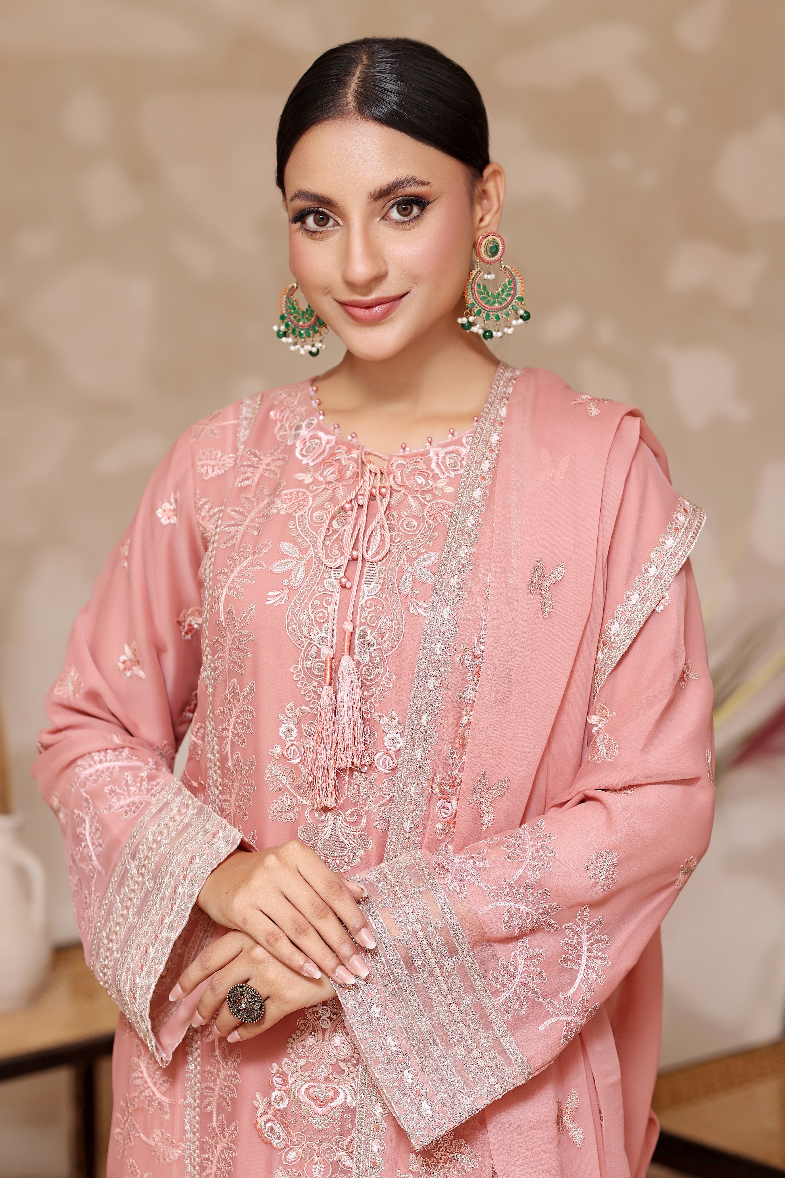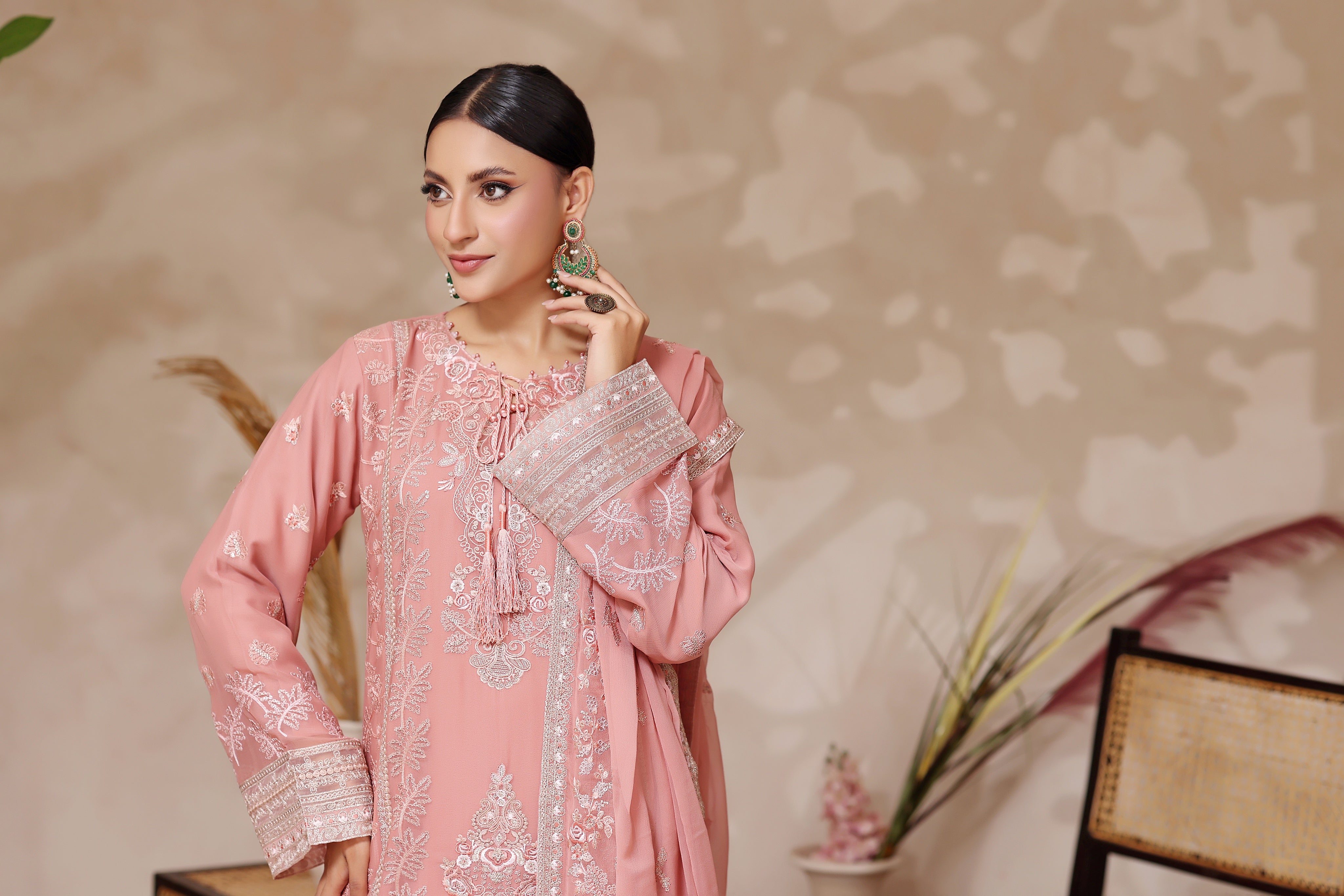 This Semi-Stitched three-piece set features a luxury embroidered Chickenkari chiffon shirt with intricate boring work, paired with a delicately embroidered chiffon dupatta and a dyed jacquard viscose trouser for a refined finish. Designed to celebrate feminine charm, FIZA brings comfort, creativity, and class together - allowing you to tailor your perfect fit while exuding effortless allure.
