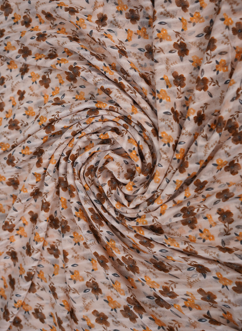Add a refreshing pop of color to your look with our Floral Printed Lawn Scarf, crafted from lightweight and breathable lawn fabric. Featuring a charming floral print in features a vibrant floral pattern on a peach-colored background. The design includes small pink, orange, and yellow flowers with green leaves and blue accents, creating a playful and charming look. The fabric is swirled into a spiral shape, showcasing its texture and pattern.