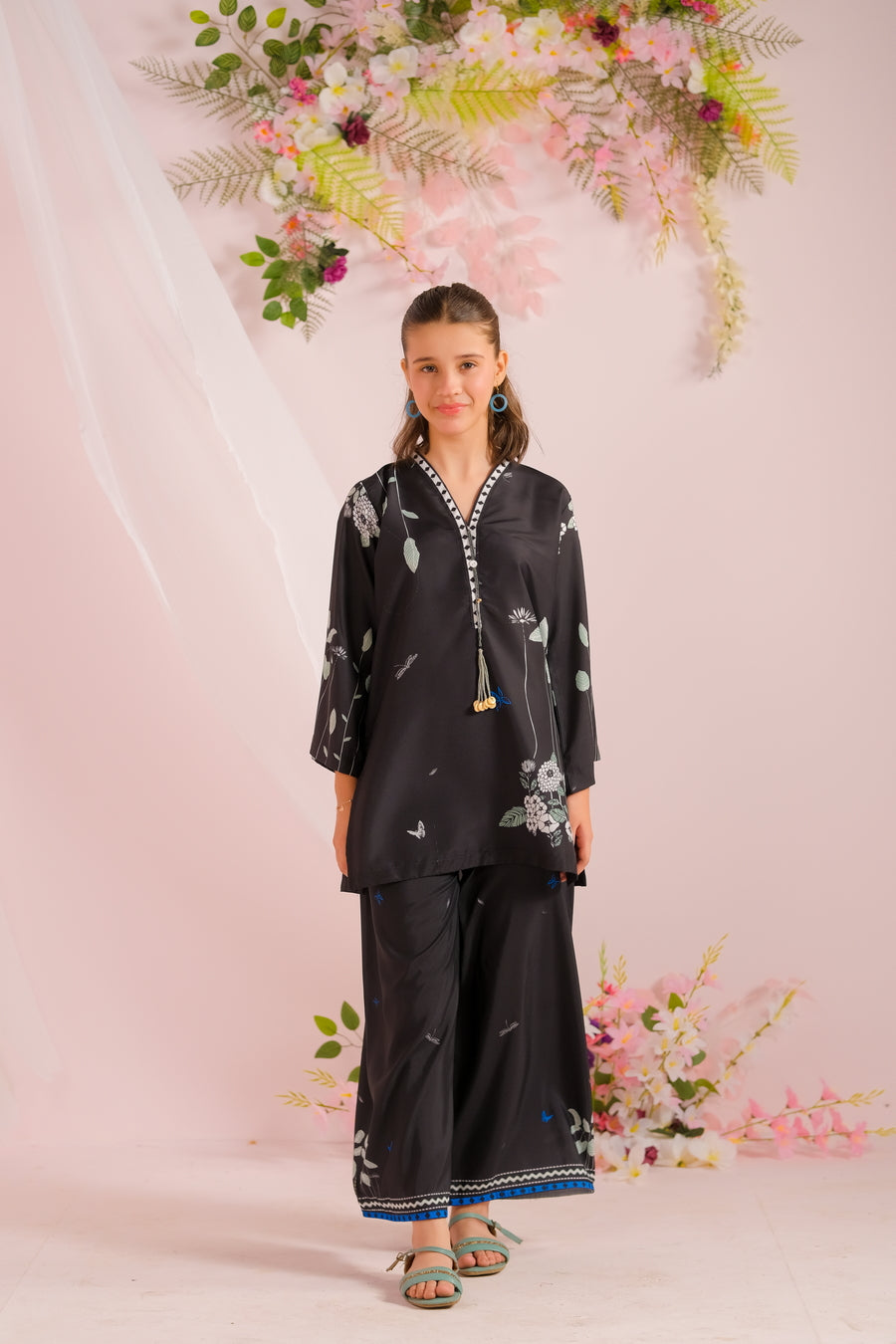 This trendy two-piece set exudes a stylish and modern flair for young fashionistas. Made from soft and breathable Poly Lawn fabric, it ensures comfort while keeping your little one looking chic. The set features a beautifully embroidered black tunic with delicate floral designs and a sleek V-neckline, paired with matching wide-leg trousers adorned with a colorful border detail. This ensemble is perfect for a day out or a special occasion, offering both elegance and ease of movement.