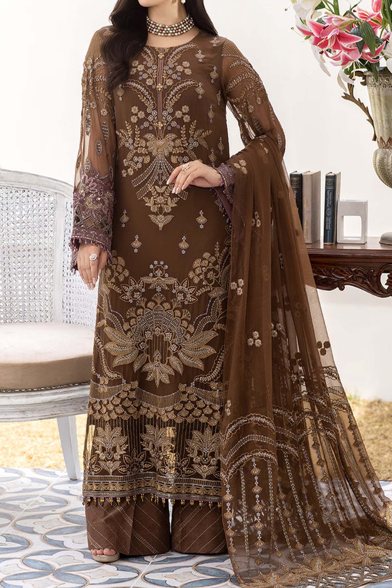 Embroidered Chiffon Front Embroidered Chiffon Back Embroidered Chiffon Sleeves Embroidered Chiffon Dupatta Embroidered Chiffon Pallu for Dupatta Embroidered Organza Border...