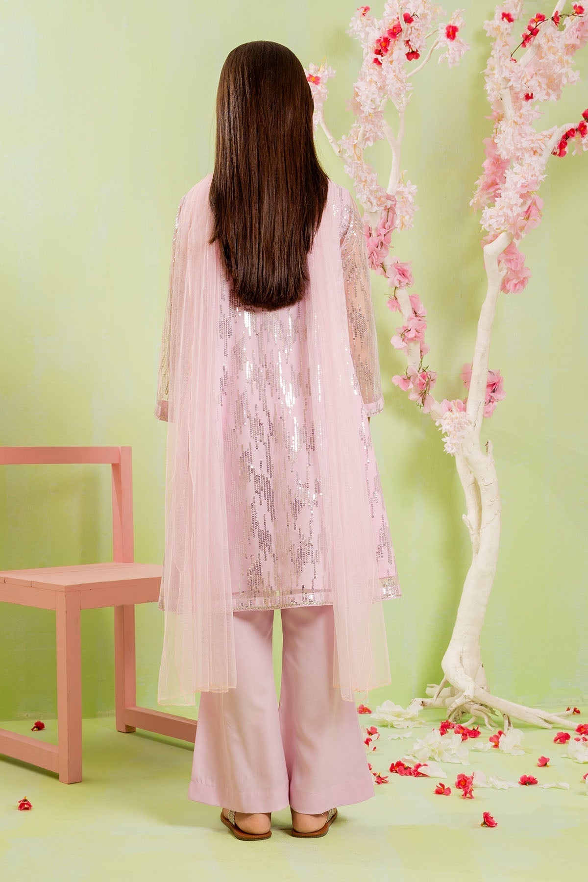 Top: Pink Sequence Embroidered Net Kurta With Malai Crepe Lining