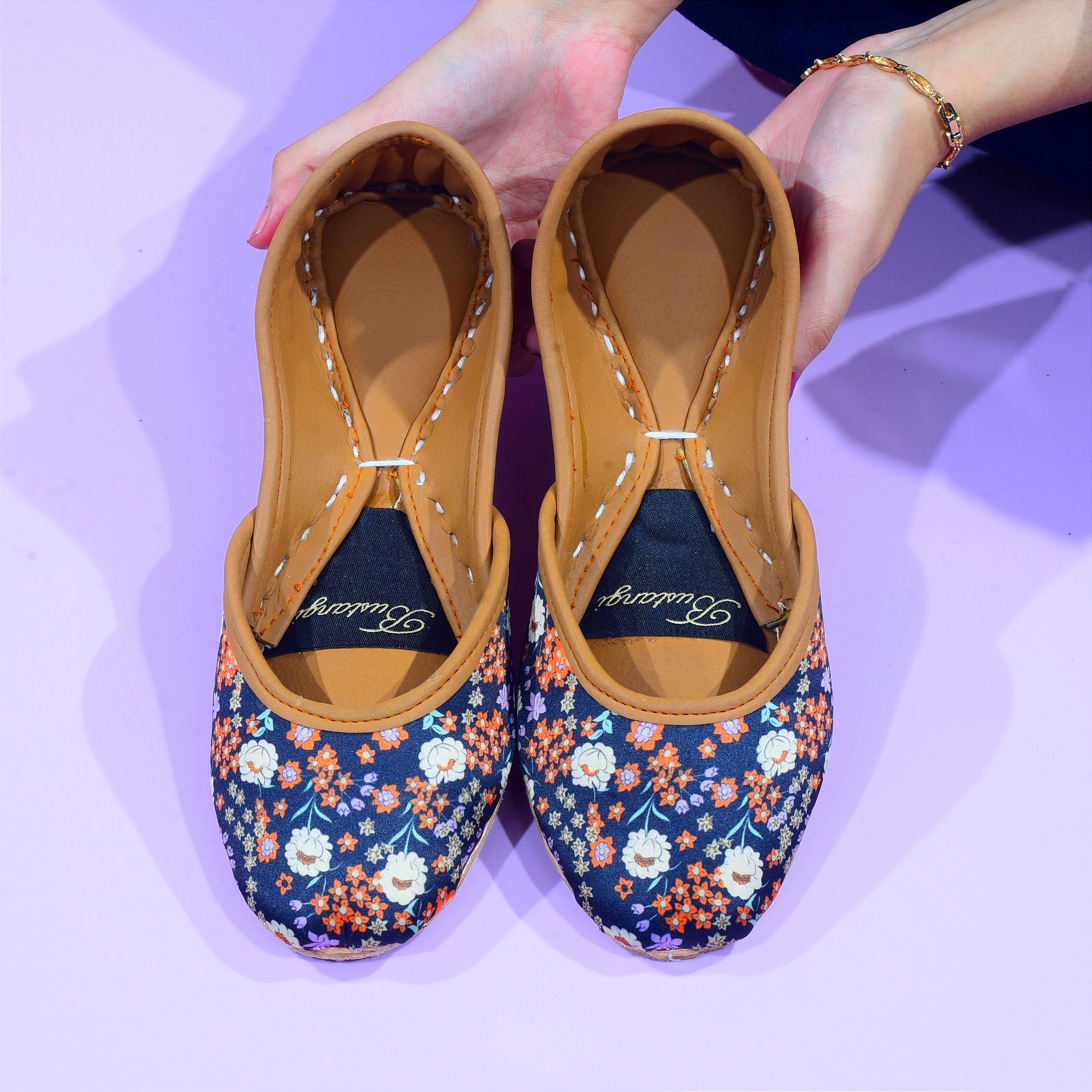 Bustangi's Freesia Casual Ladies khussa comes in black base with little orange flower print on top. These are flat ethnic footwear in casual style. Leather Sole and double padding is used for extra comfort. Necklines are also scalloped to avoid discomfort.
