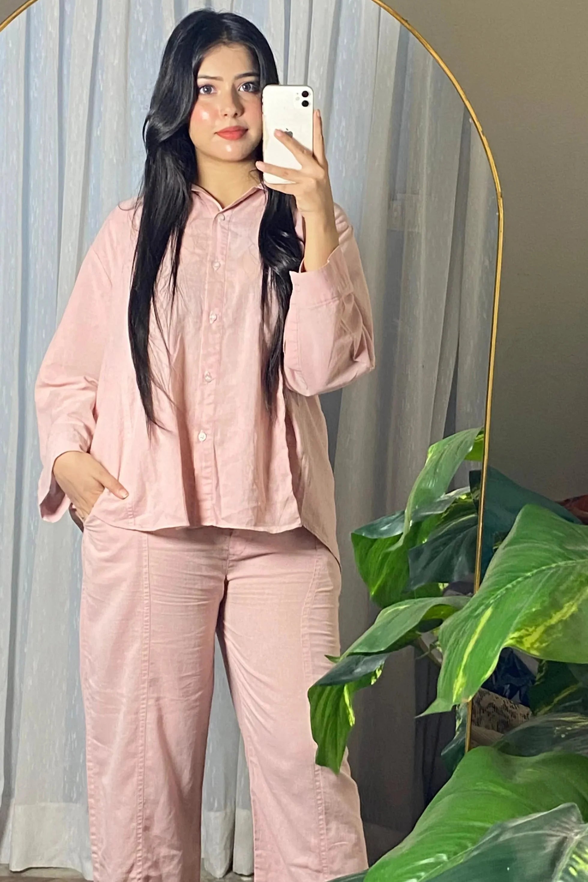 Stay effortlessly chic with this cotton 2-piece Co-Ord set, designed for ultimate comfort and style. This minimalist ensemble features a loose, button-down shirt with a soft collar and matching trousers – all made from high-quality breathable cotton.