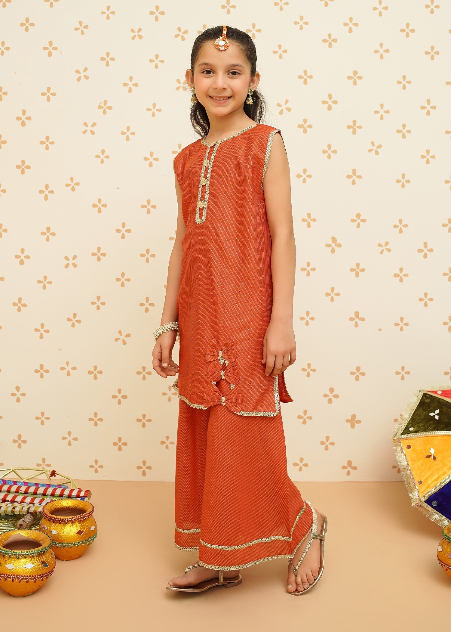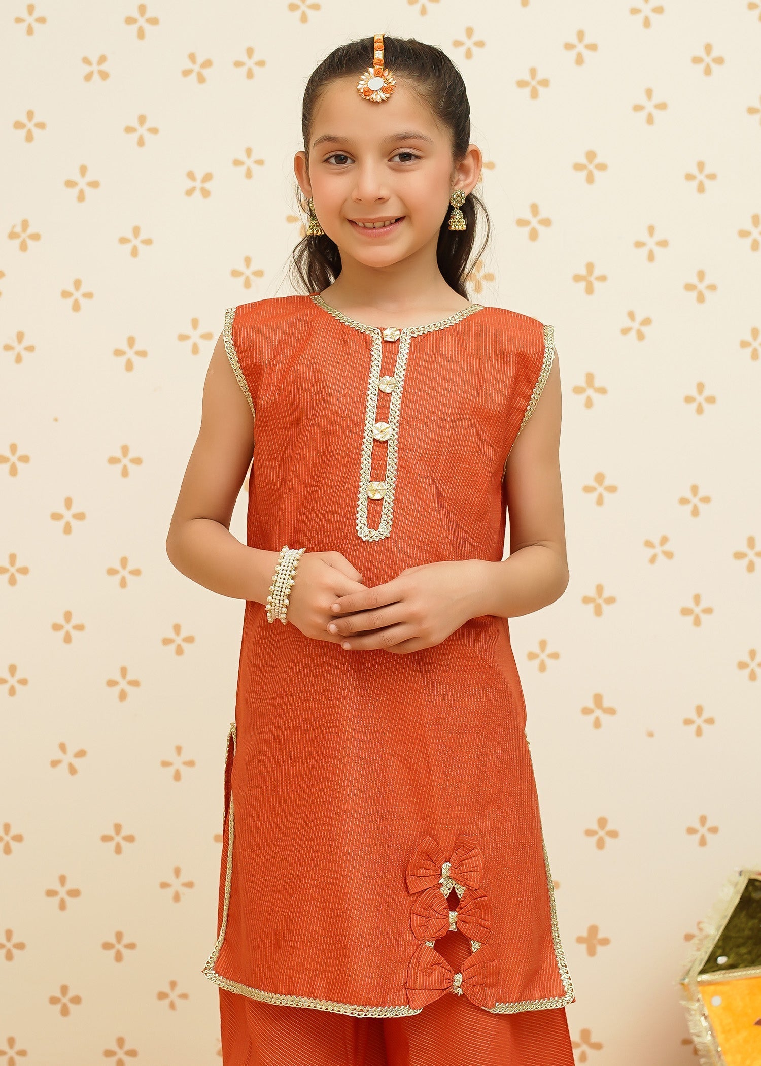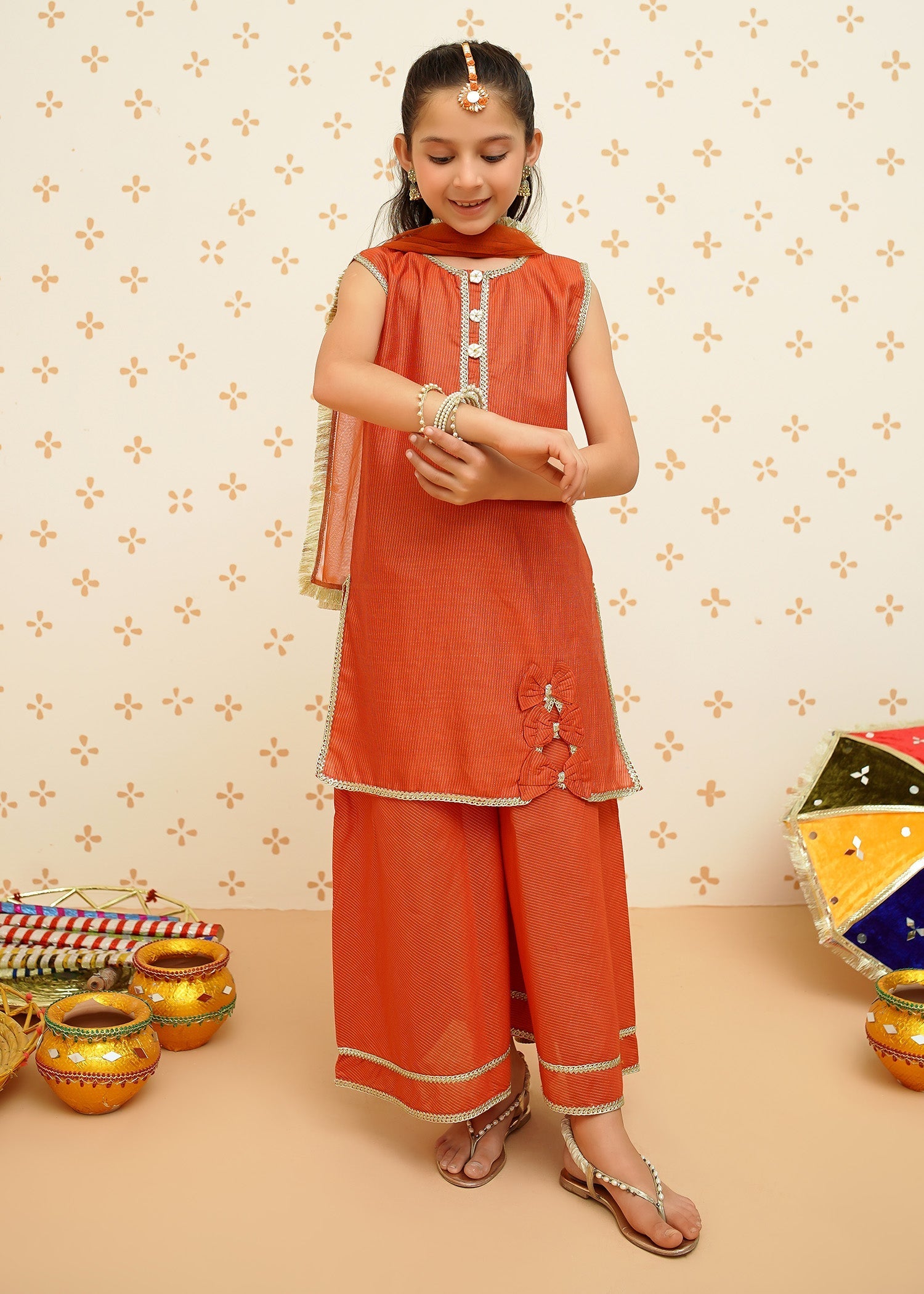Let your little one shine in this vibrant rust orange 3-piece outfit, crafted for festive occasions!