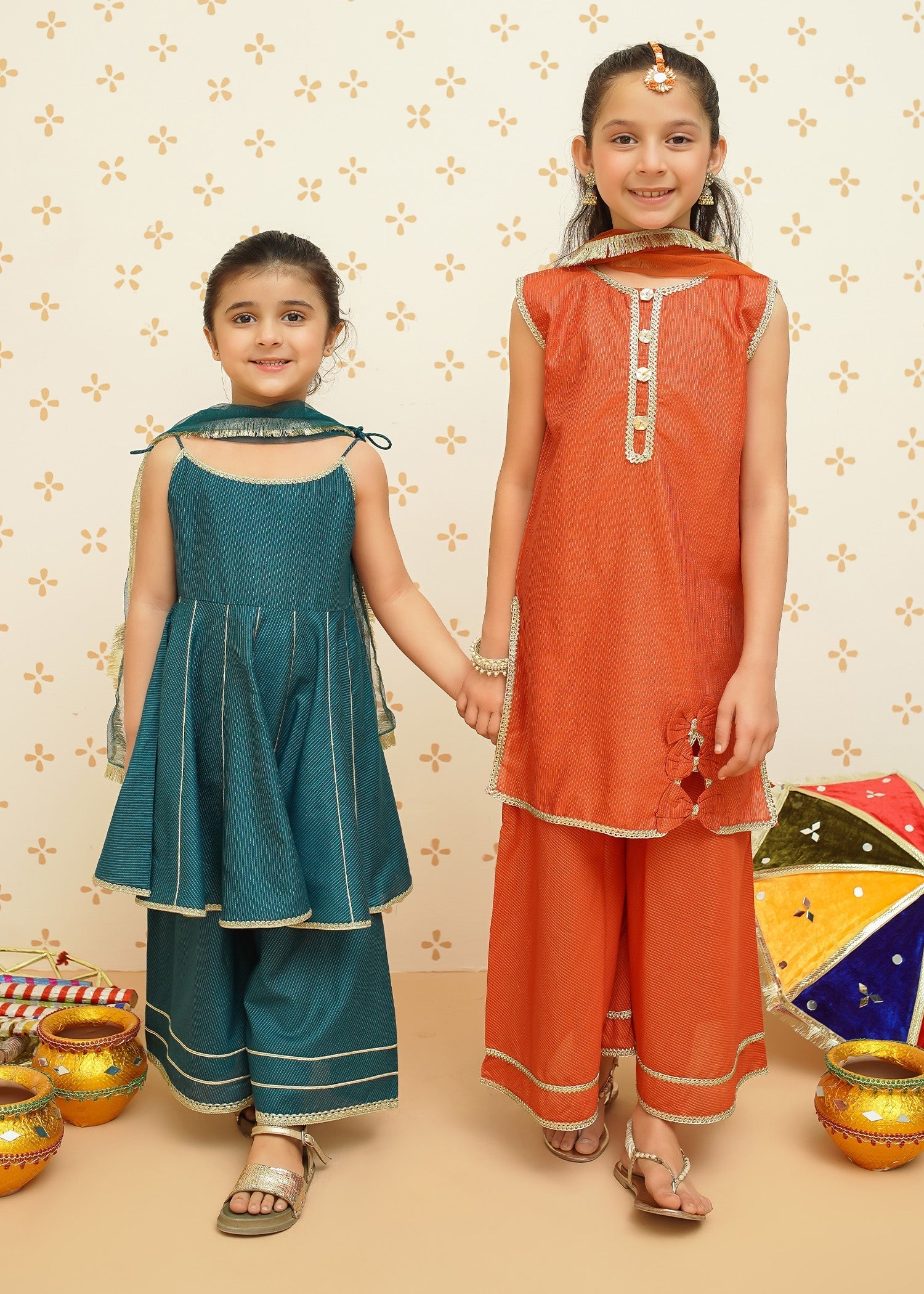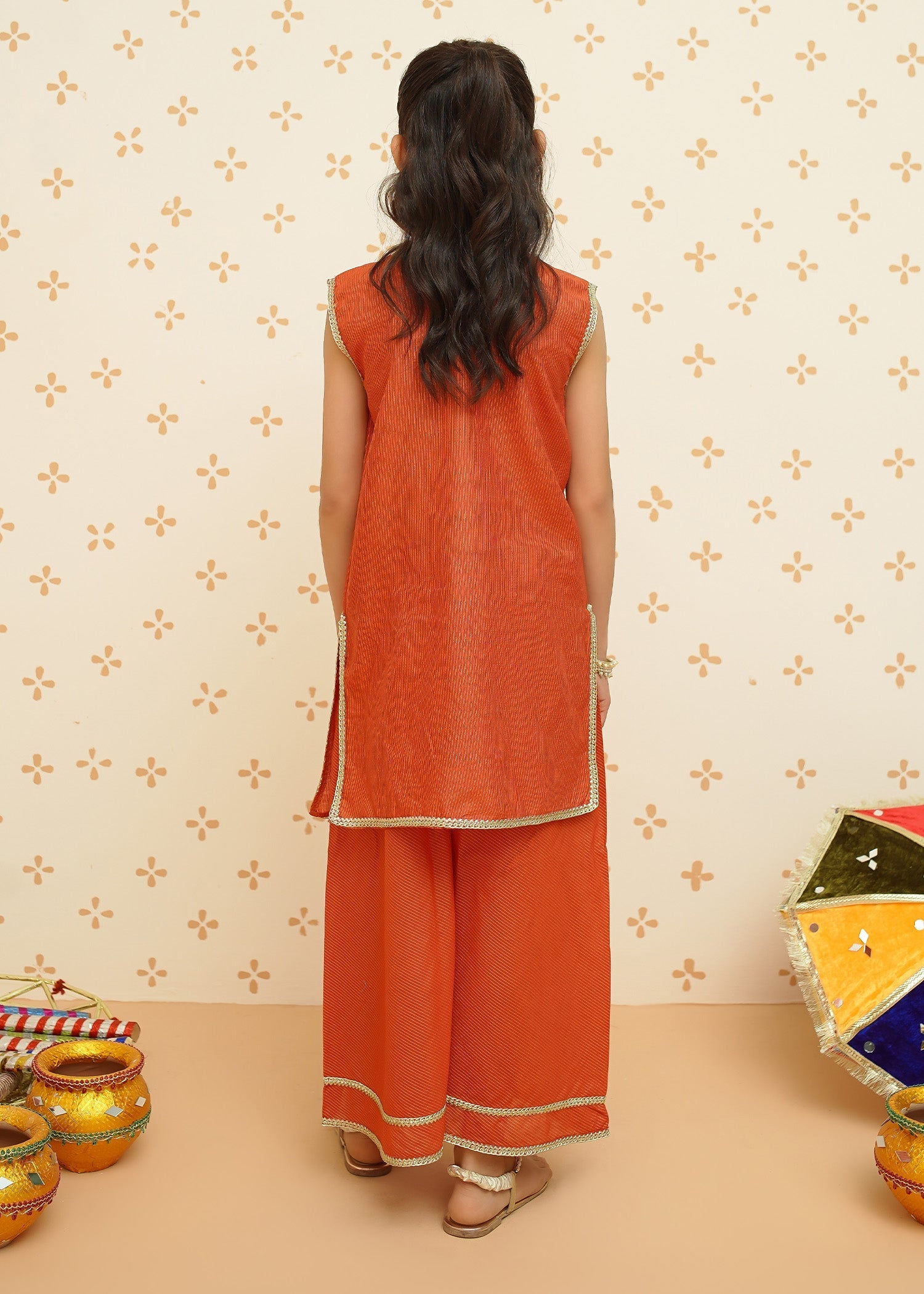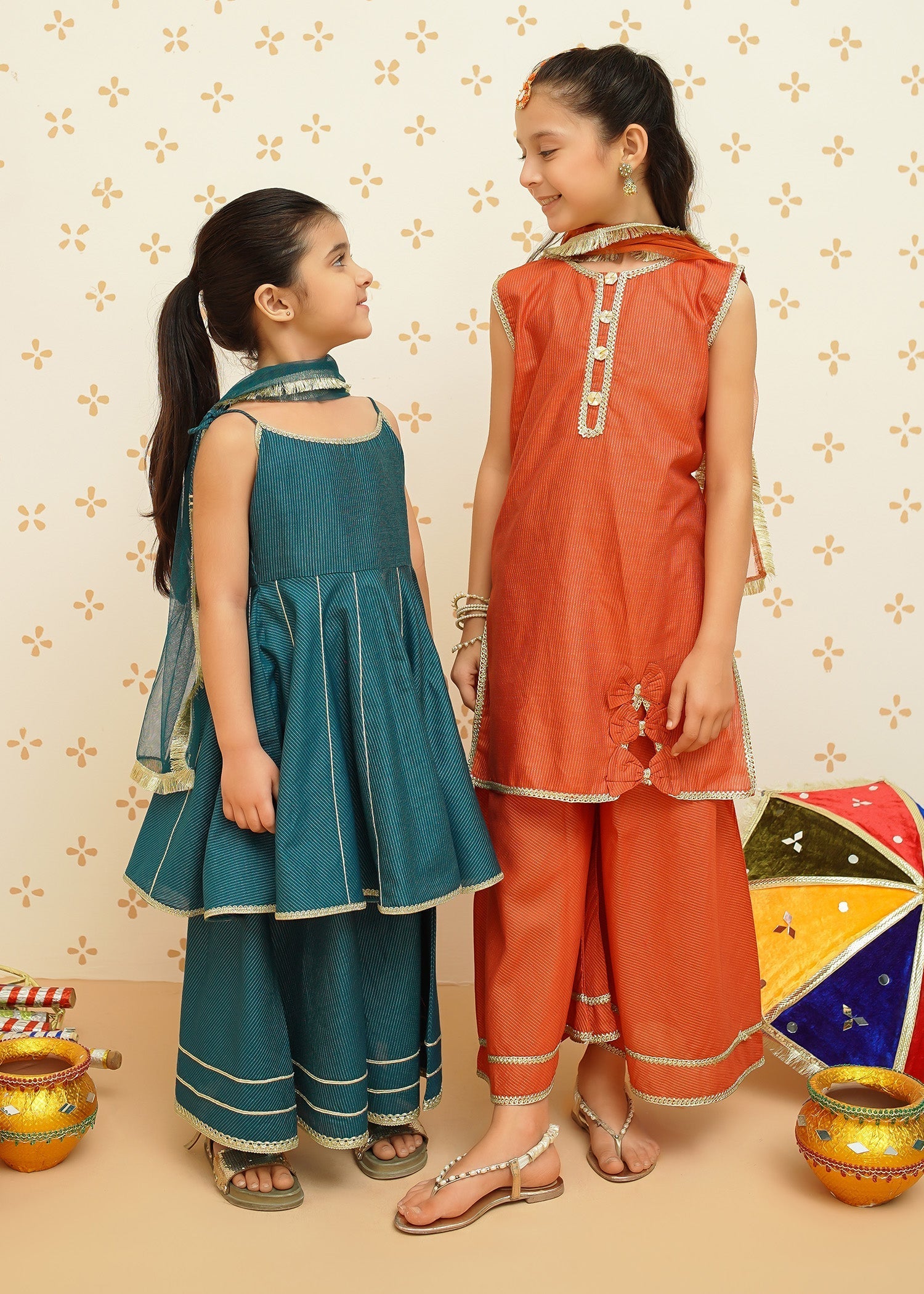 Let your little one shine in this vibrant rust orange 3-piece outfit, crafted for festive occasions!