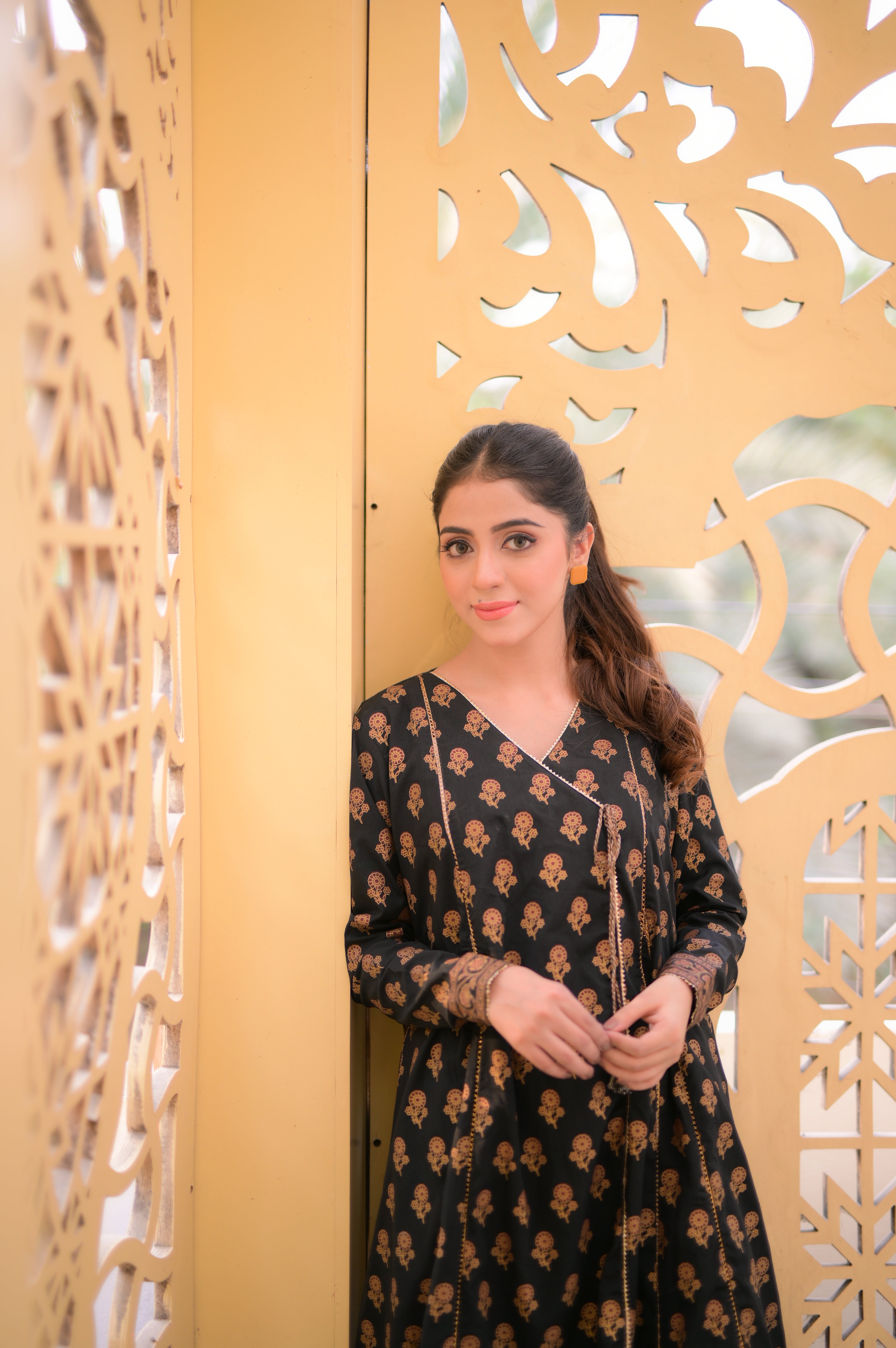 Stand out with this black angrakha-style dress with beautiful golden prints. The loose and comfortable design makes it perfect for special occasions and evening wear. Simple details add a touch of charm to your look.
