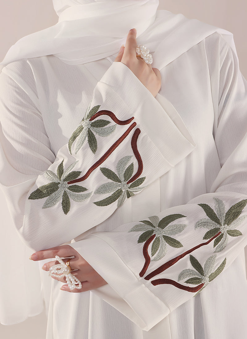 Elevate your modest style with Hijab Ul Hareem?s Front Open Embroidered Abaya, crafted from premium Zoon fabric for a soft, elegant drape. Beautiful floral embroidery on the sleeves adds charm and sophistication to your look. Perfect for every graceful occasion.