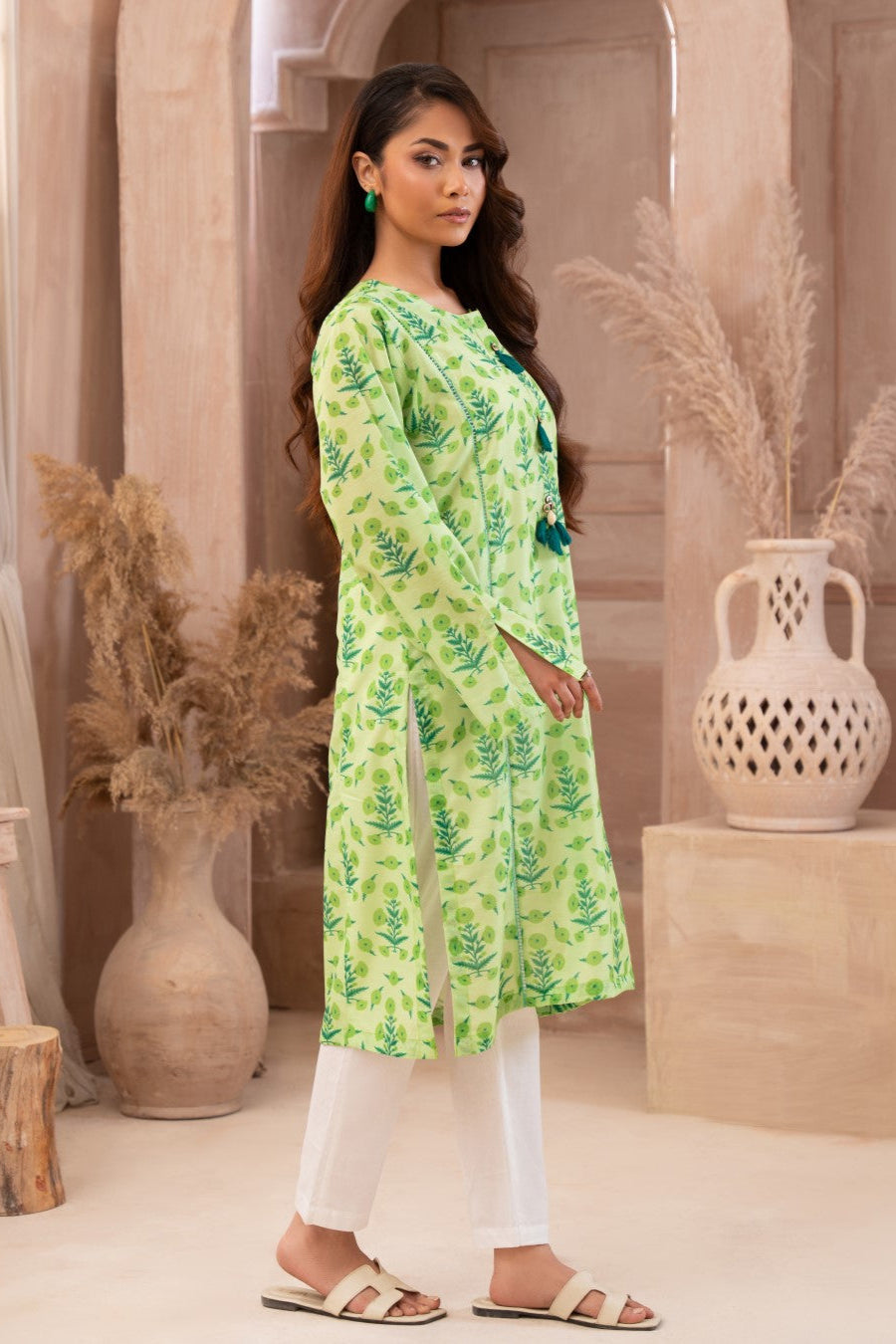 Green Cluster this elegant printed suit is perfect for the pleasant season coming ahead. Digital printed lawn shirt featuring a round neck with stylish buttons, straight hemline and straight sleeves. These are paired with a plain trouser.