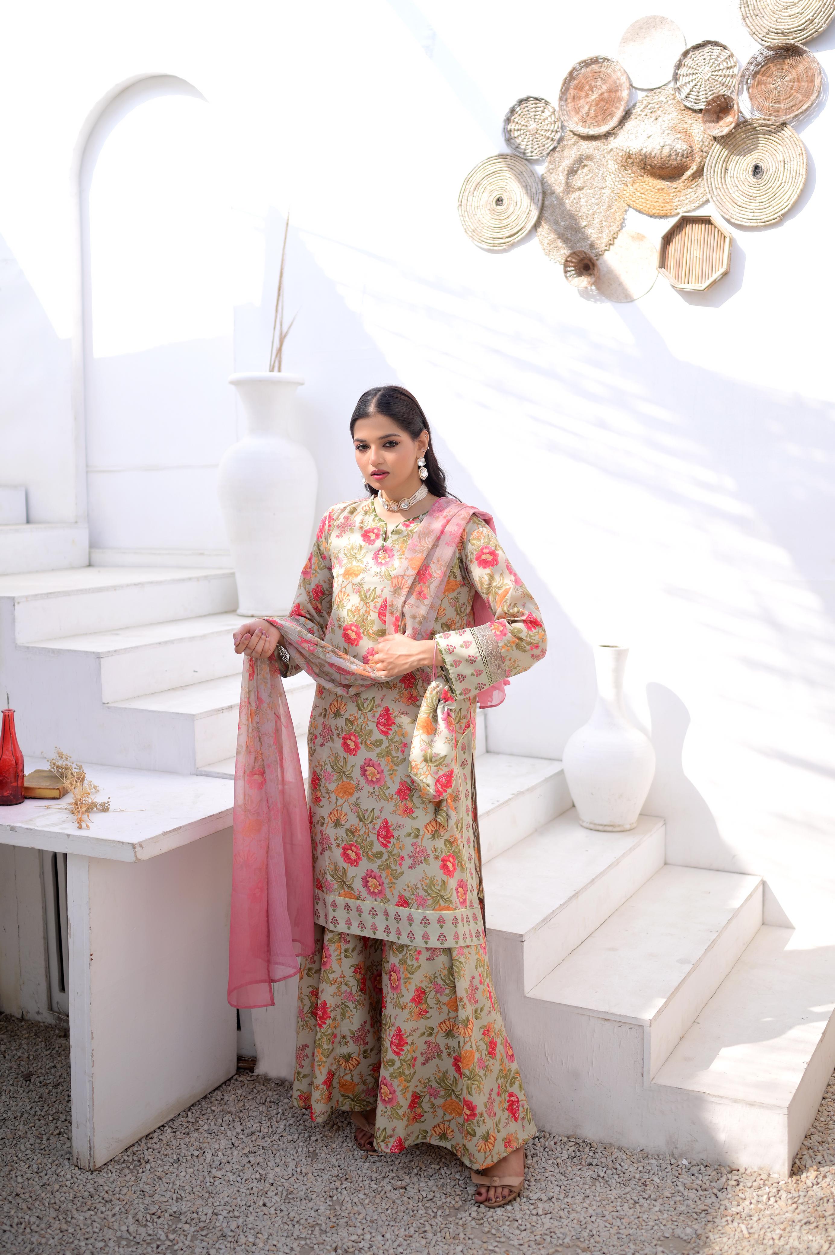 3 piece stitched dhaka Shirt has neckline detailing with border and lace attachment Dupatta is monochrome chiffon