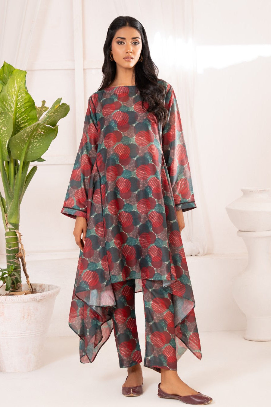 Green & Red polka abstract article is a digital Printed Co-ord. This design has a printed drop shirt, round neck and straight sleeves with drop corners. This is paired with straight pants.