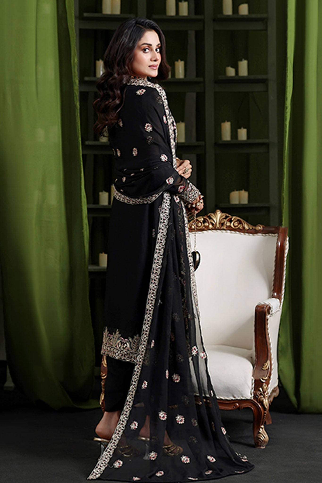 Shirt front: Embroidered chiffon Shirt back: Embroidered/plain chiffon Sleeves: Embroidered chiffon Dupatta: Embroidered chiffon Trouser: Dyed rawsilk Addons: Embroidered front...