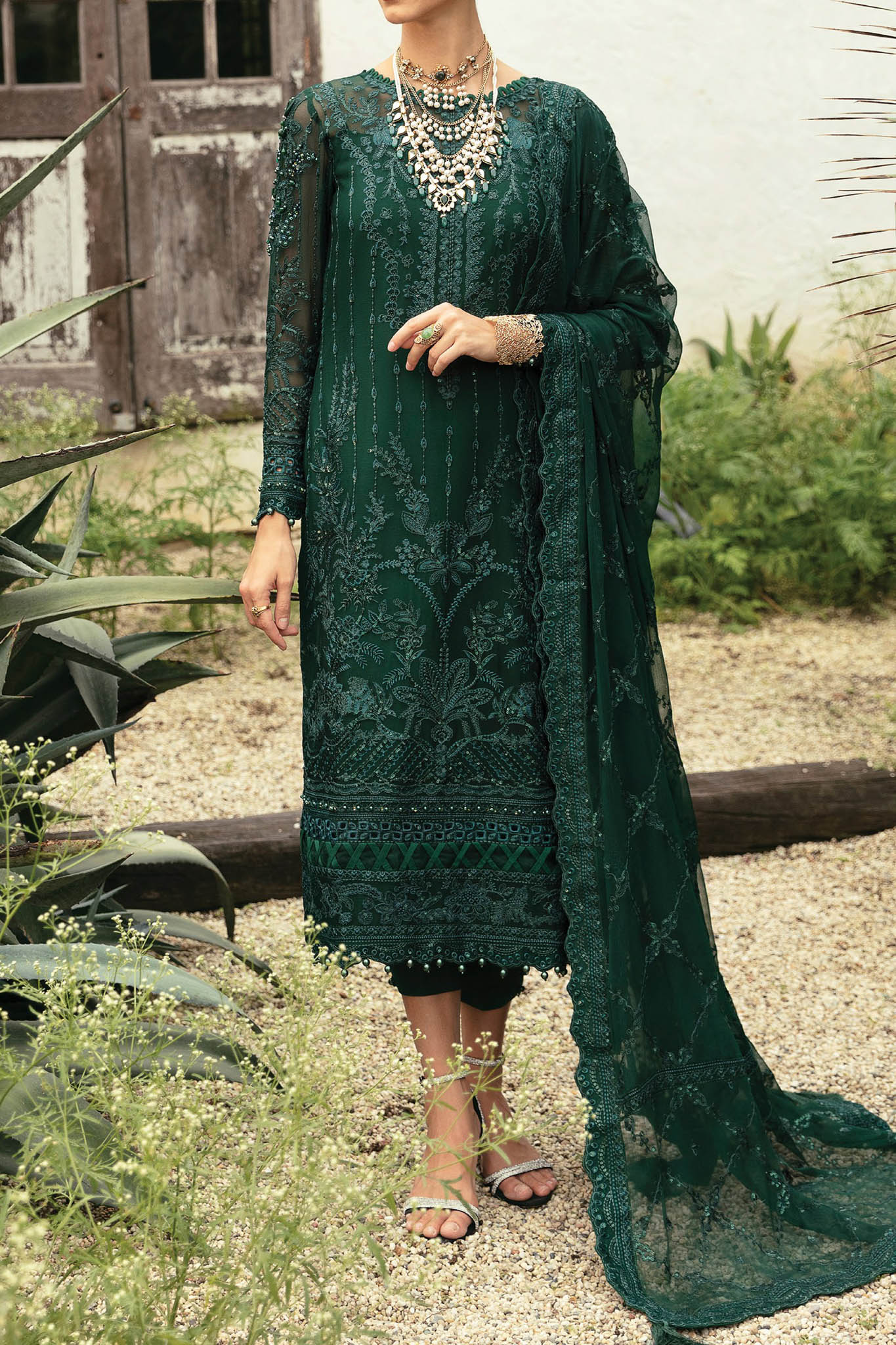 Embroidered & sequinned chiffon front Embroidered & sequinned chiffon side panel for front Linear-embroidered + sequinned chiffon back Embroidered &...