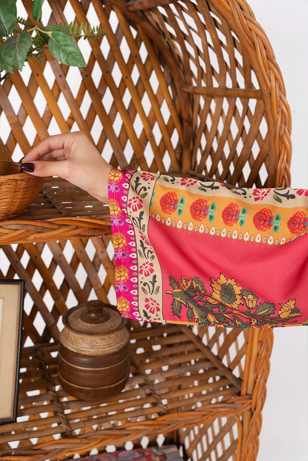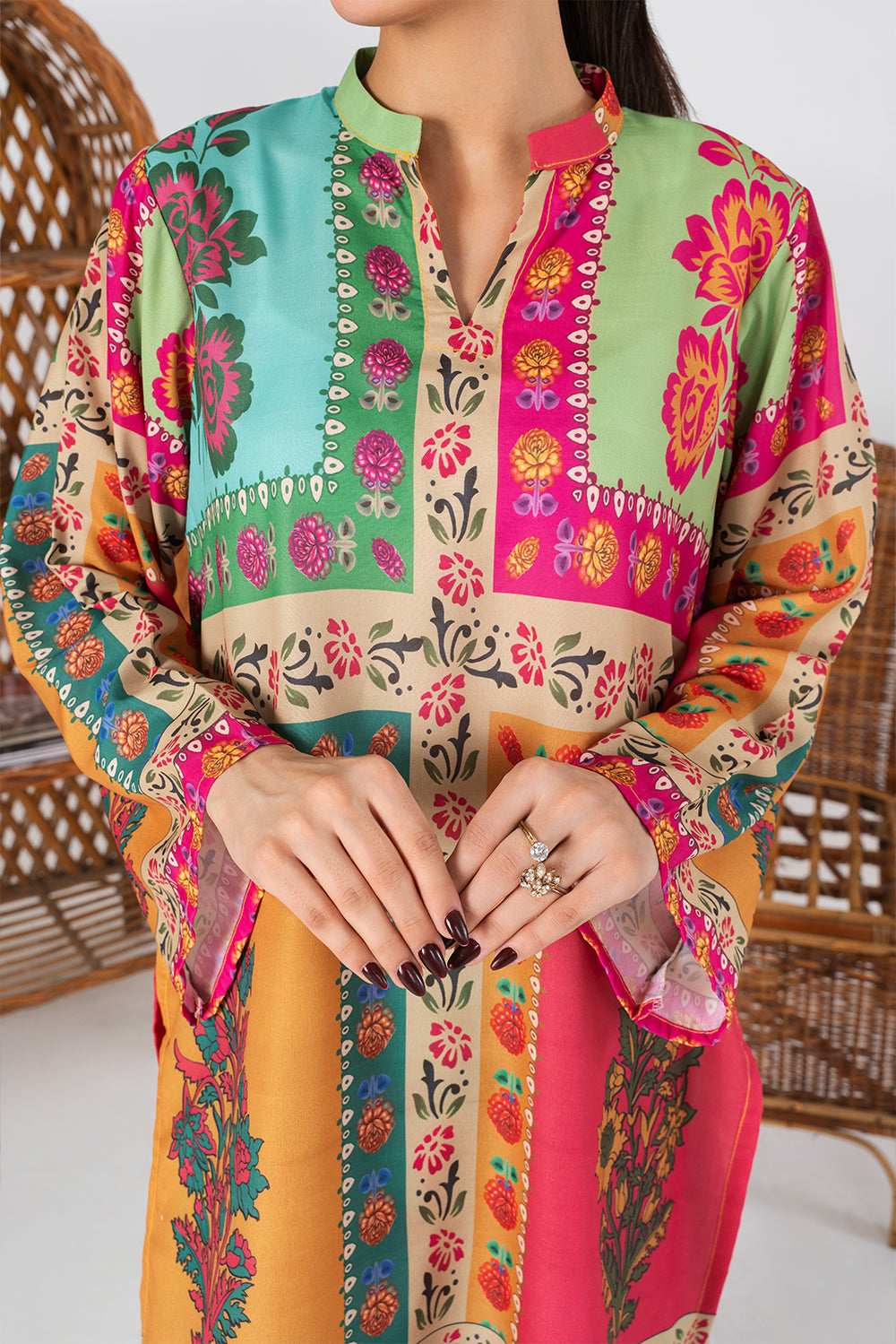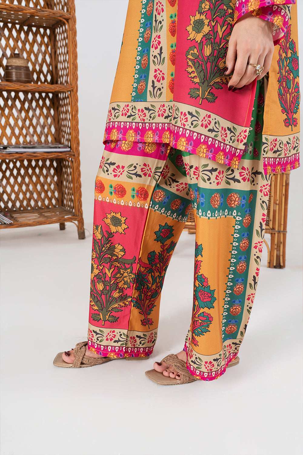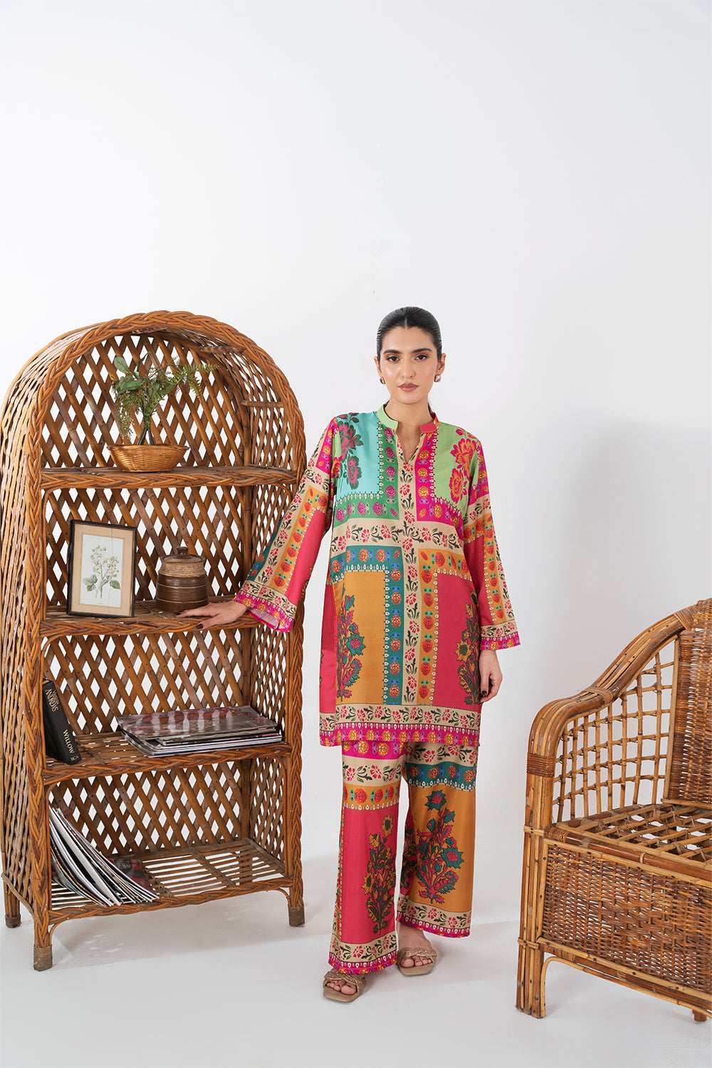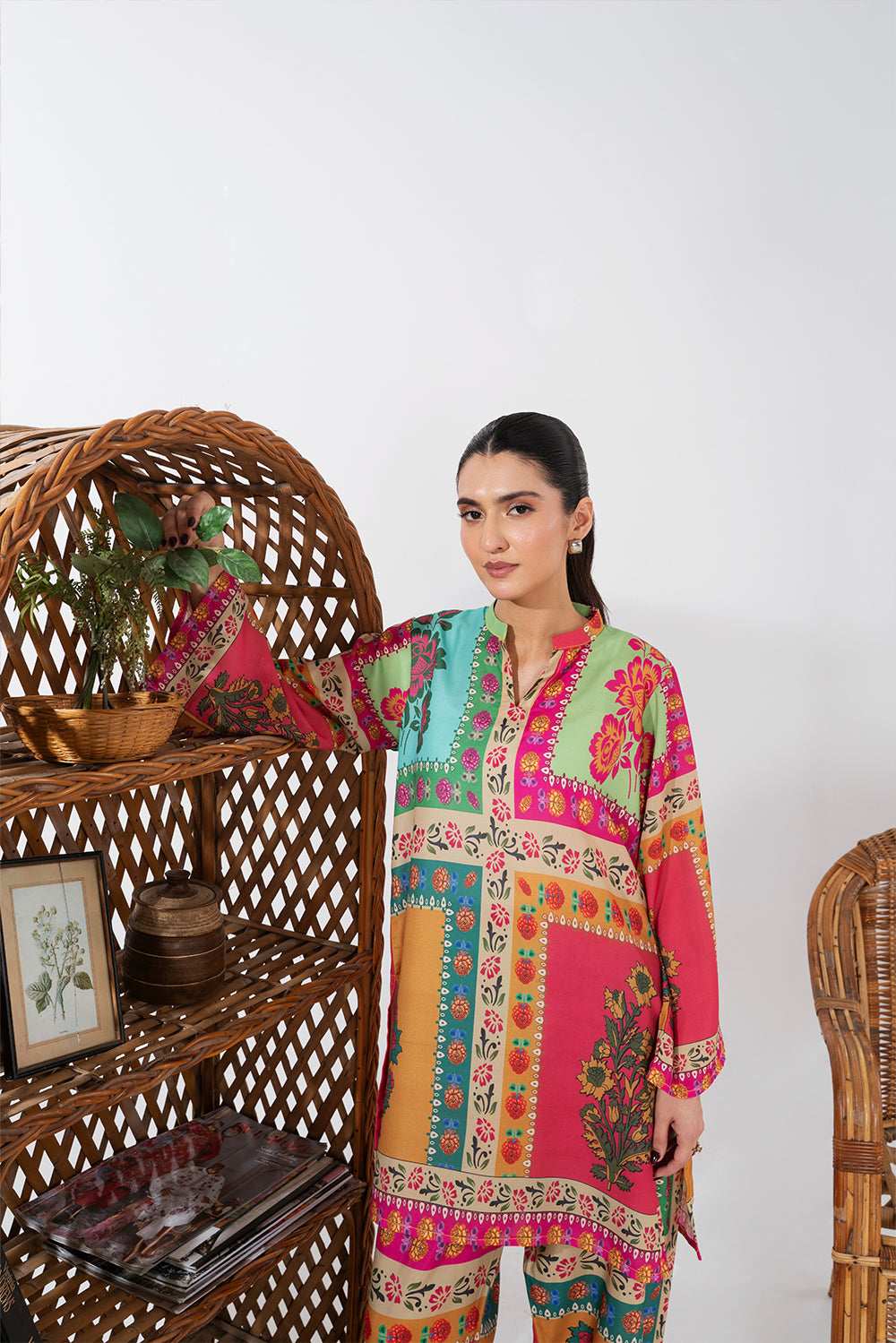 This vibrant two-piece outfit features a beautifully printed kurta and matching trousers. The kurta showcases a striking patchwork-inspired design with bold floral motifs in shades of pink, turquoise, mustard, and green. It has a straight cut with a round neckline and a slit, finished with a detailed printed border along the hem and sleeves.