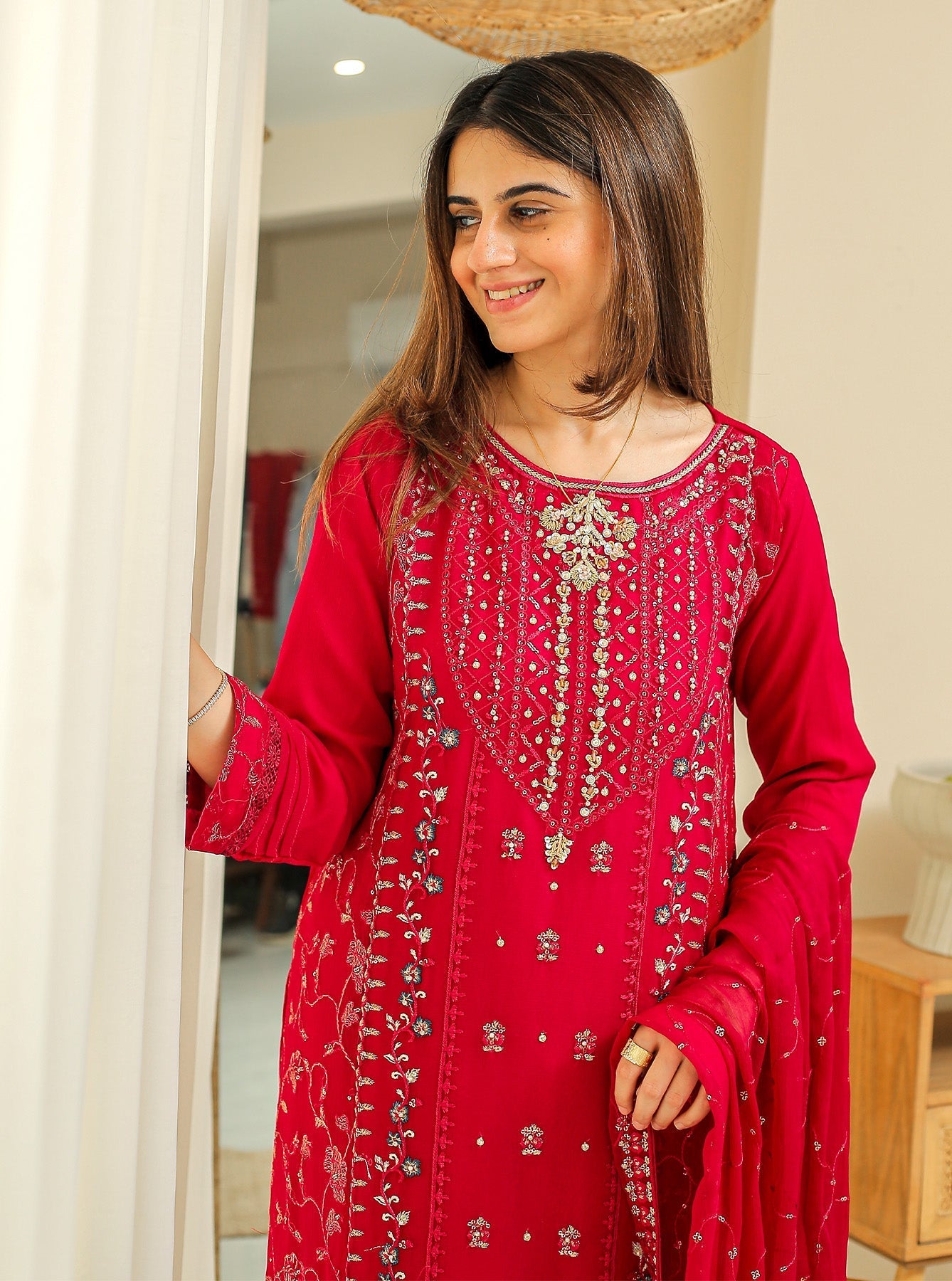 Introducing our elegant embroidered chiffon shirt with matching pants, designed for those who value intricate detailing and timeless elegance. Made from premium fabric, this dress provides a light, luxurious feel, ensuring comfort and sophistication all day long. The set includes matching pants and a dupatta, enhancing the overall look and adding a touch of glamour to your outfit.