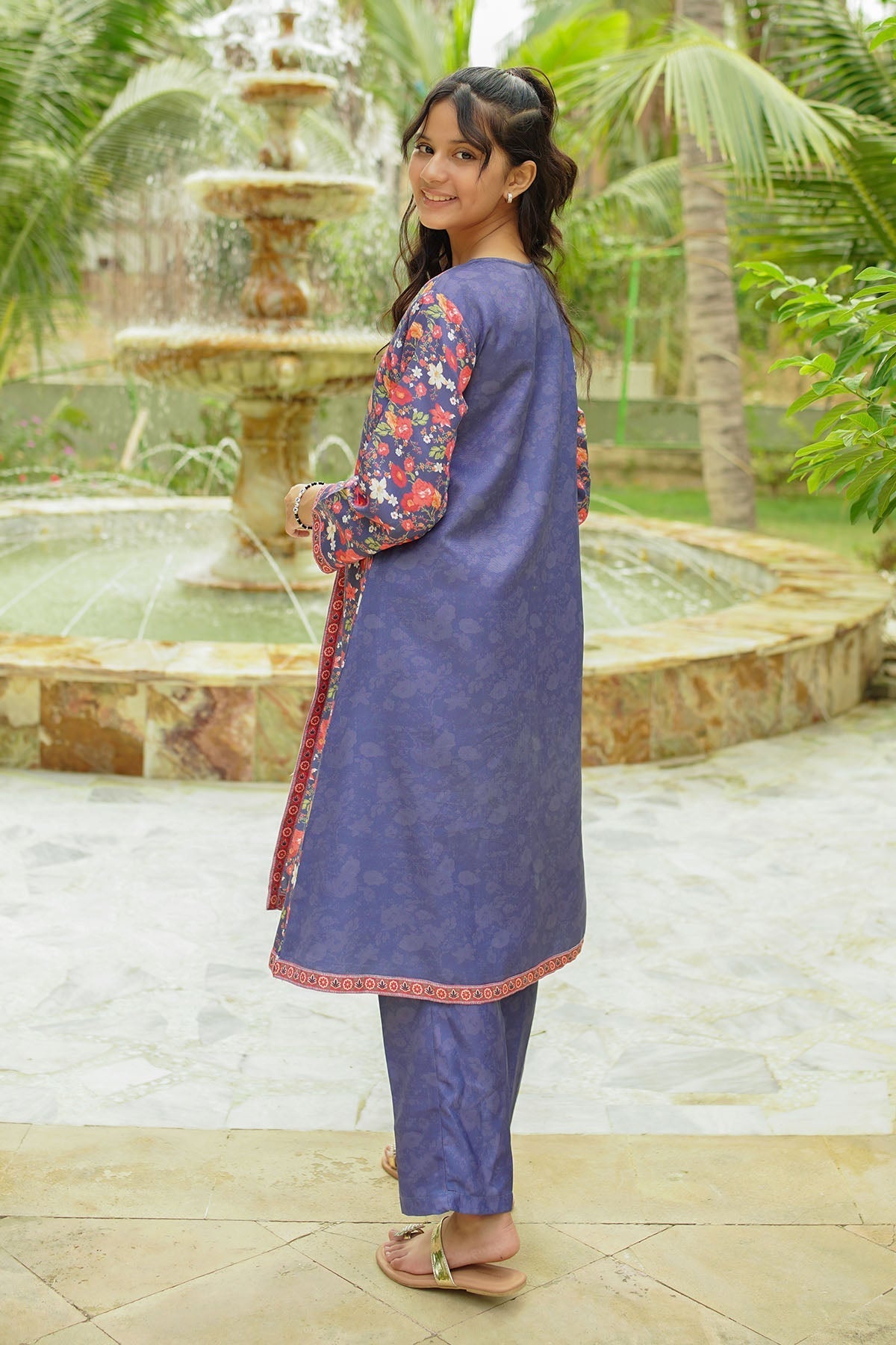 Top: Blue Herringbone Digital Printed Coat Style KurtaBottom: Blue Herringbone Digital Printed Trouser