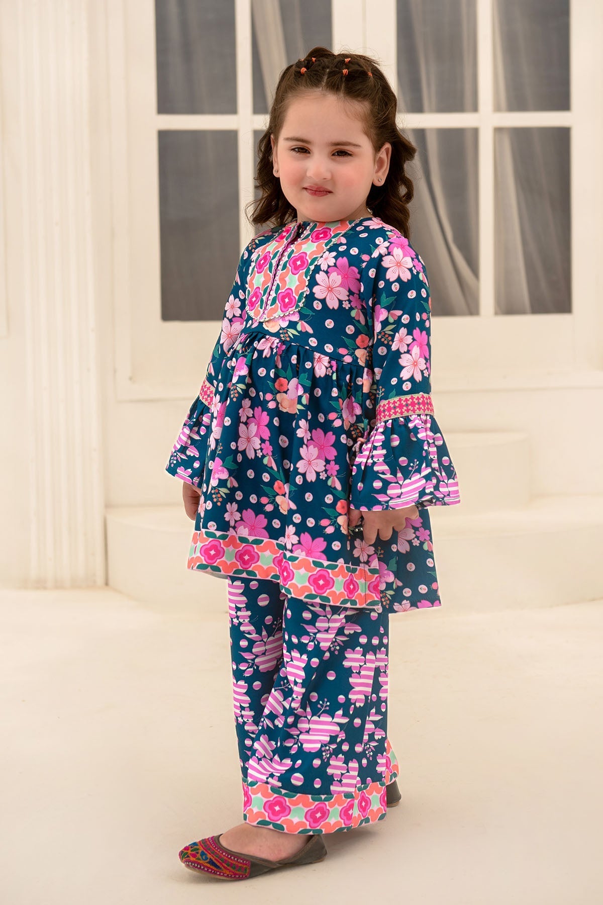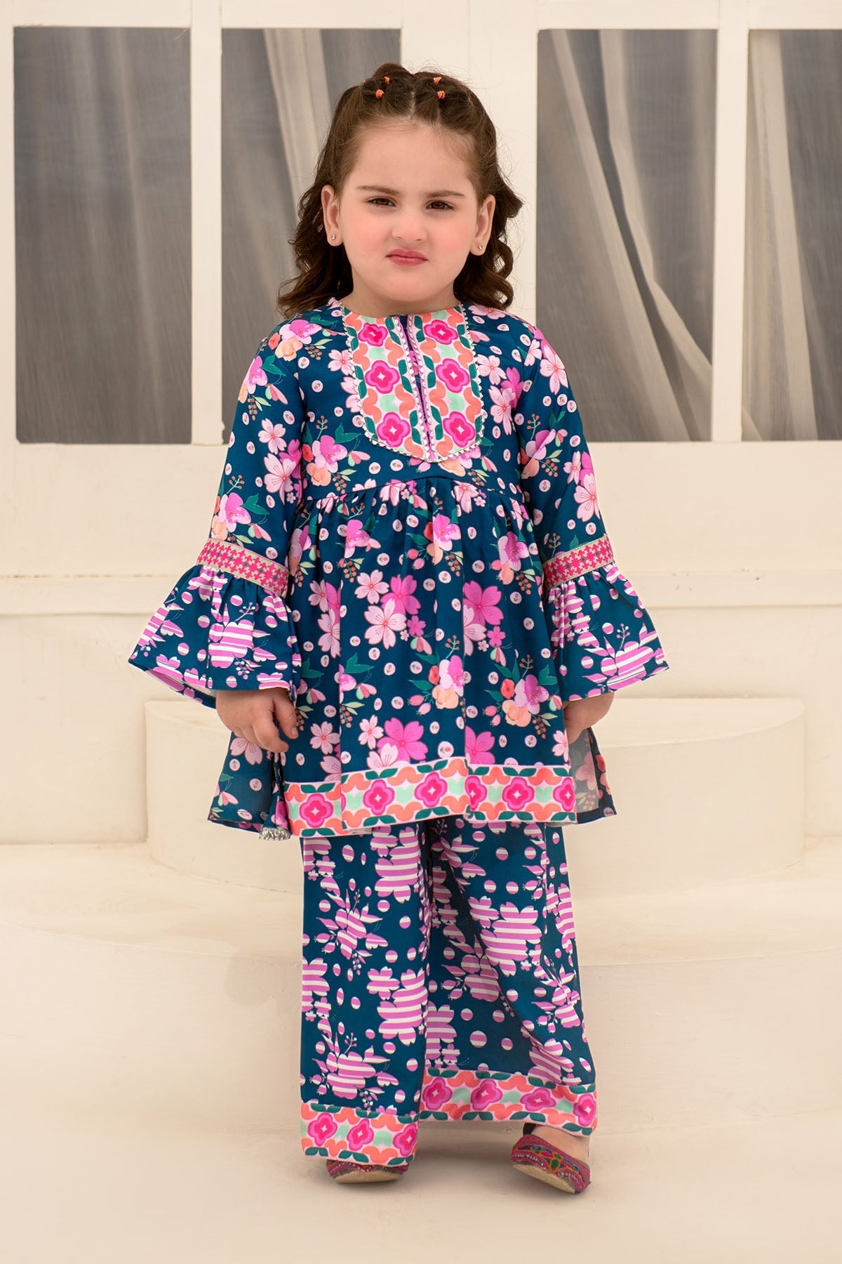 "Top: Teal Blue Herringbone Digital Printed KurtaBottom: Teal Blue Herringbone Digital Printed Trouser"