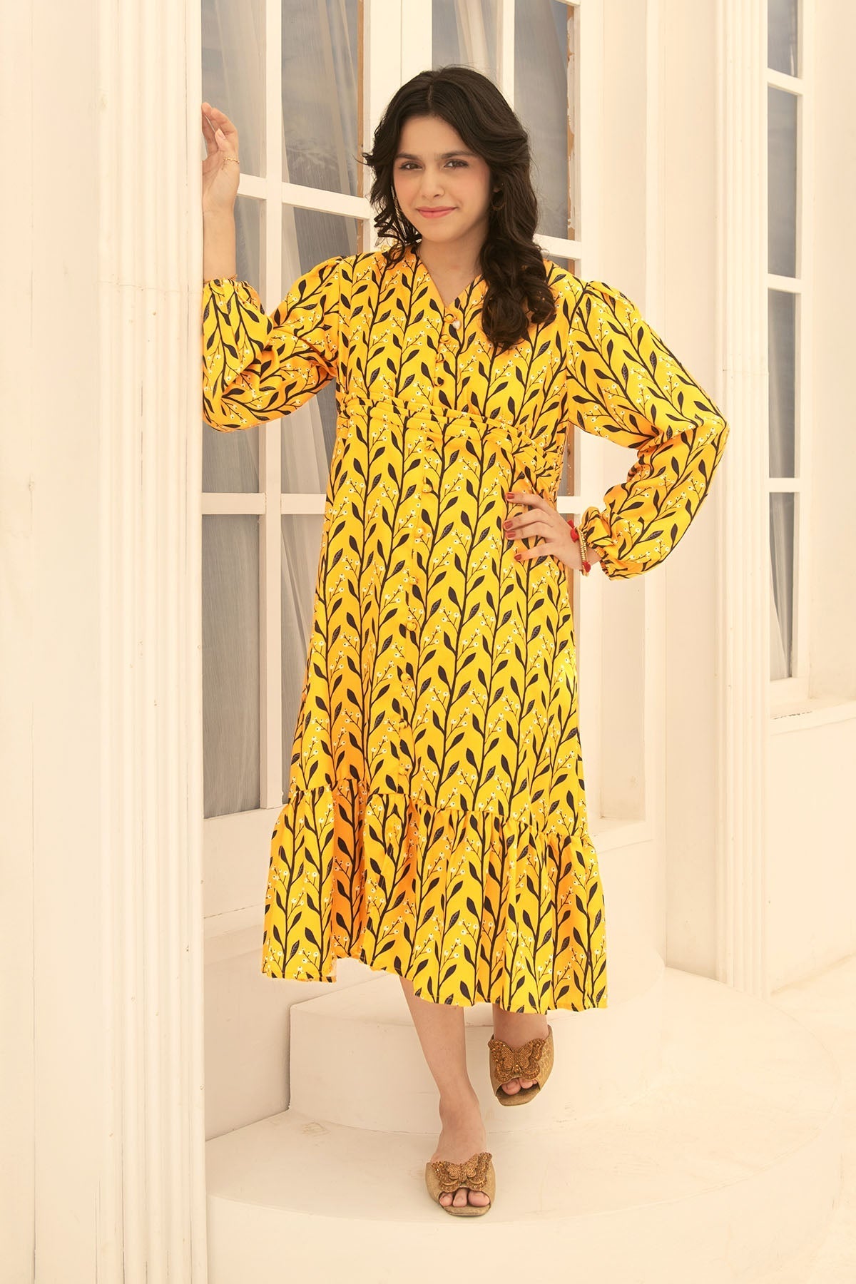 Top: Mustard Yellow Herringbone Digital Printed Dress