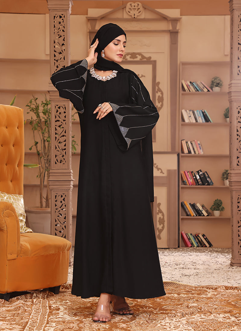 Note: If customer changes the Abaya color rather than choosing the same color given in the picture, Embroidery and stones color will be change of same or contras color depends on the design of the Abaya. Any printed fabric placed on the Abaya would be change at the time of order if not available in Stock.