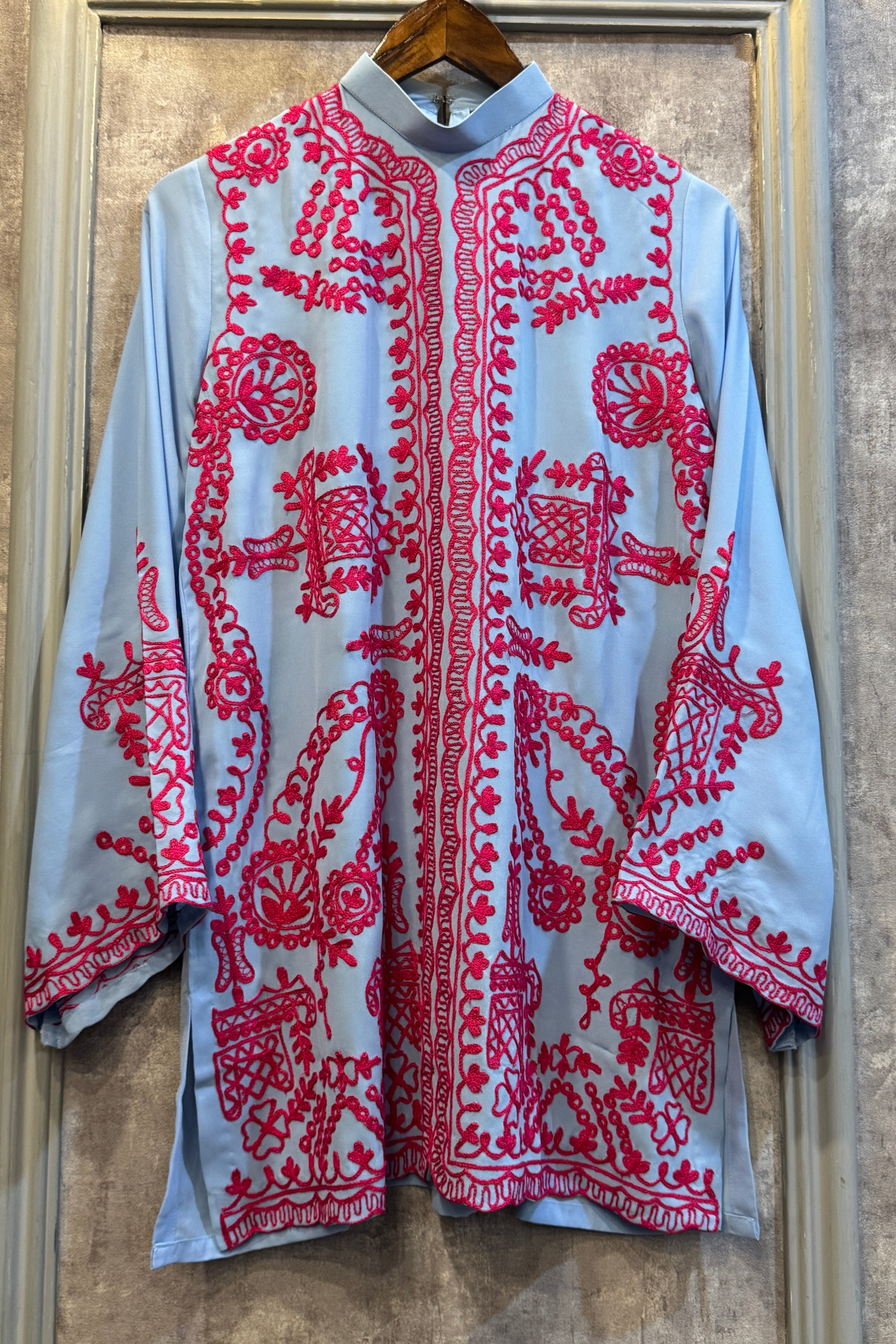 Beautiful fusion of colour, embroidery on long shirt with plain pantsÂ