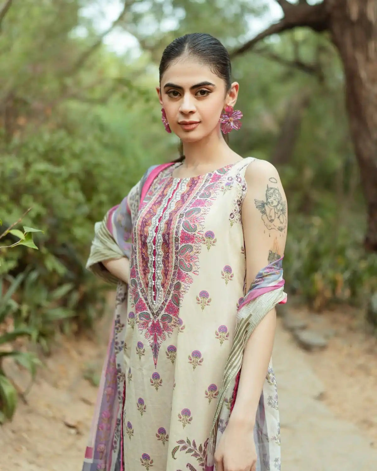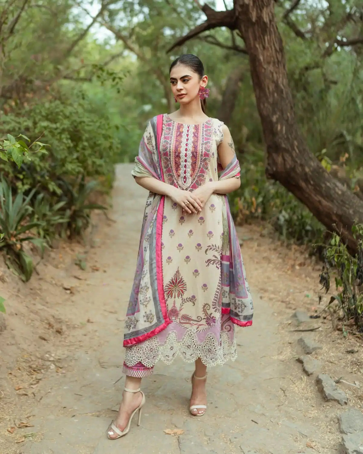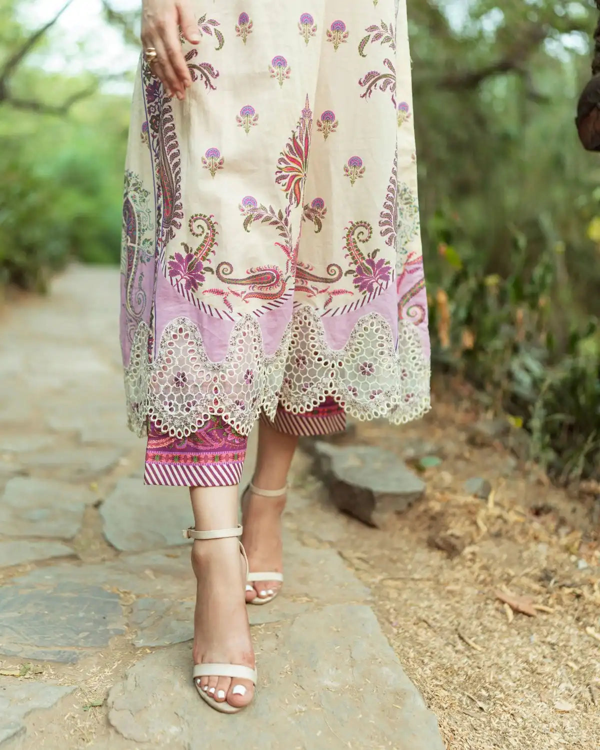 This soft ivory lawn dress features delicate floral motifs in lavender, plum, and rose pink, paired with a Mughal-inspired embroidered neckline. A fuchsia-accented chiffon dupatta adds festive charm, while an embroidered organza hem patch lends a touch of vintage elegance. Romantic, feminine, and perfect for summer.