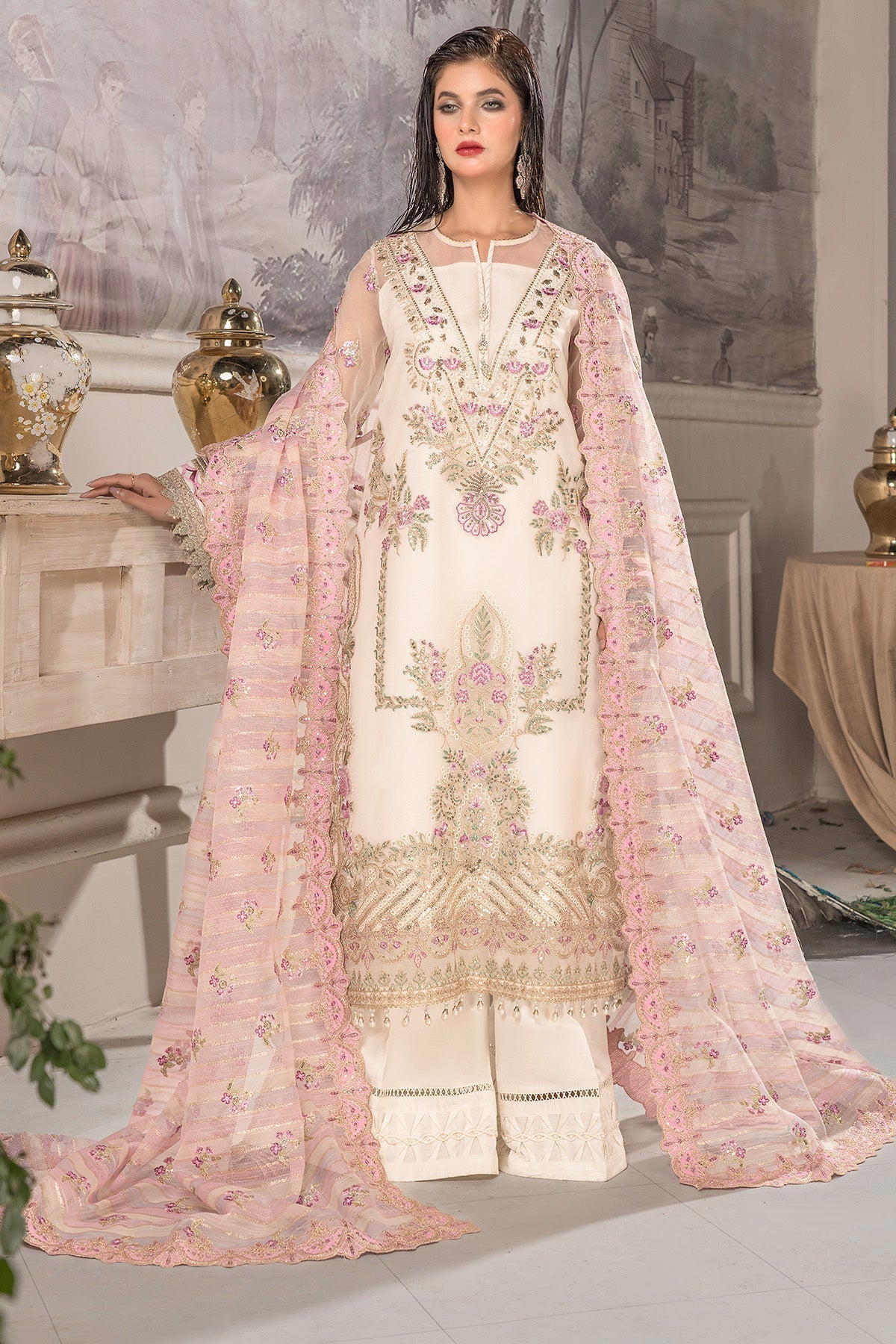 Embroidered Organza Shirt With Resham Katan LiningEmbroidered Masoori Net DupattaEmbroidered Raw Silk Trousers
